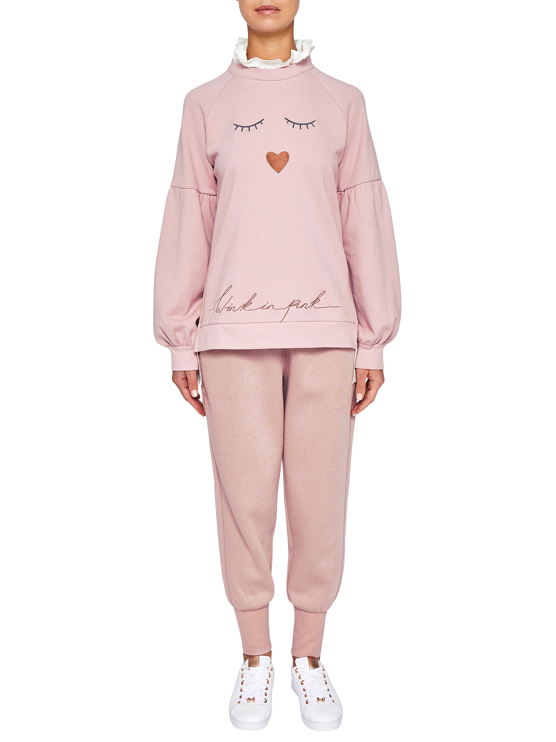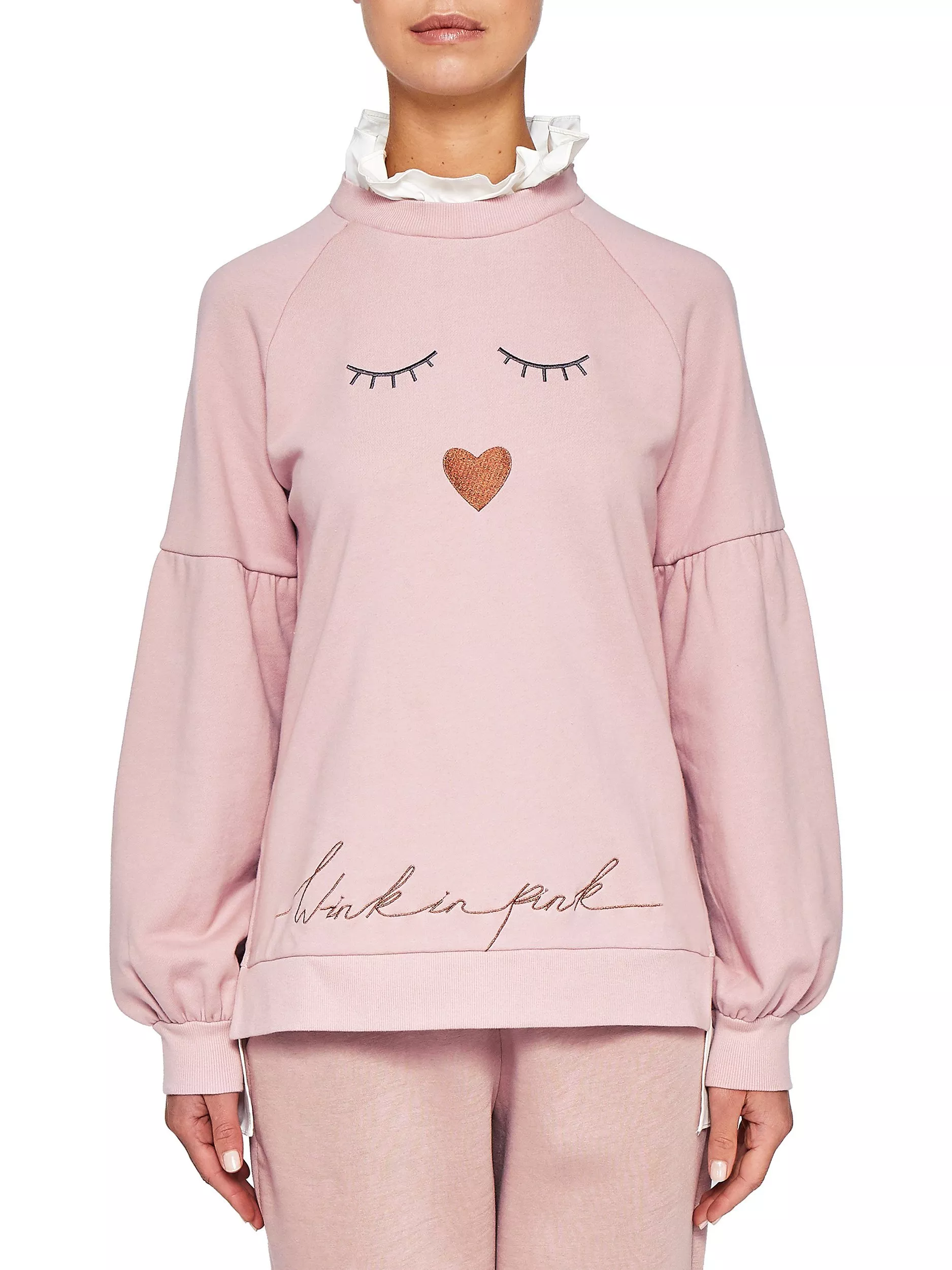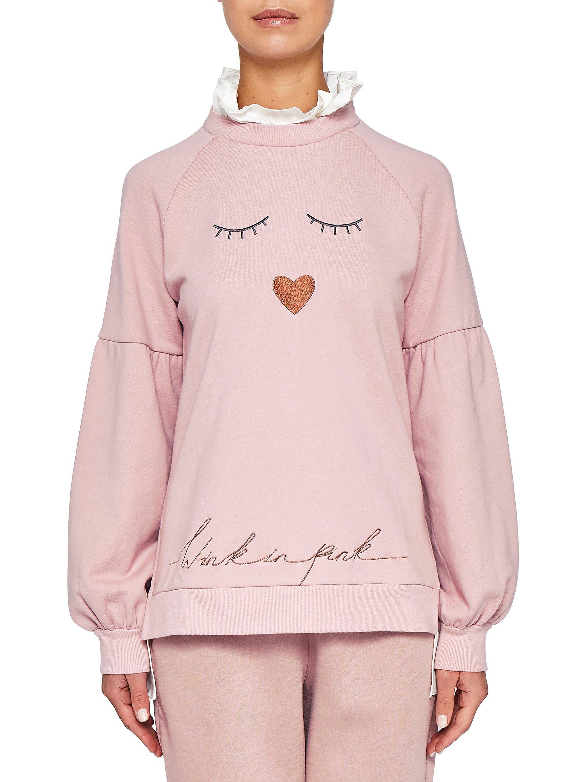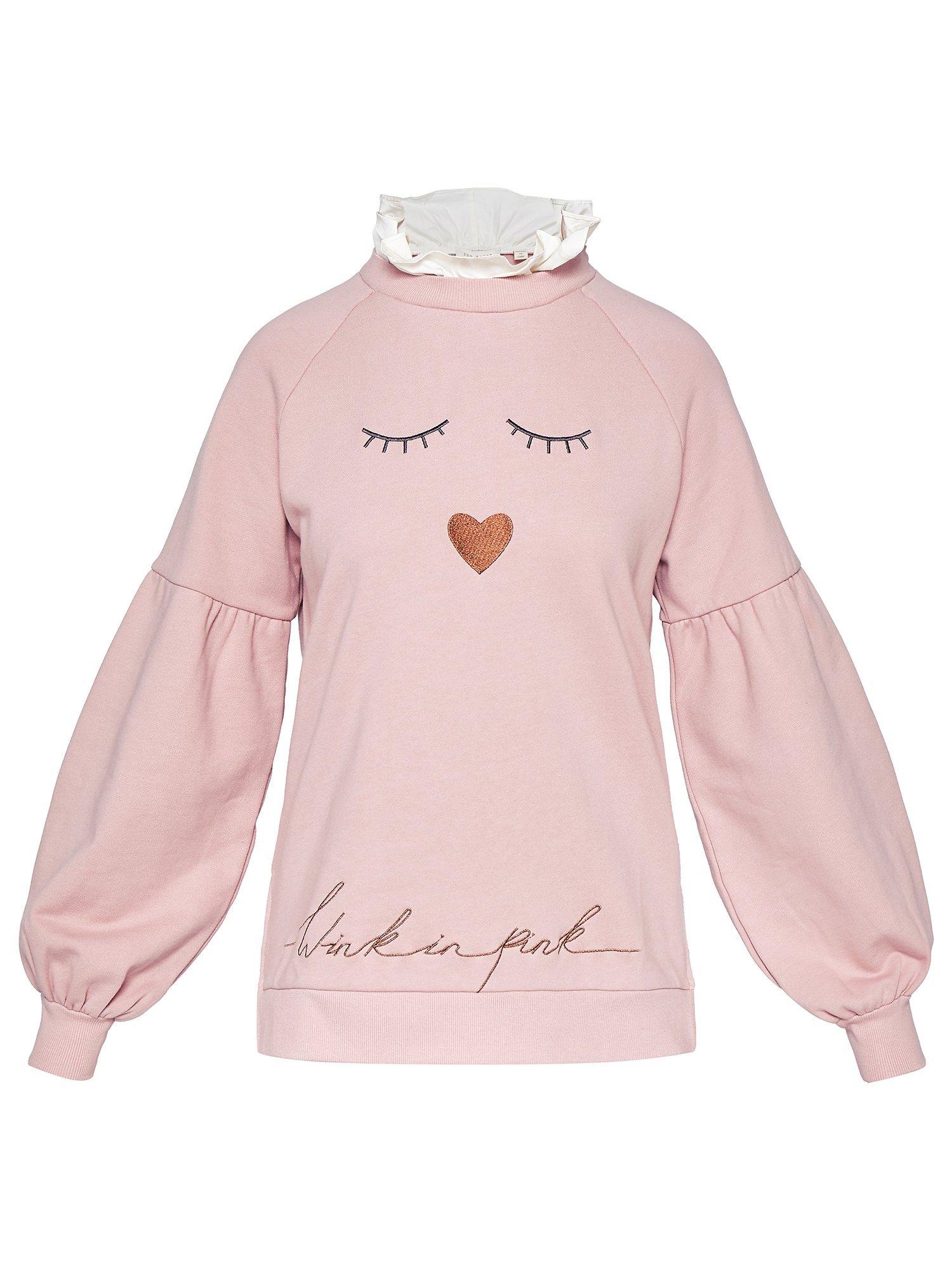 Crafted from cotton, this piece offers a comfortable wear that's easy to transition through the seasons. It's cut to a relaxed fit and features a crew neckline with a frill stand-up collar, raglan sleeves with ruching detail to create statement volume and a 'Wink in pink' slogan at the bottom.