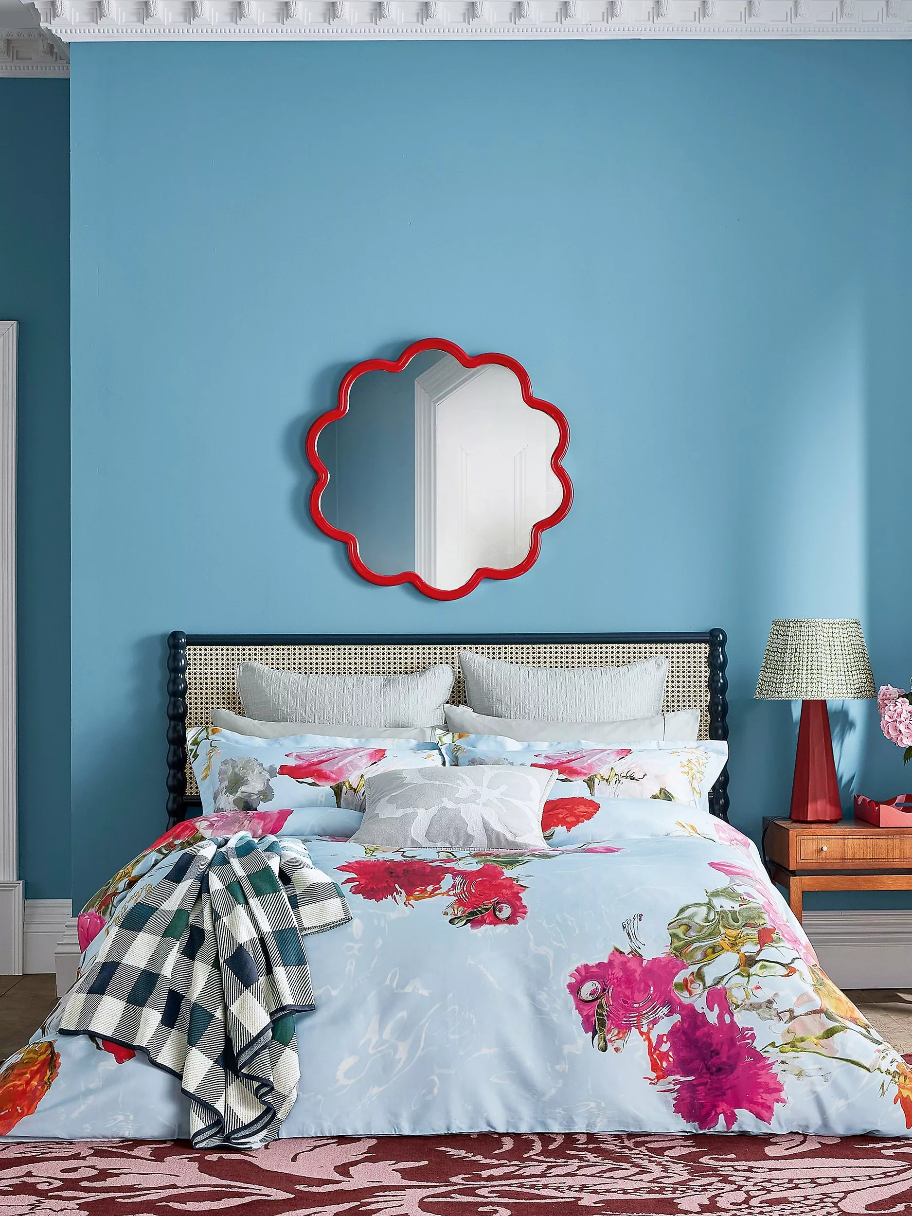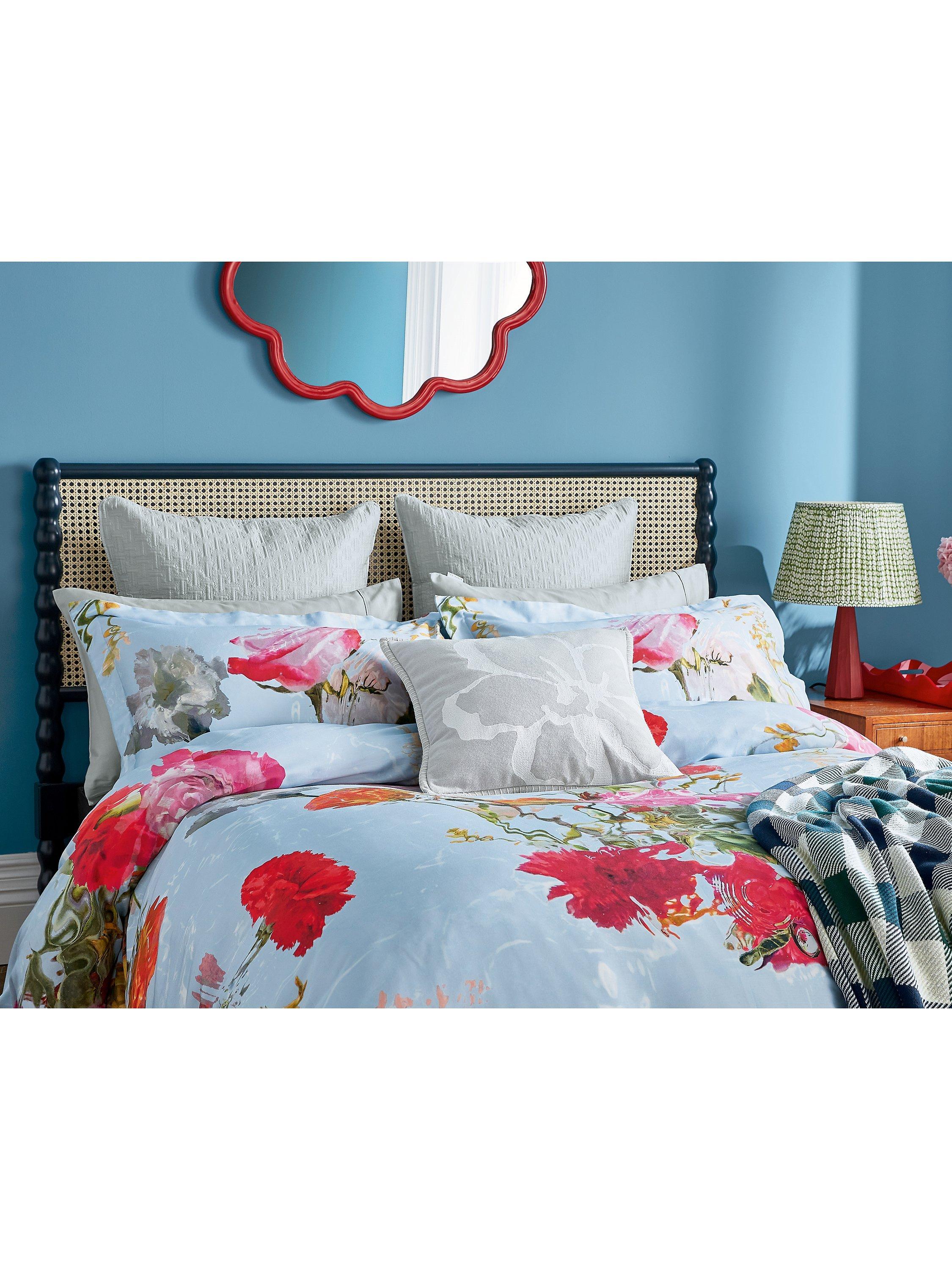 Add some drama to your bedroom with this striking, large-scale photographic floral print, coloured in a vibrant palette of deep pink, orange and red tones and floating on a pale blue ground. Digitally printed on 220 thread count cotton sateen and paired with a plain blue reverse.