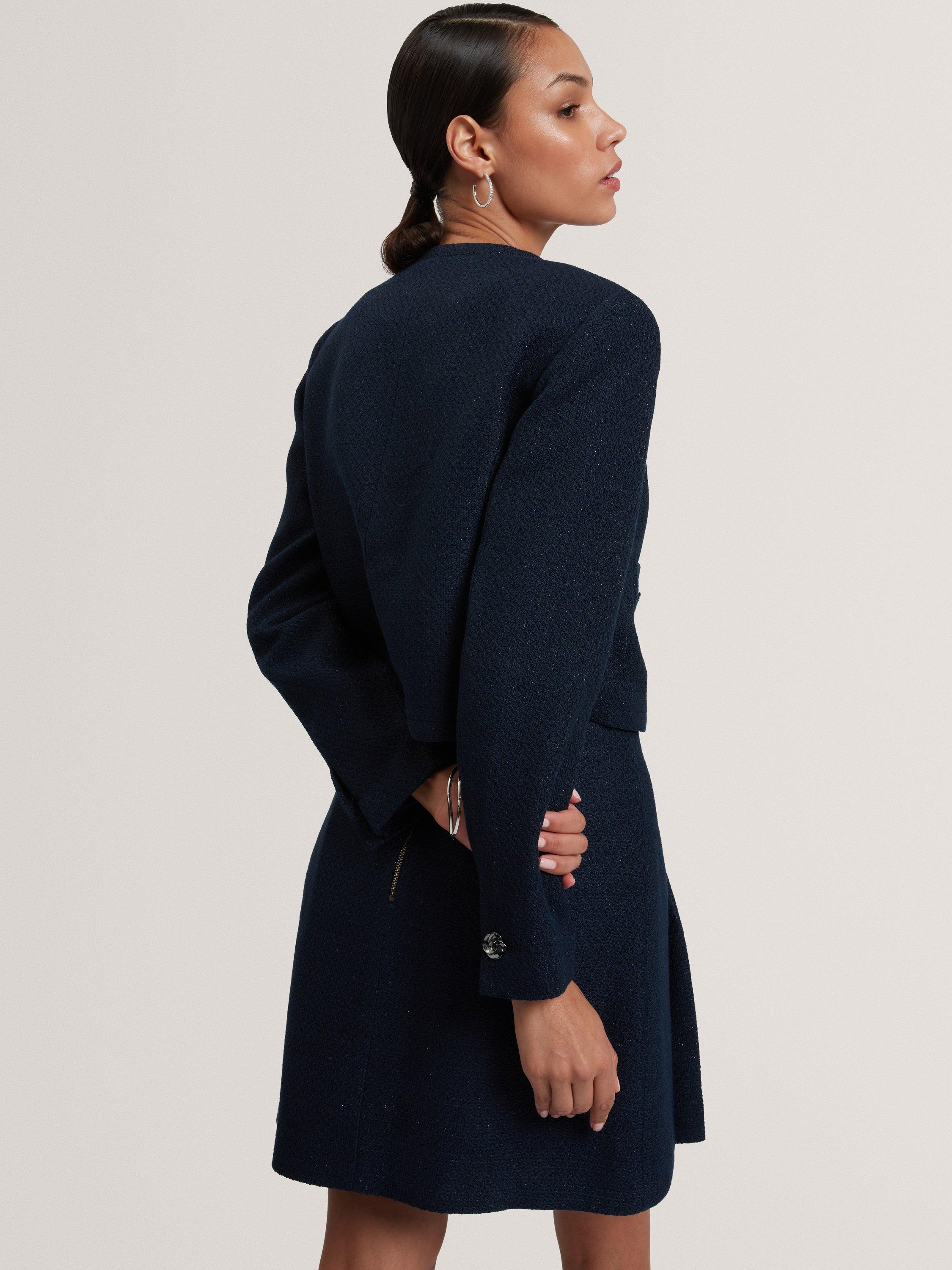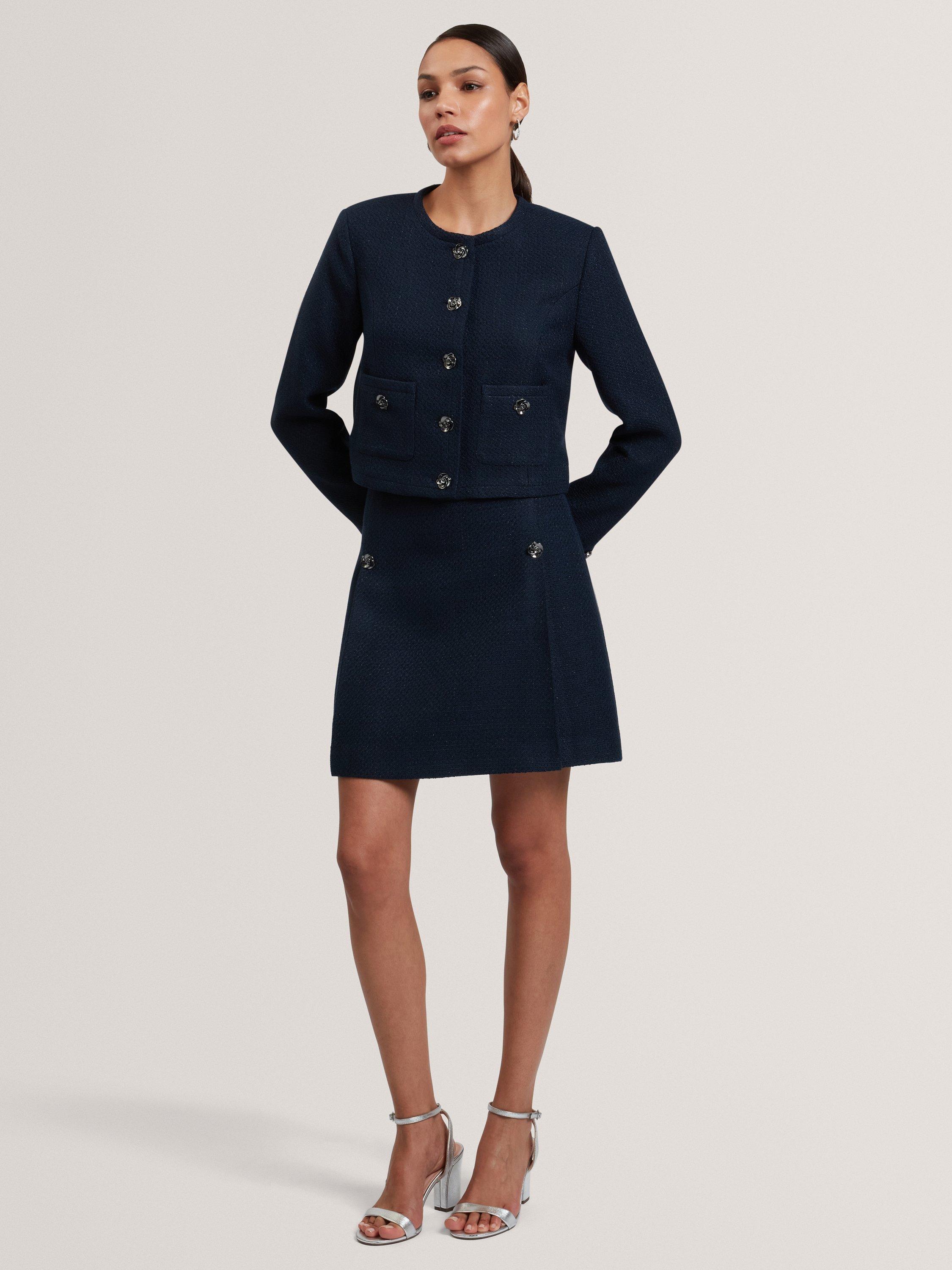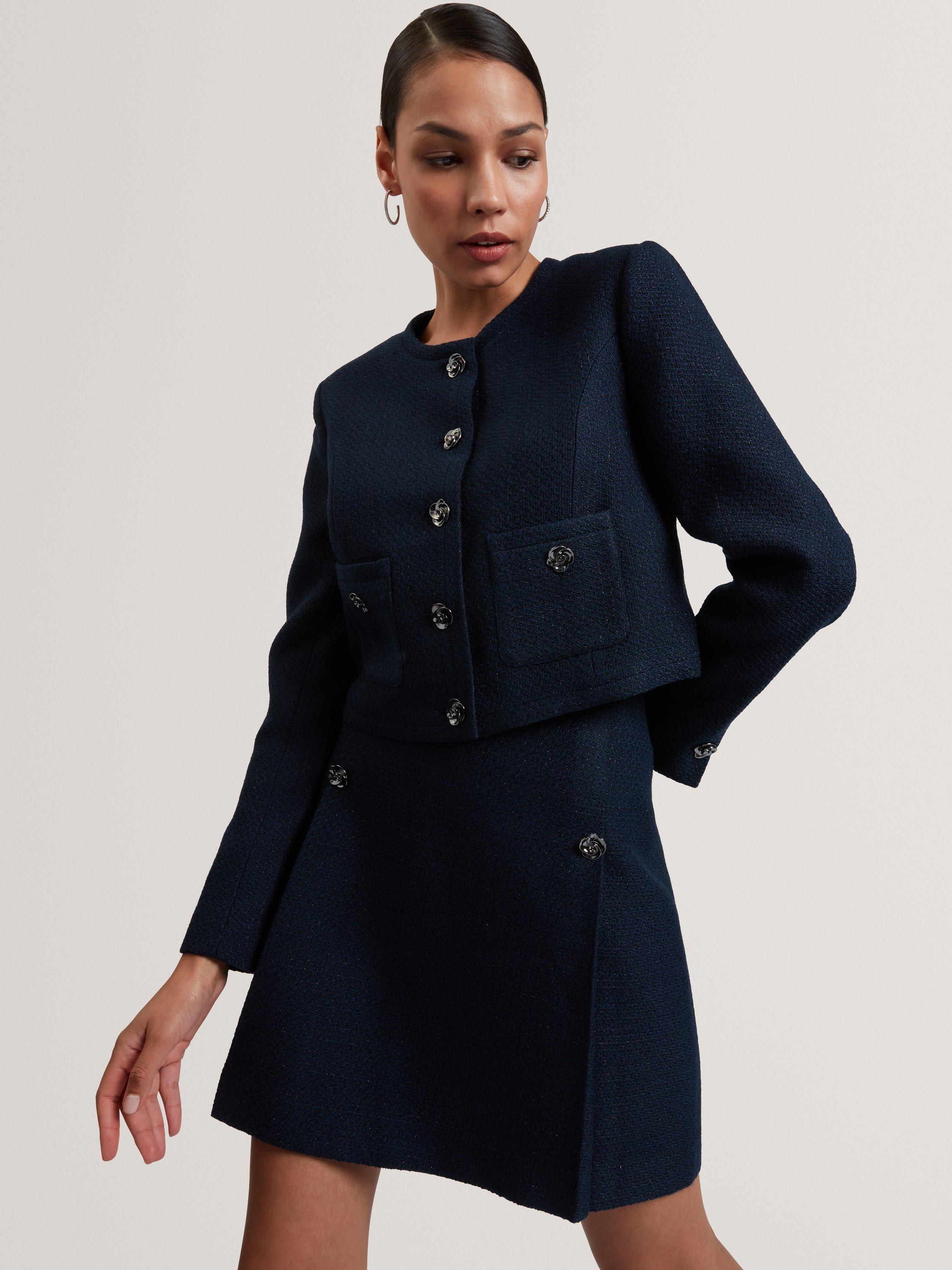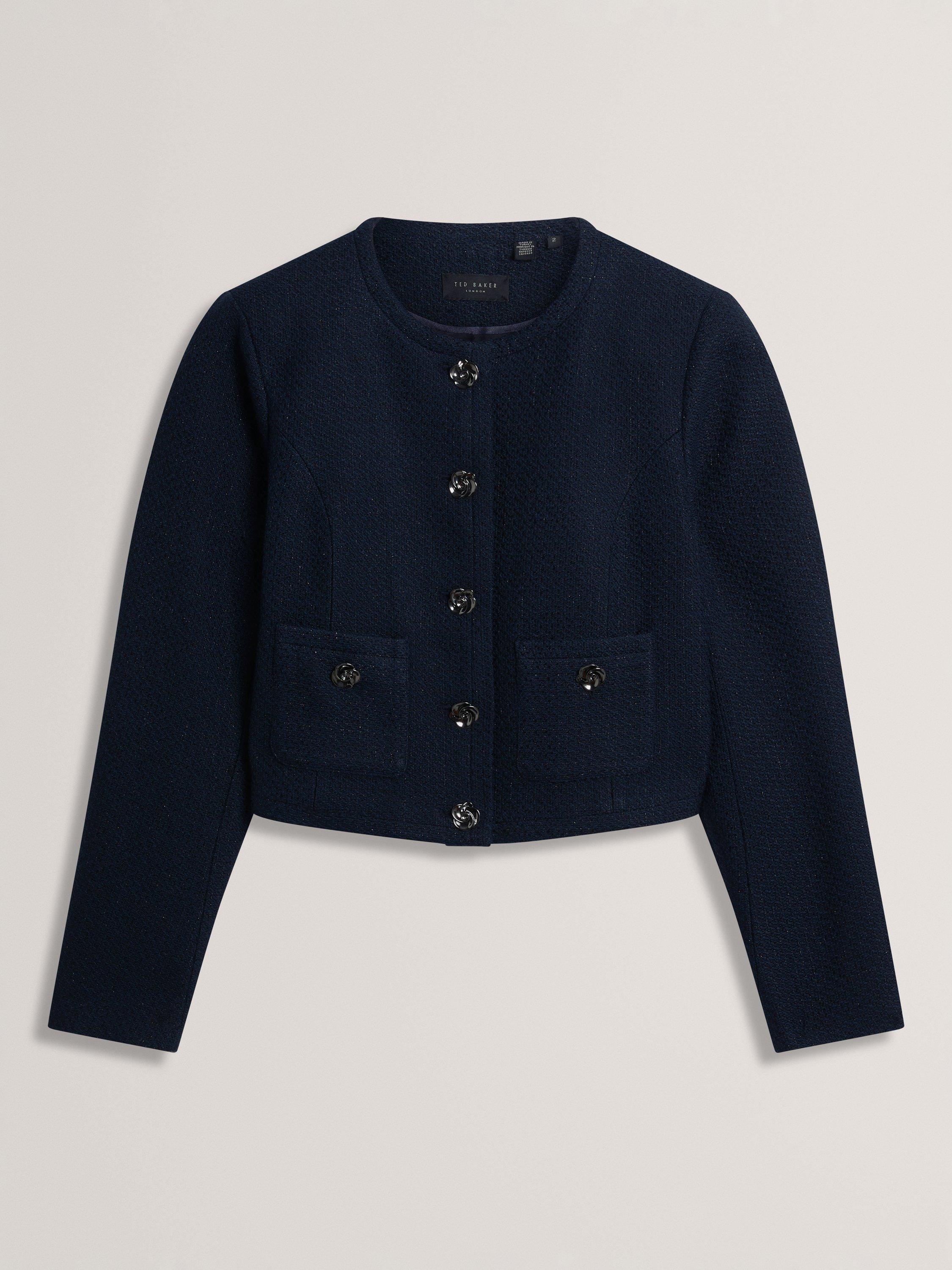 Elevate your look with the Floxa cropped boucle jacket, featuring elegant rose-detail buttons and a tailored fit - perfect for chic, sophisticated style.