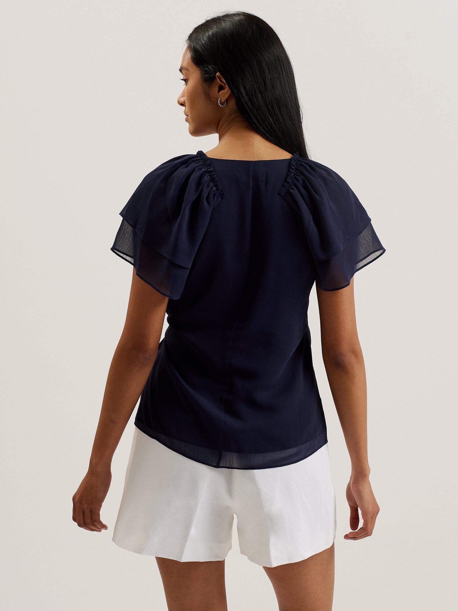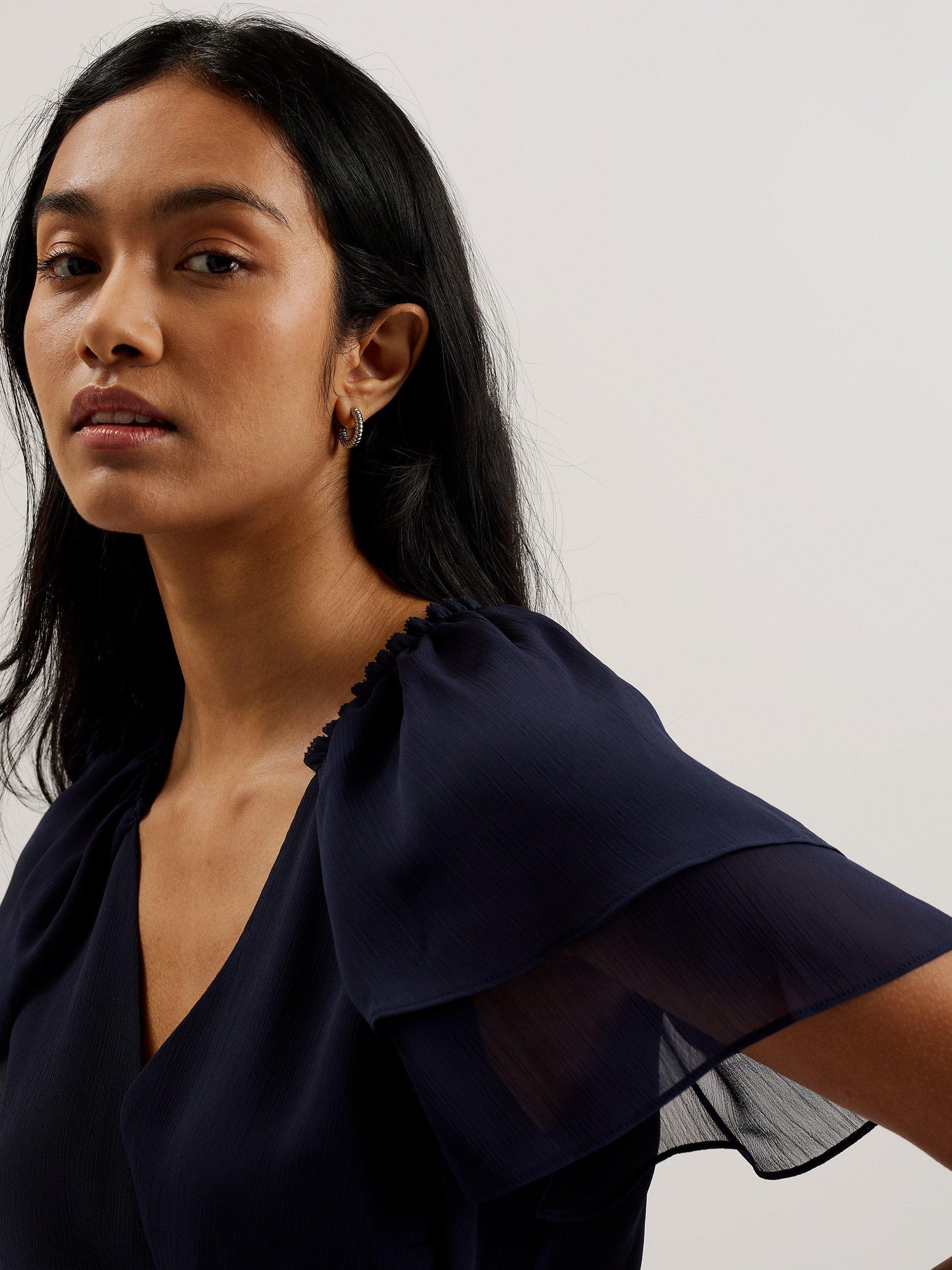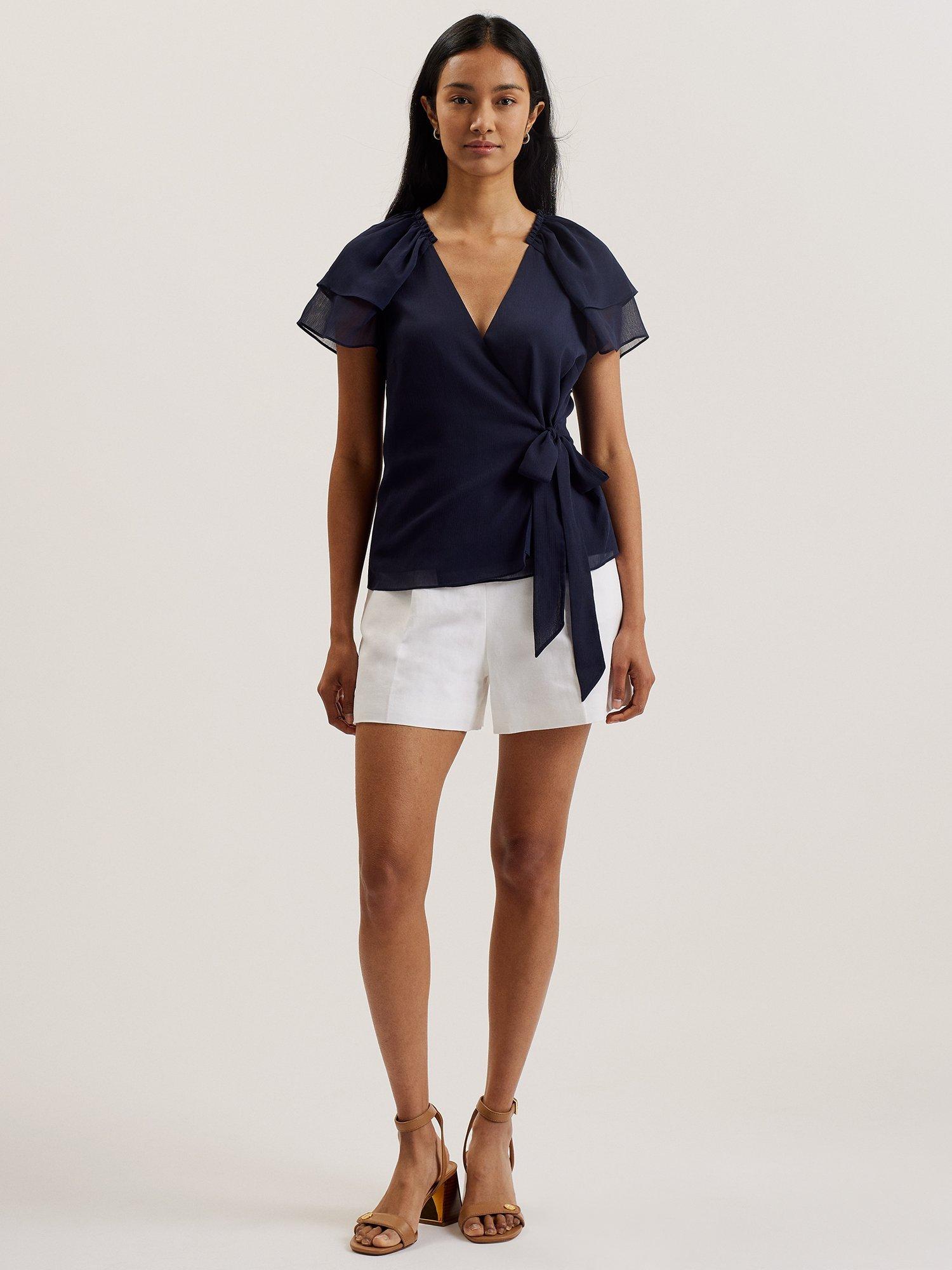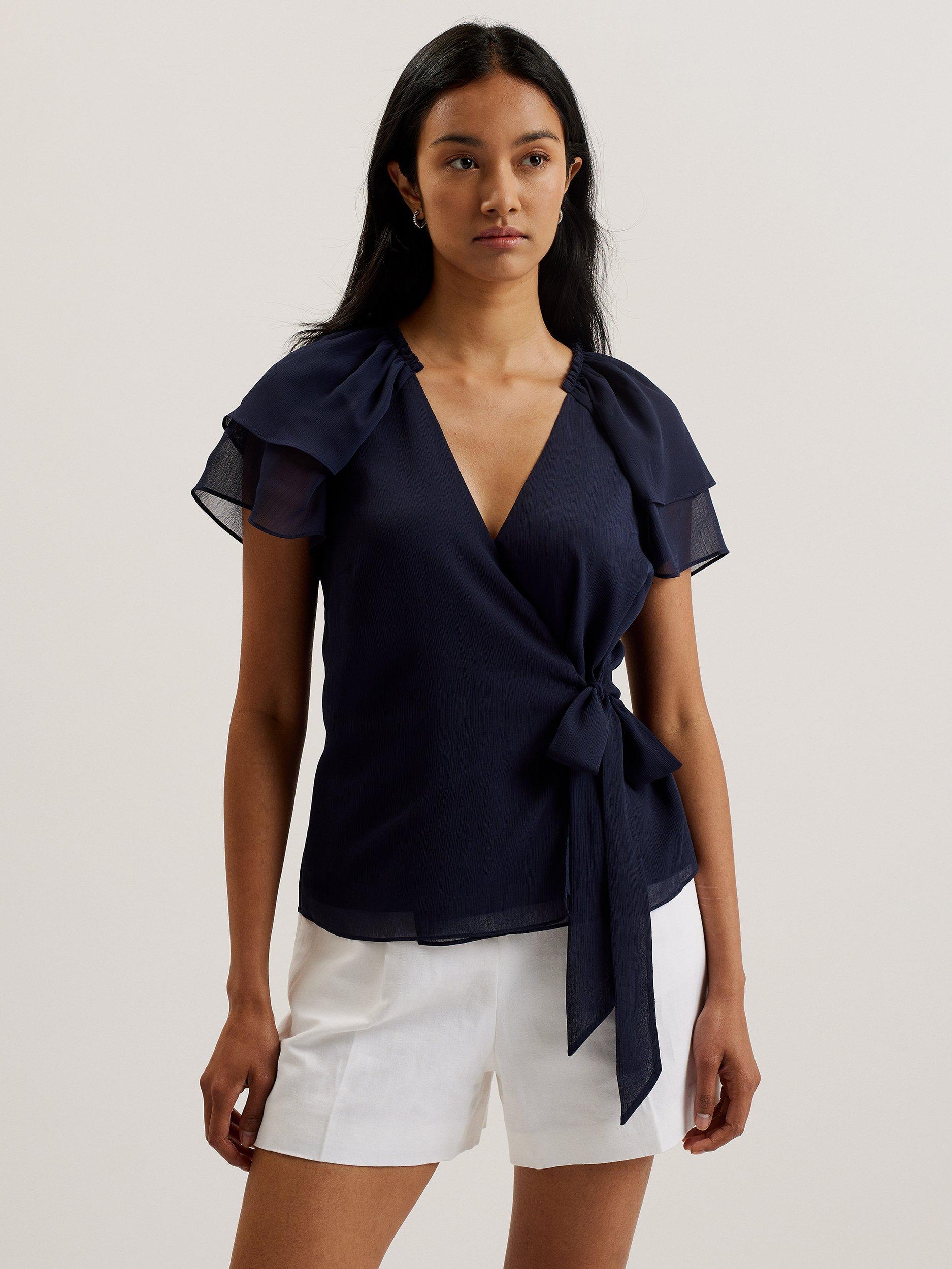 With frilly detailed short sleeves, this wrap top from Ted Baker is made from a lightweight fabric with a v-neckline and a tie at the side.