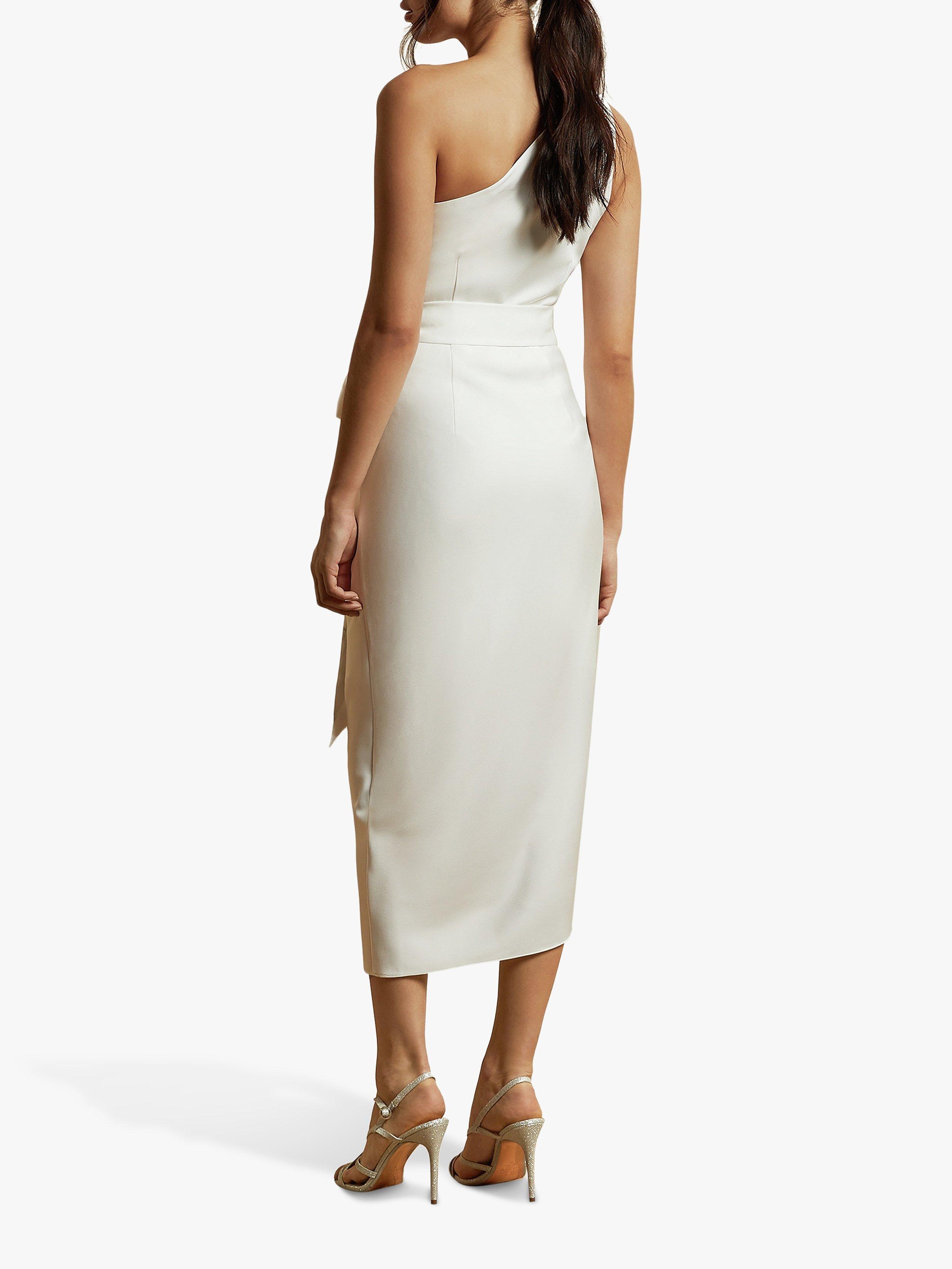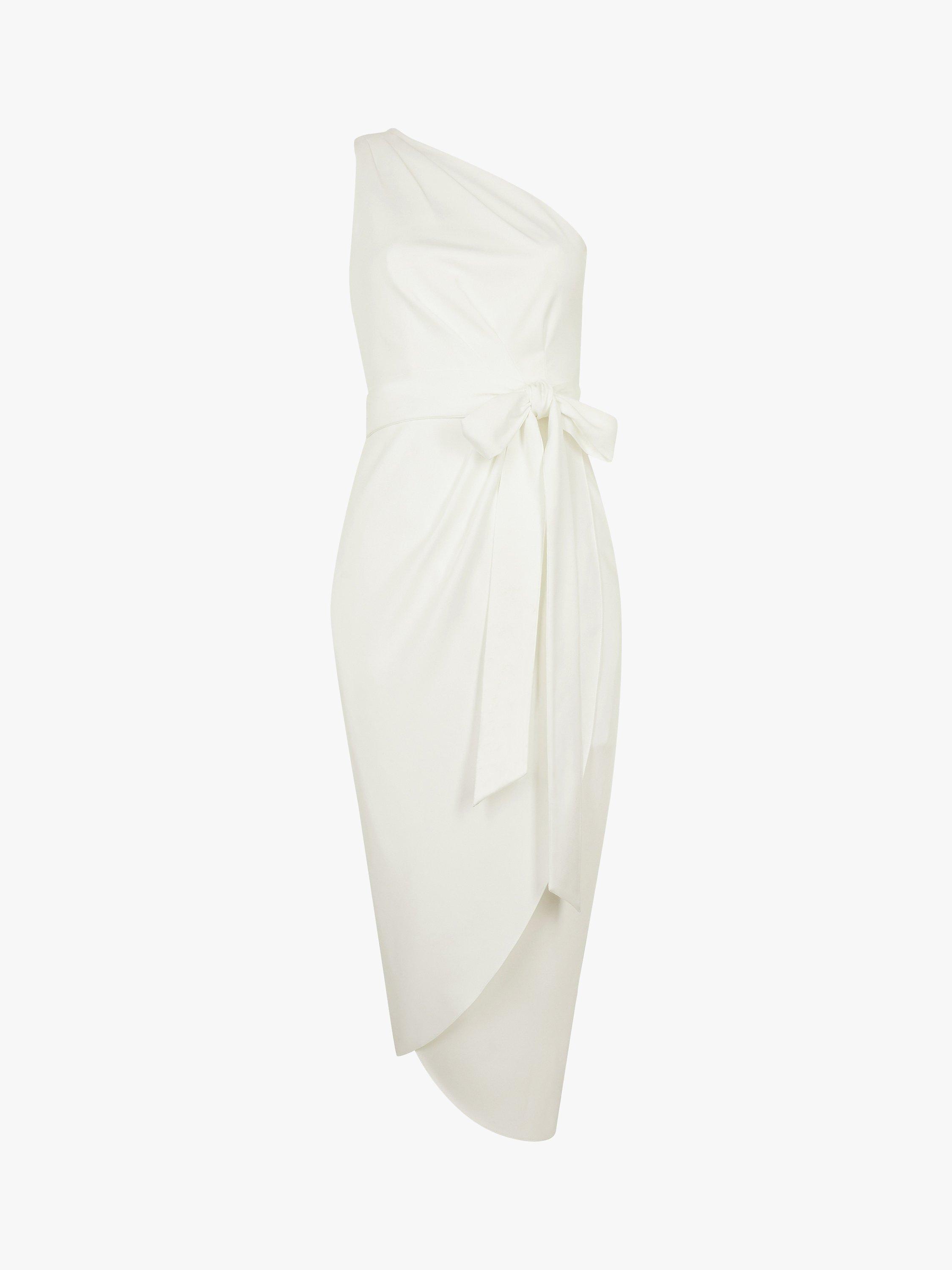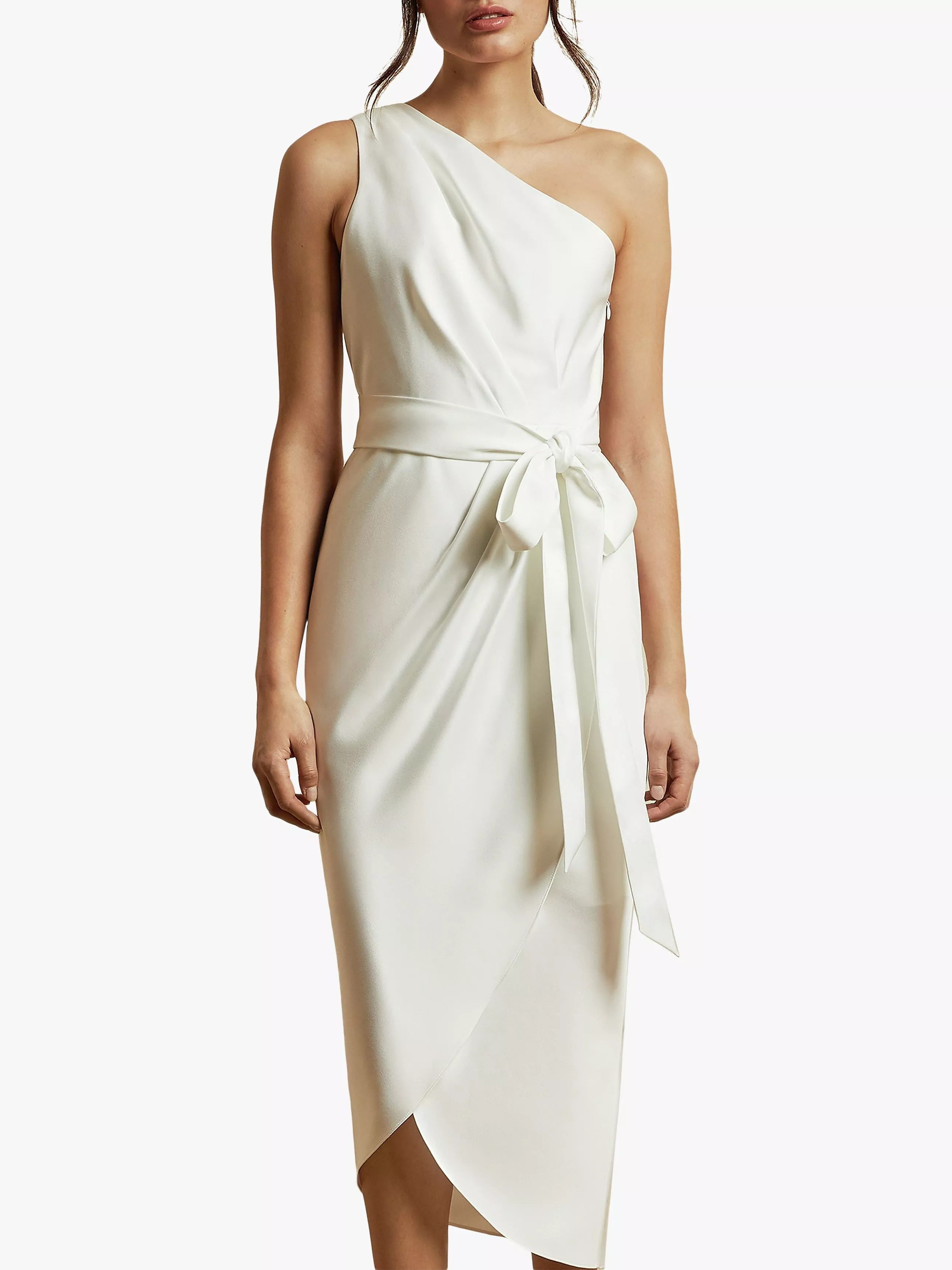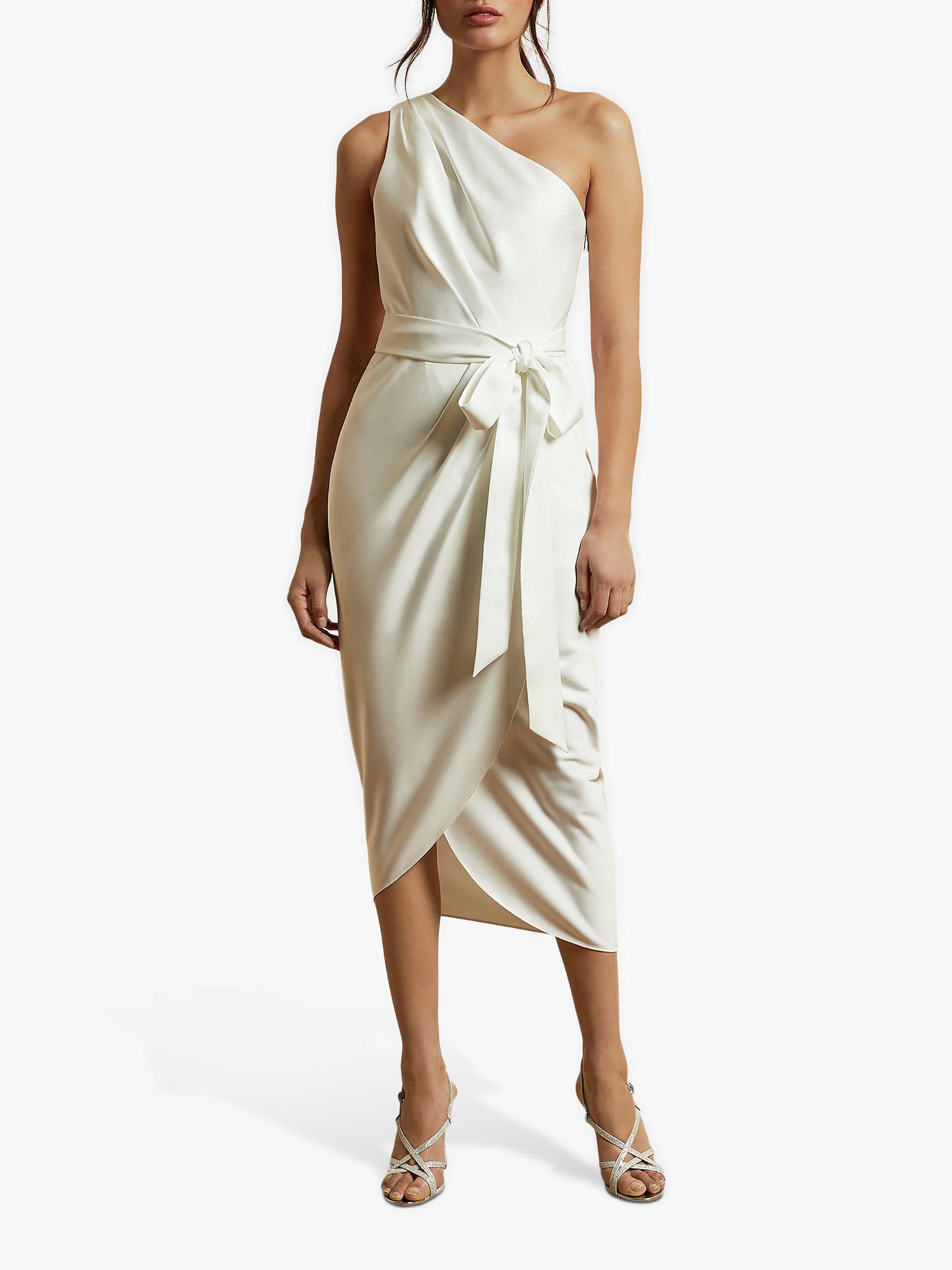 Perfect for weddings, the races and summertime occasions, this Ted Baker Gabie dress is designed in a flattering wrap-over pencil shape that contours your body, defined by the tie waist and Roman-inspired one-shoulder detail. Playful but sophisticated, zip it up through the side and pair it with barely-there heels.