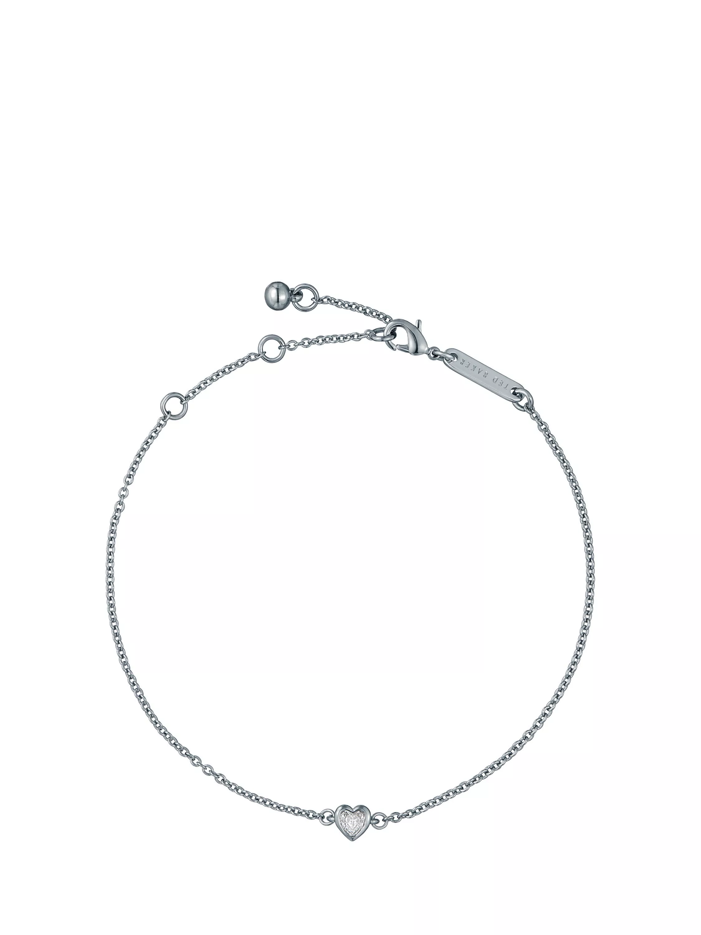 Complete your look with Ted Baker's Halle Mini Crystal Heart Adjustable Bracelet. Finished in silver-tone plating, this fine chain bracelet features a single crystal-embellished heart charm for a subtle hint of sparkle. Designed with an adjustable clasp for the perfect fit, it’s ideal for everyday wear or layering with other bracelets. Presented in a Ted Baker branded gift box—perfect for gifting or adding to your own jewellery collection.