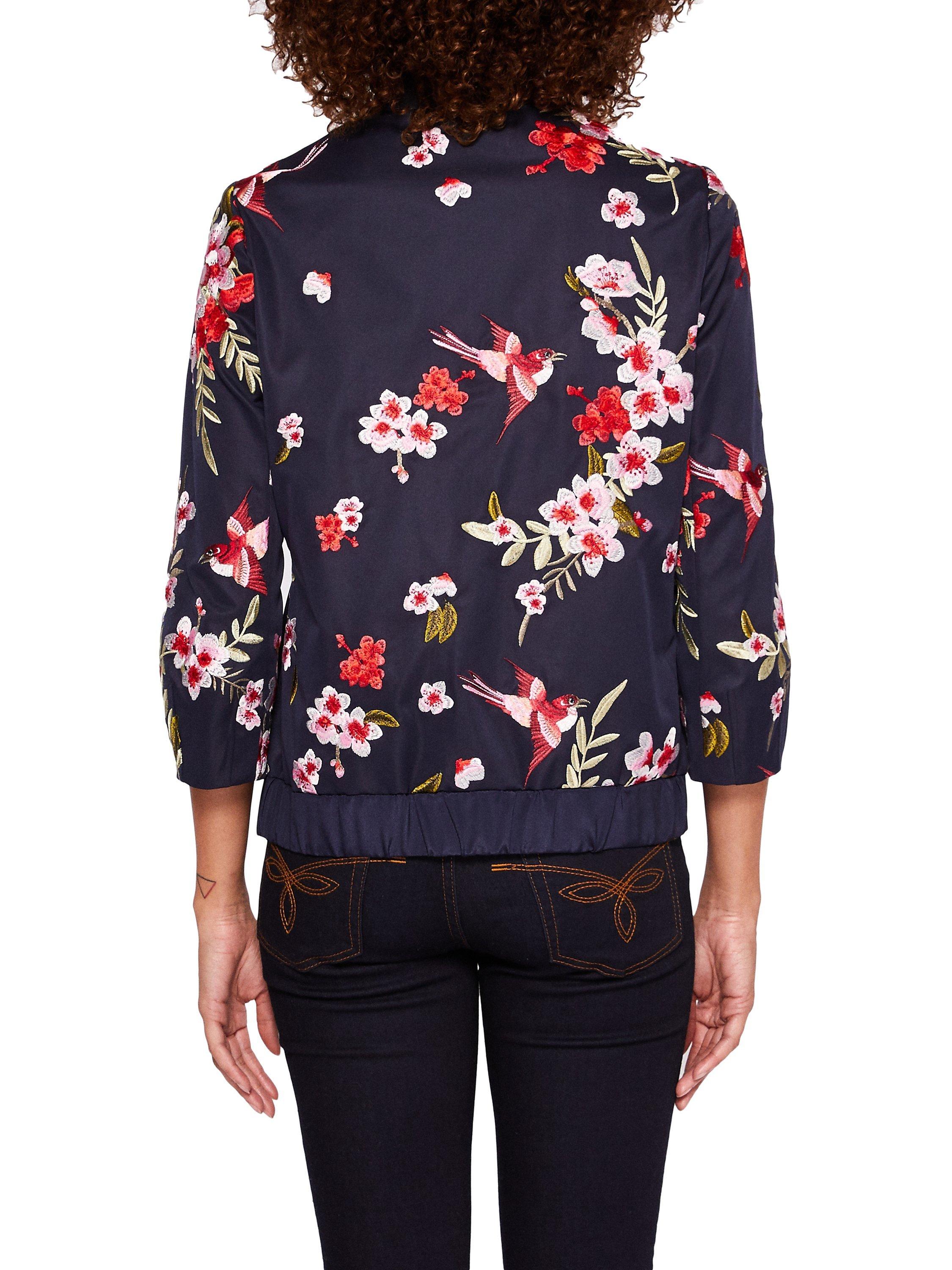 Crafted in high-shine fabric and adorned with a bright blossom jacquard design, this piece is perfect for adding style to your going-out assortment. In classic bomber style, it features a baseball collar neckline and an exposed zip front fastening.