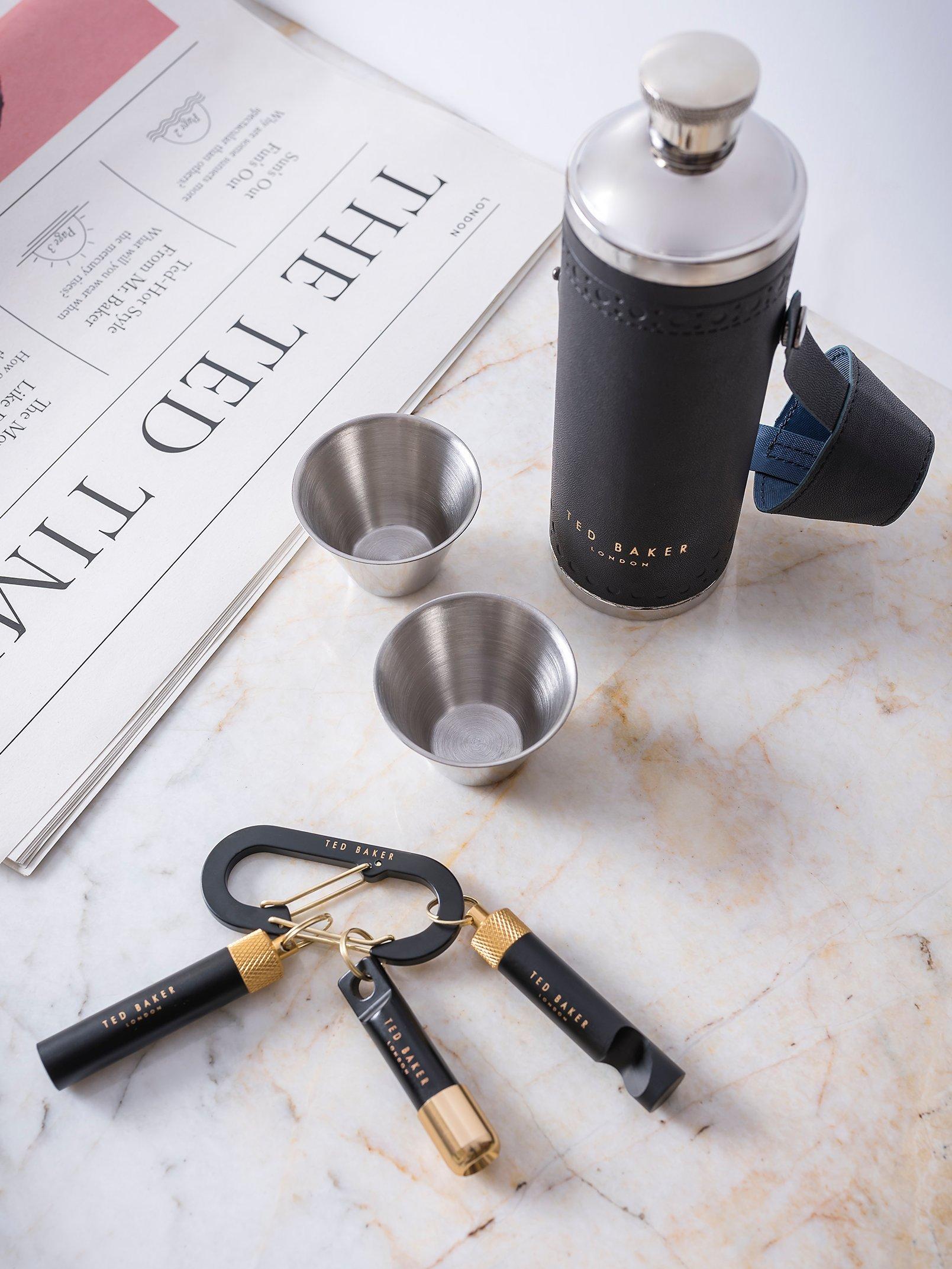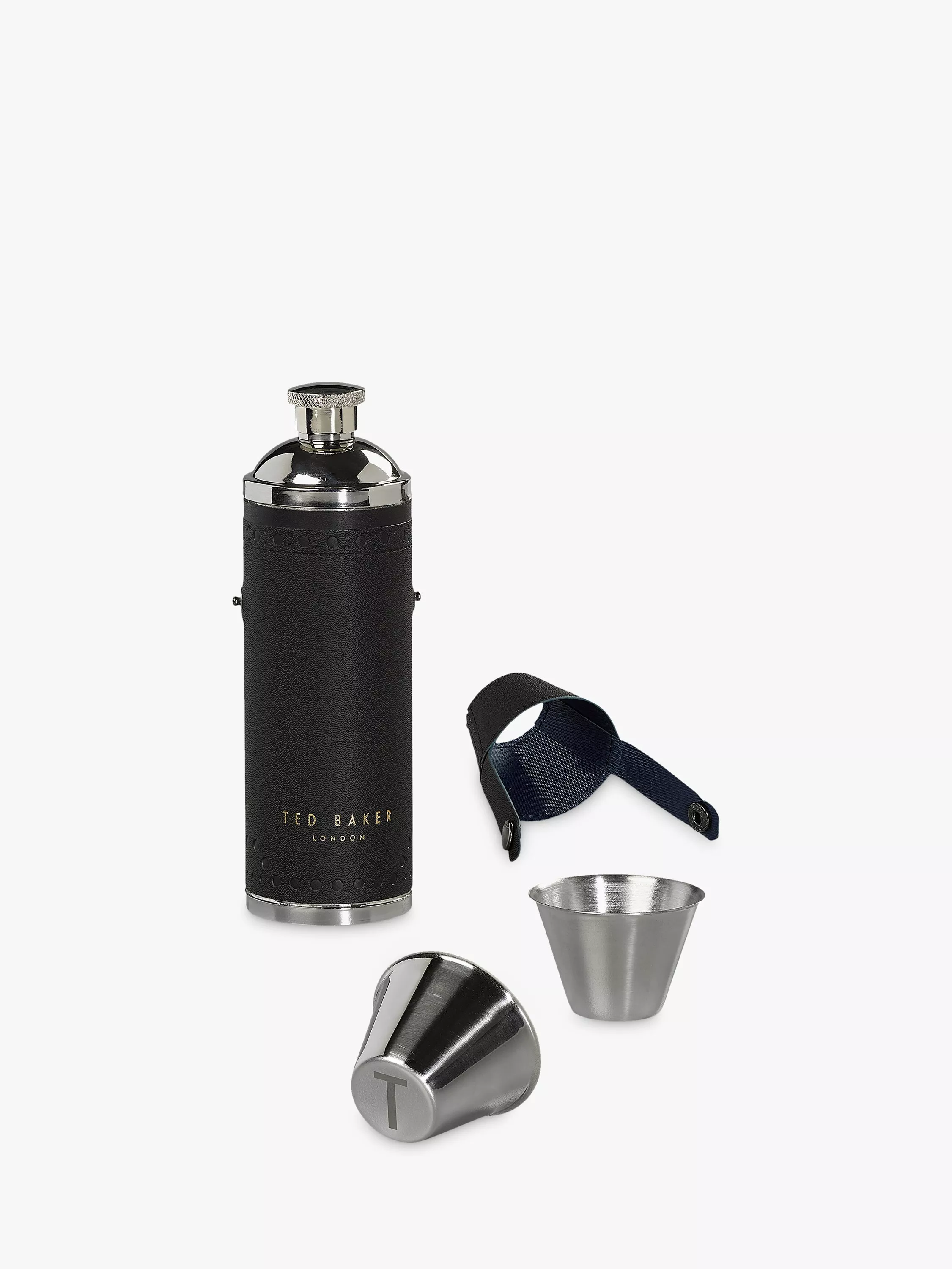Take a sip from Ted Baker's stainless steel hip flask with two shots cups.
