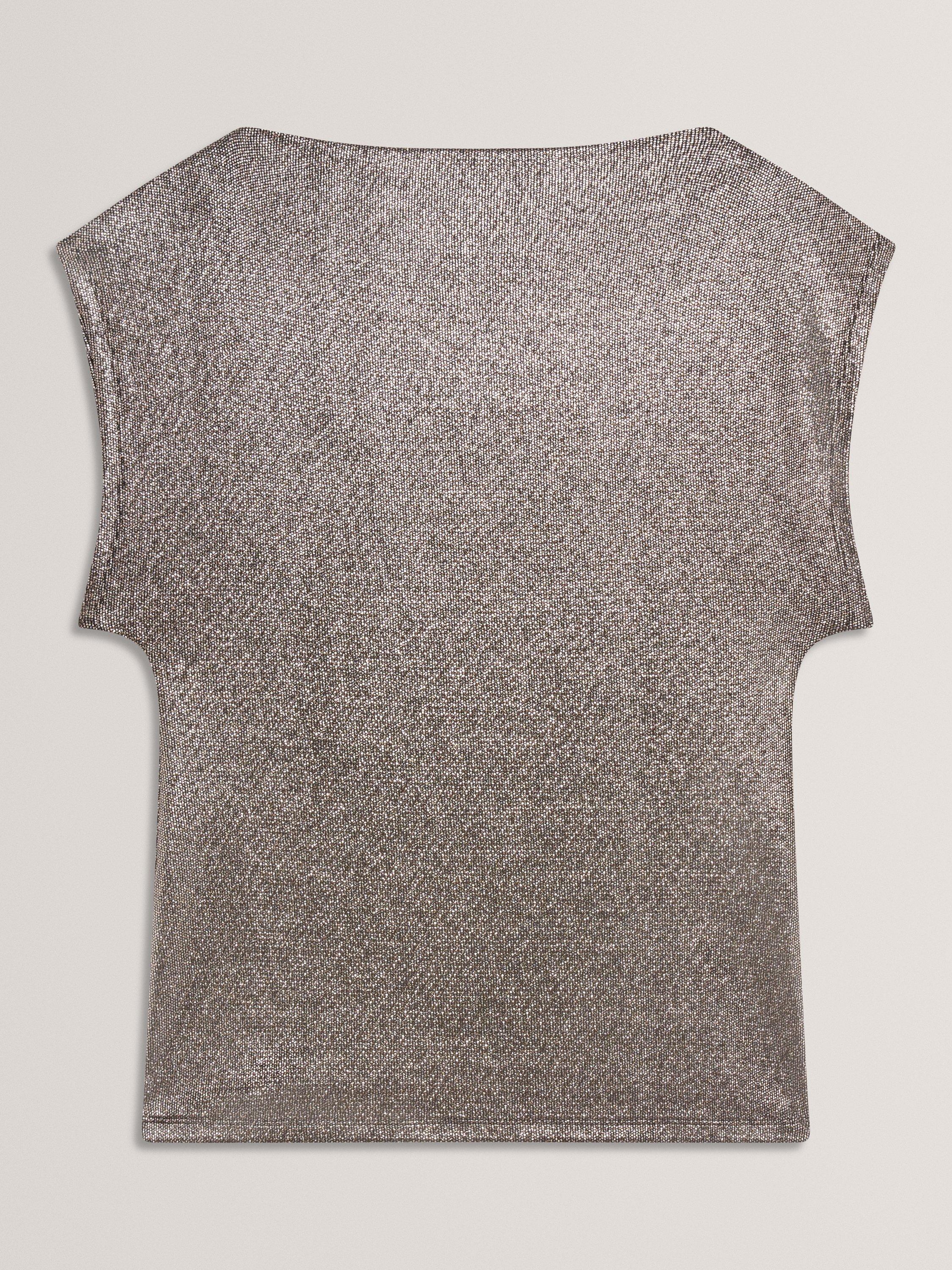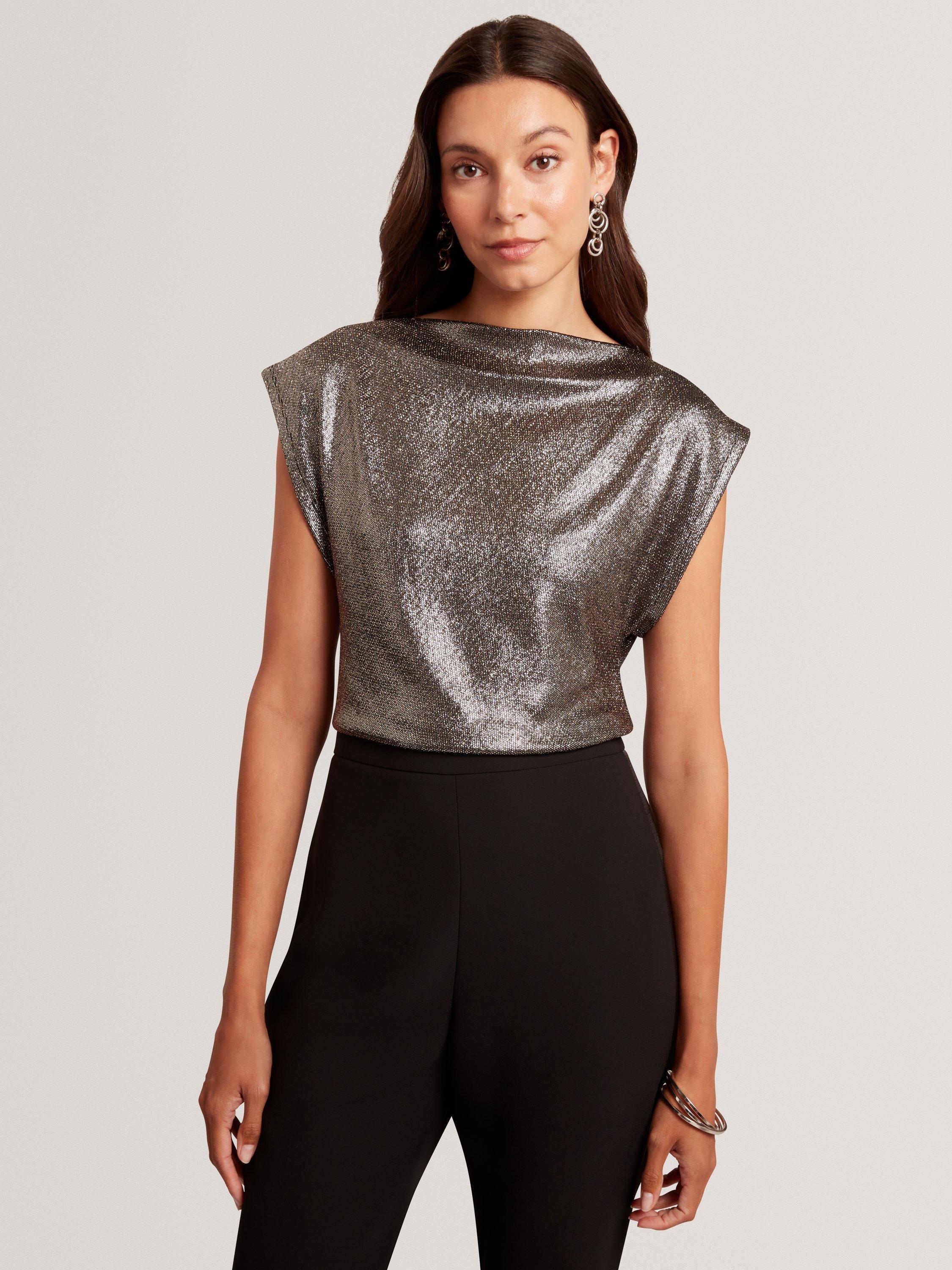 This bronze metallic blouse adds gleam to any occasion. The boat neck and short sleeves offer comfort and style, making every day or evening effortless and fun.