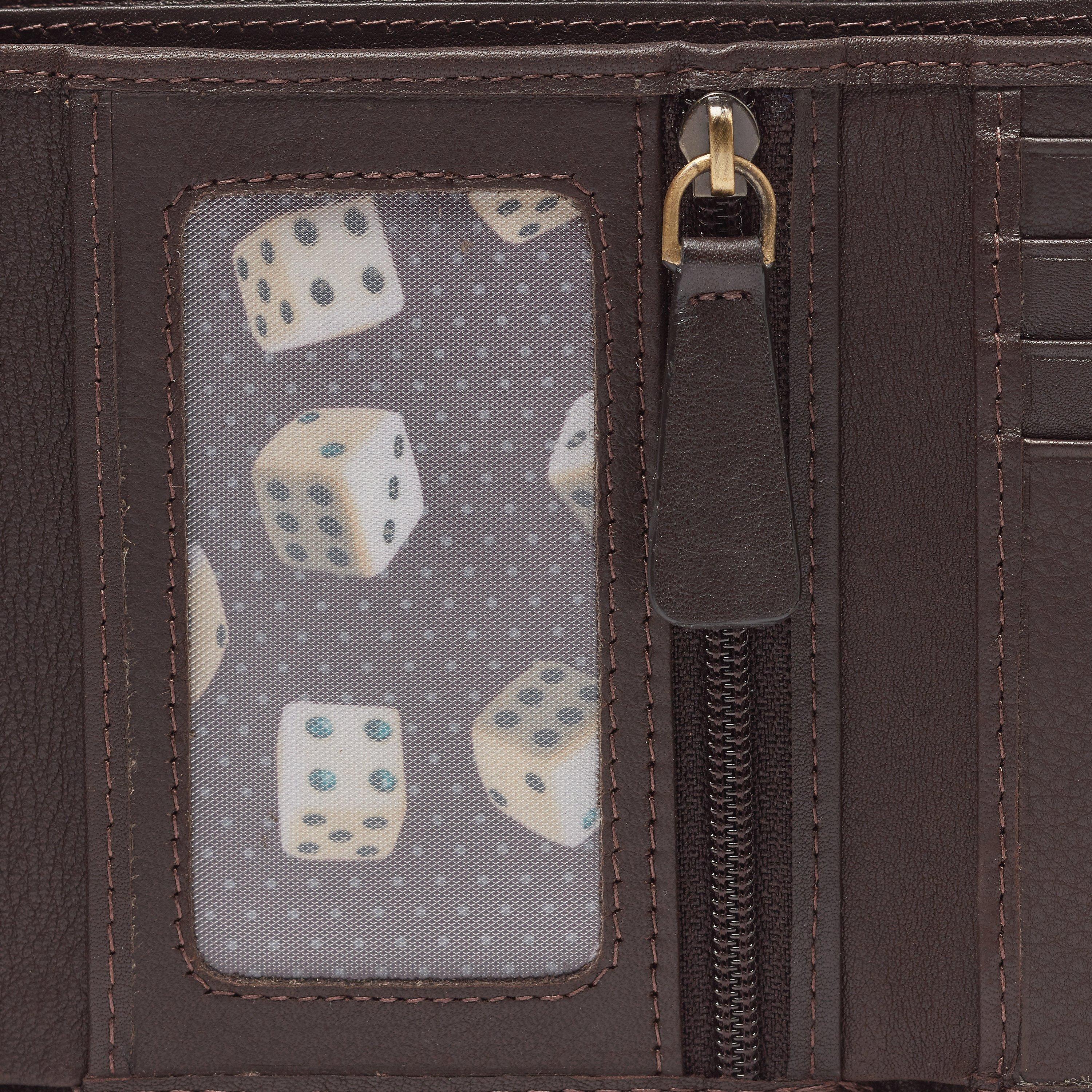 Complete with embossed branding to the front, it opens up to reveal eight credit card slots, two note compartments, a separate slip compartment, zip-up coin pocket, and a clear window for your photo ID.