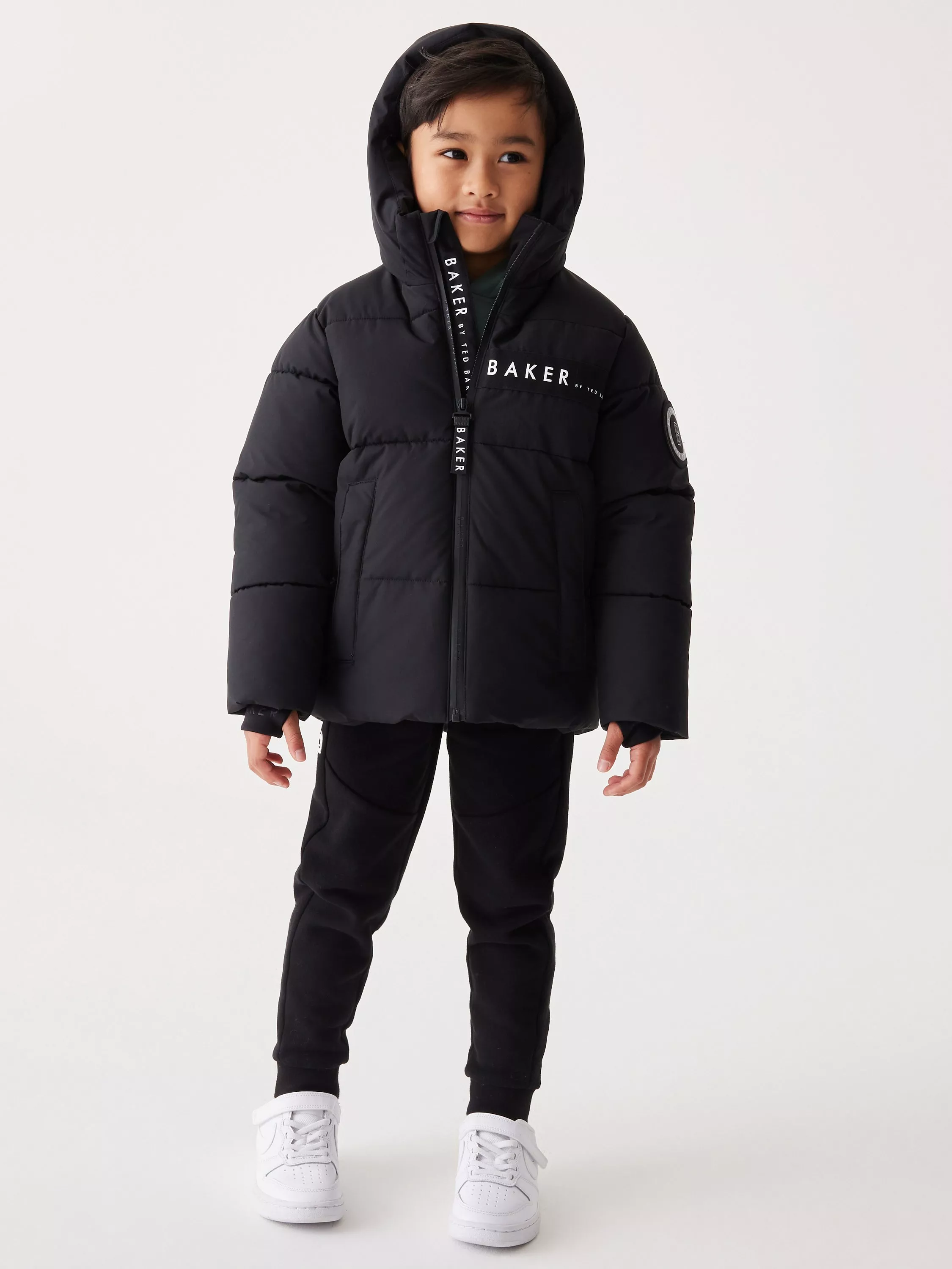 Padded shower-resistant coat. Branded storm cuffs. Warm, durable, recycled filler, technology pocket. Pockets on the side are sealed with a snap. Rib stop panel on chest and hood with branded tape. Branded badge on arm. Baker branded heat seal on back. Branded zip.