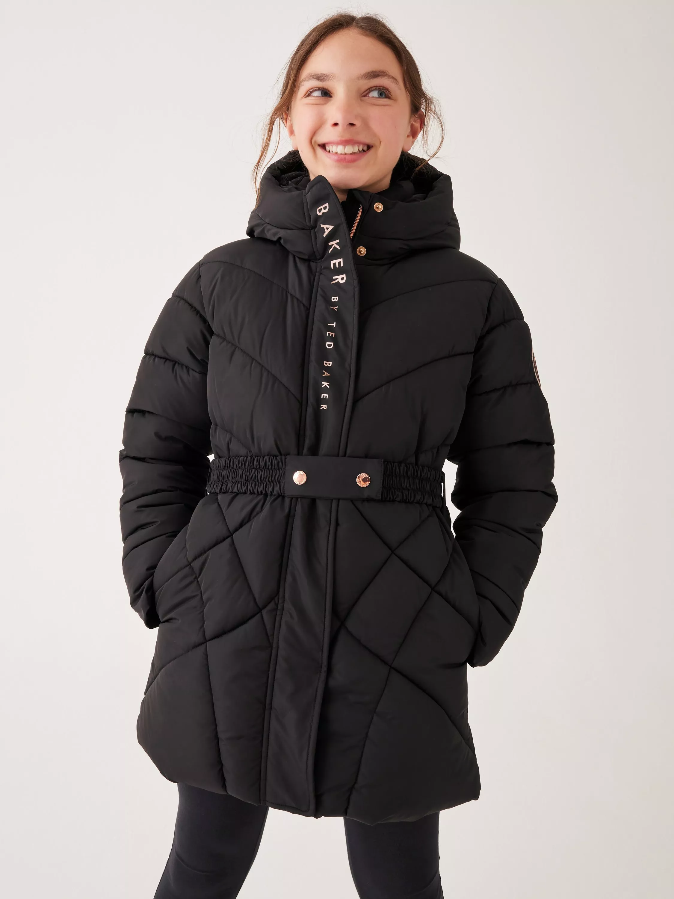 A classic and cosy longline quilted coat with logo detailing on the sleeve and floral lining.