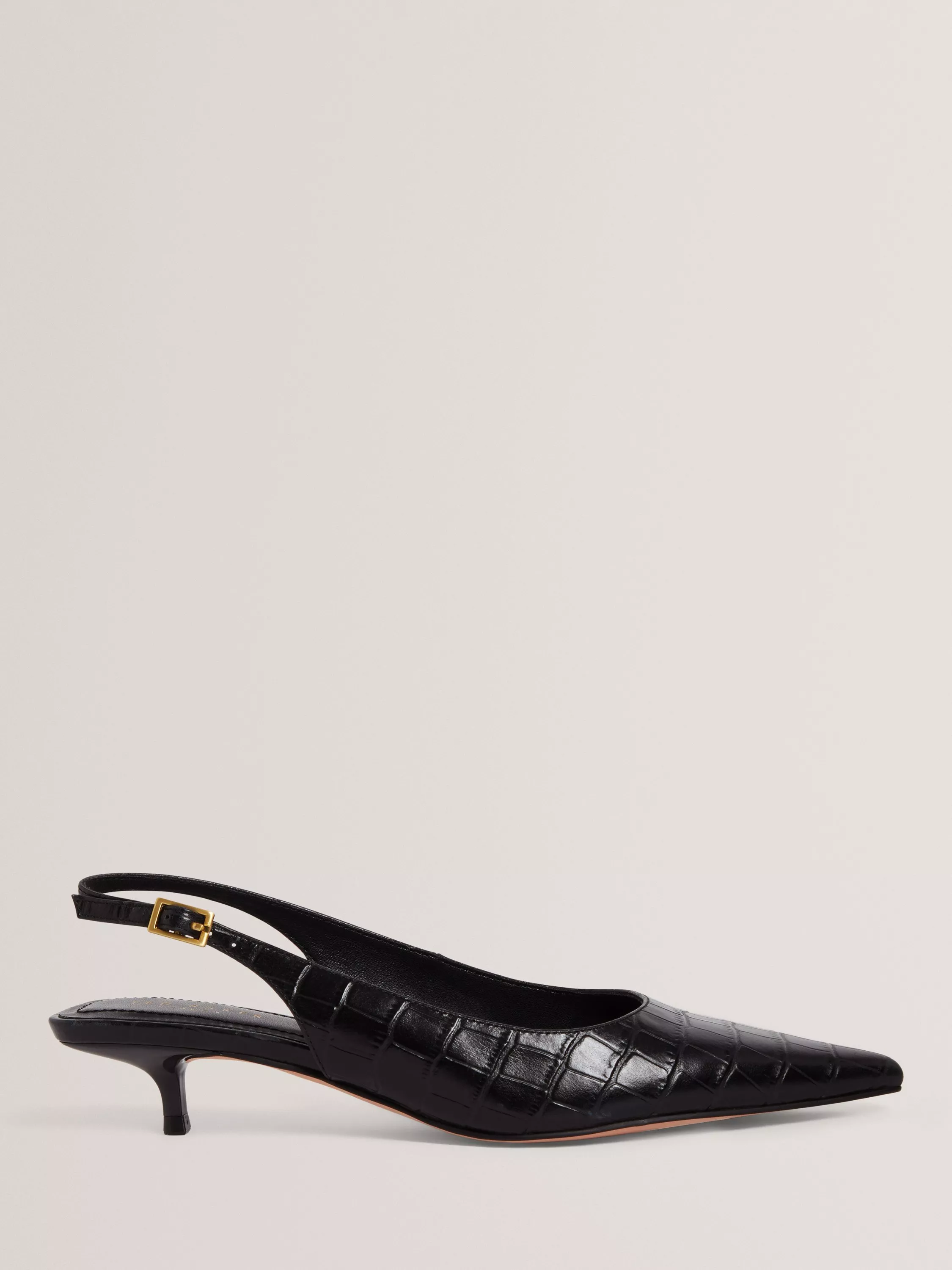 Kitten heel slingback sandals from Ted Baker. The pointed toe and croc-effect leather finish offer sophistication with a twist, while the low heel ensures comfort whether you are at work or exploring the city.