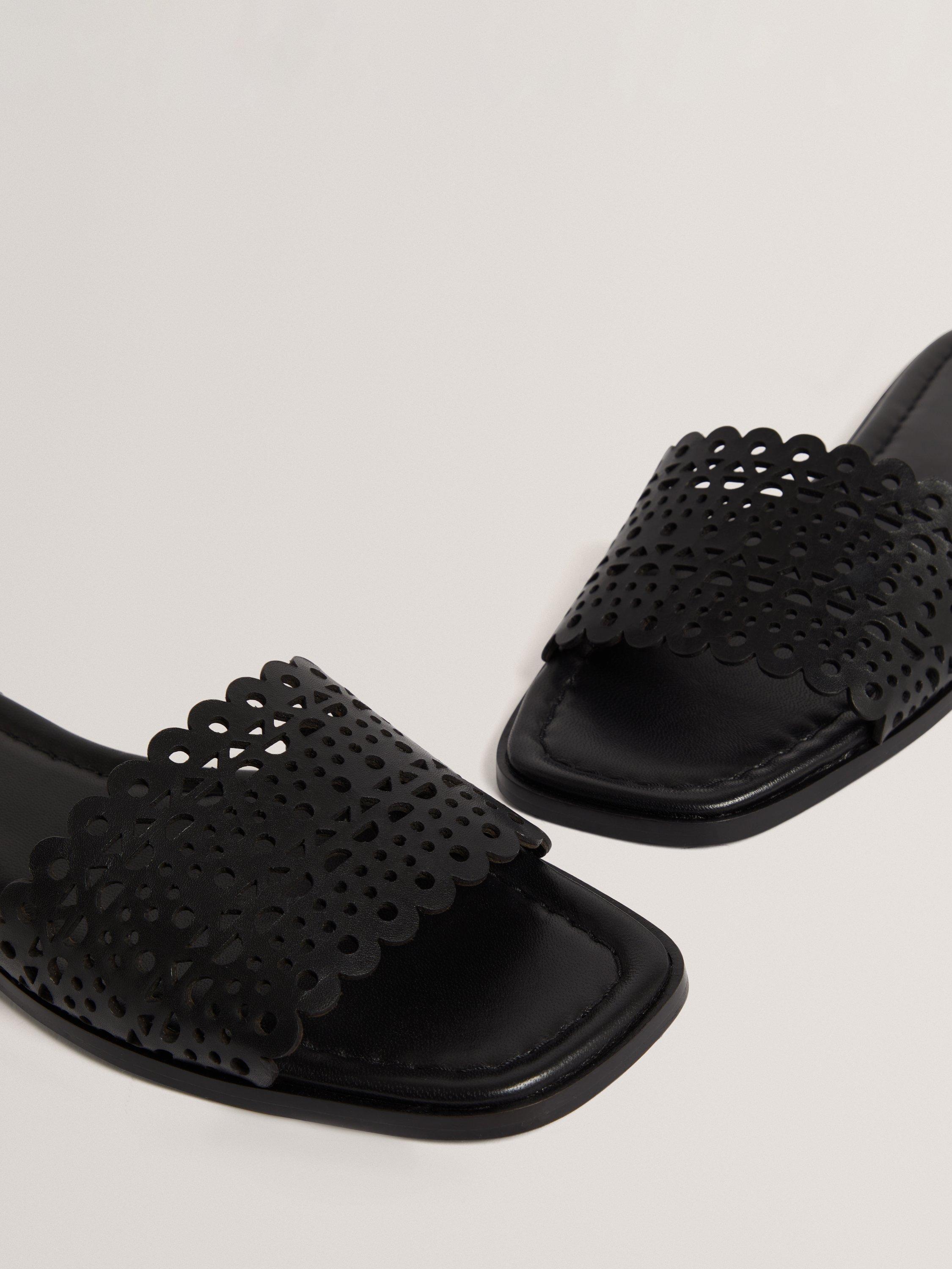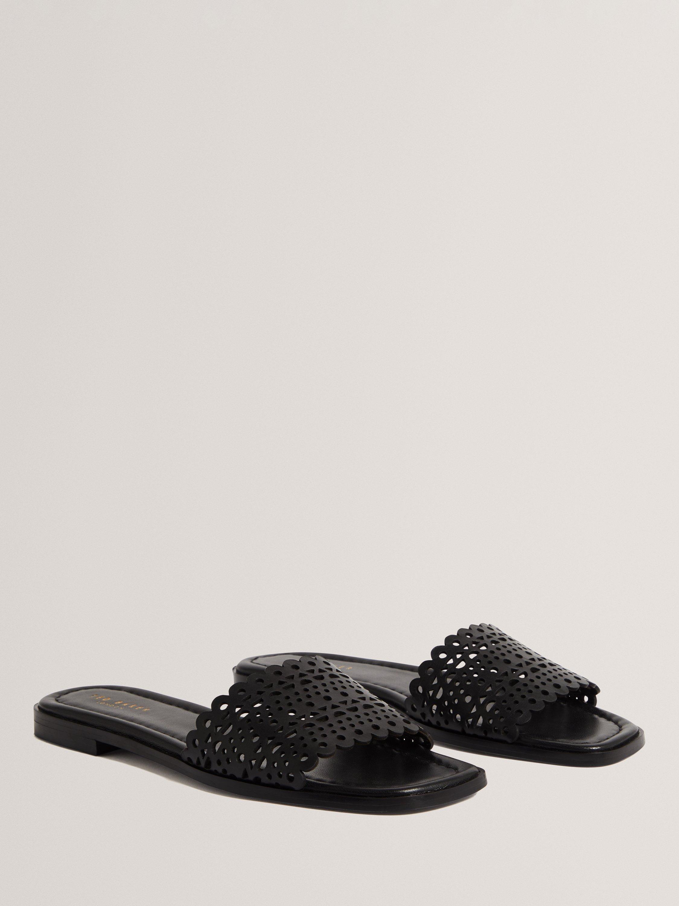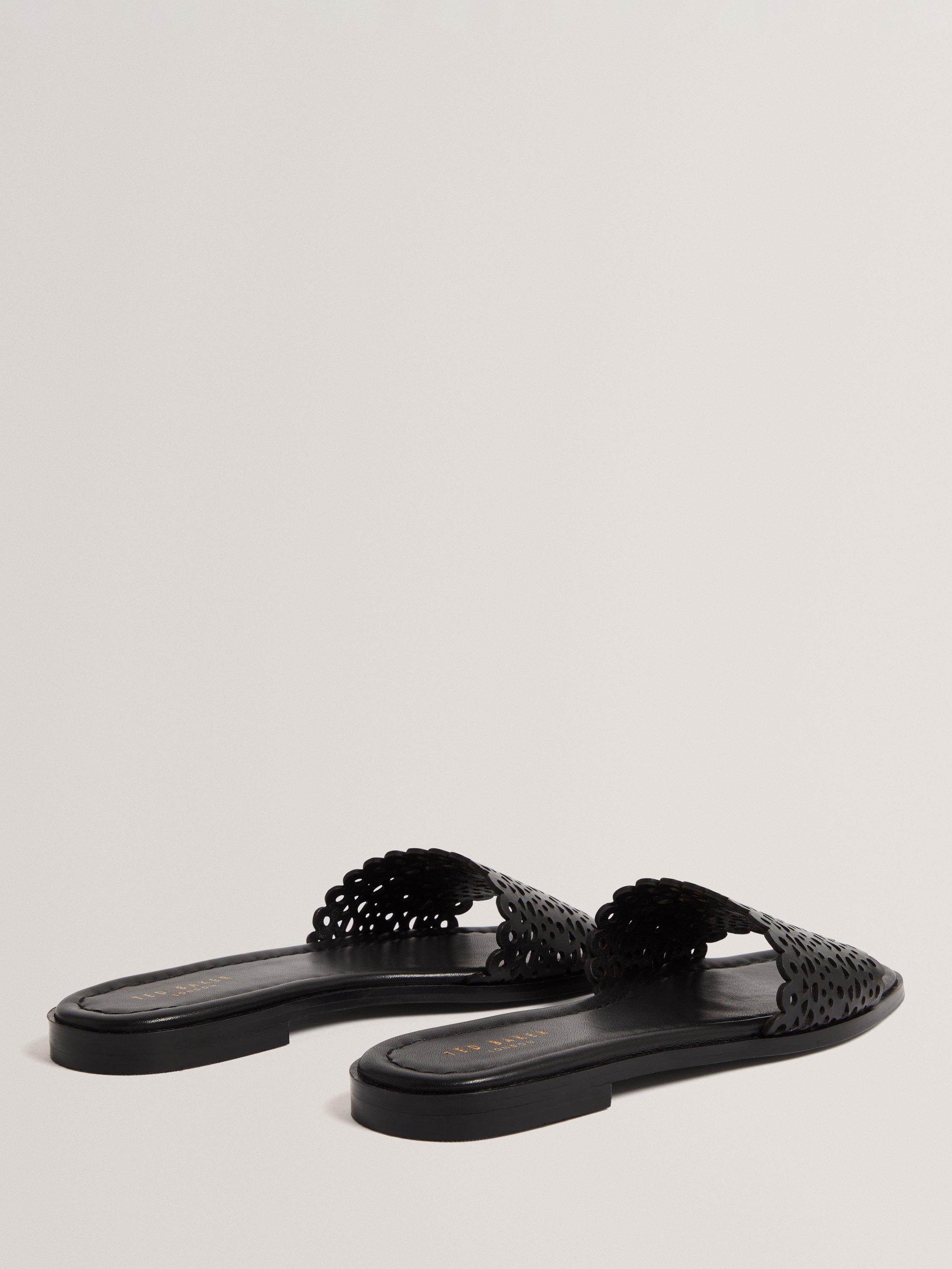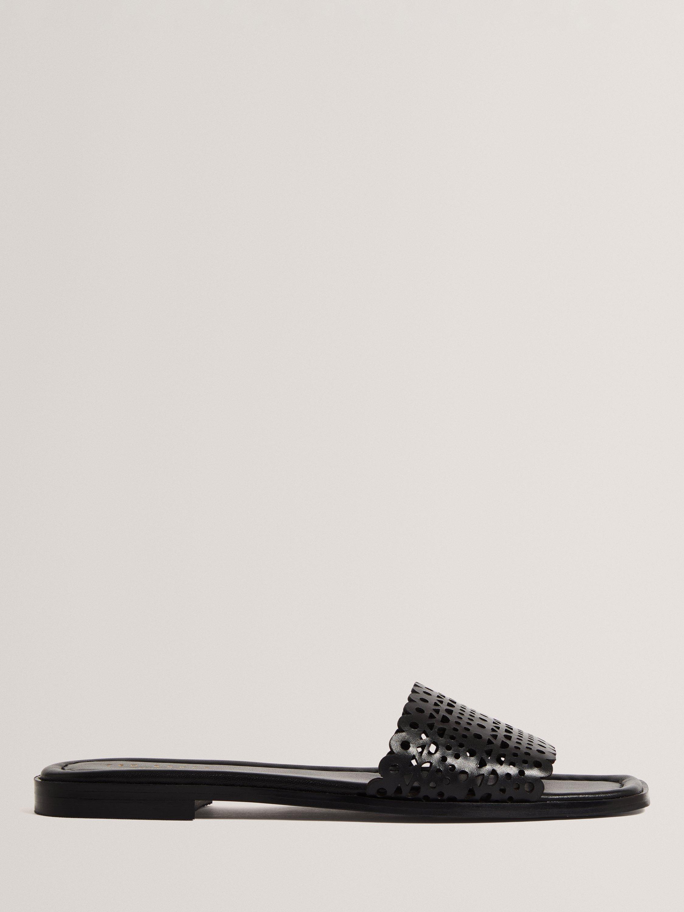 Ted Baker sliders, crafted from soft leather with laser cut details, an open toe and flat footbed design for daylong comfort.