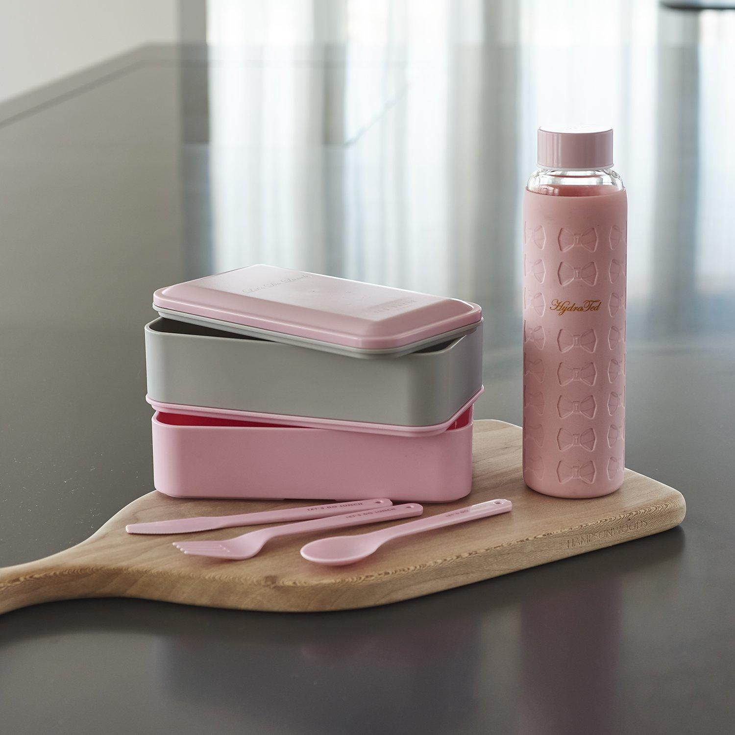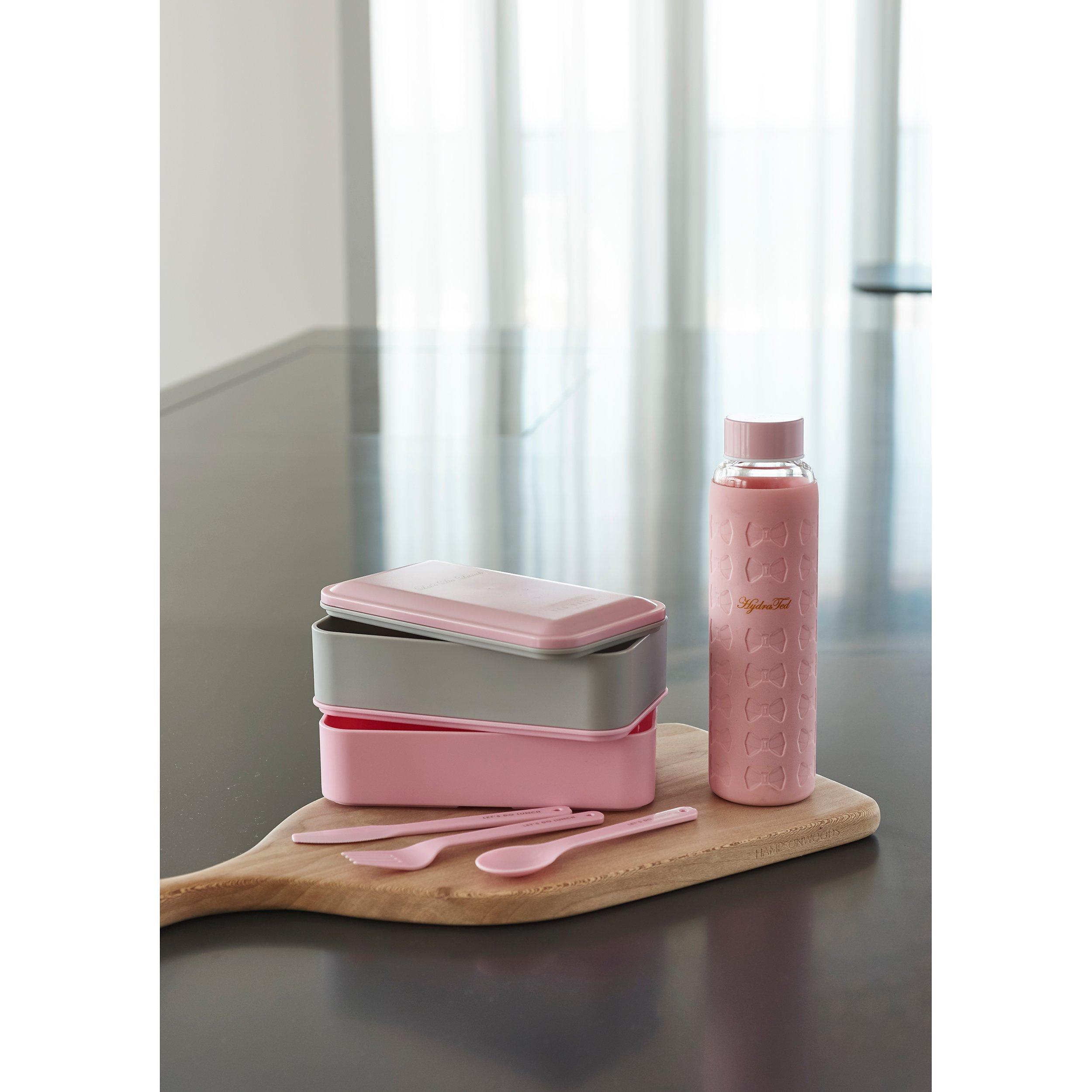 This practical accessory includes two tiers of food space in a pink and grey colour scheme. Secure the stack shut with the elasticated rose gold strap, ideal for keeping foods fresh. Tuck in with the pink plastic cutlery set, including a knife, fork and spoon, with the words 'Let's Do Lunch' imprinted on each cutlery piece. Impress in the staff room or the canteen with this stylish stack, an essential item for everyday use. Dishwasher safe.