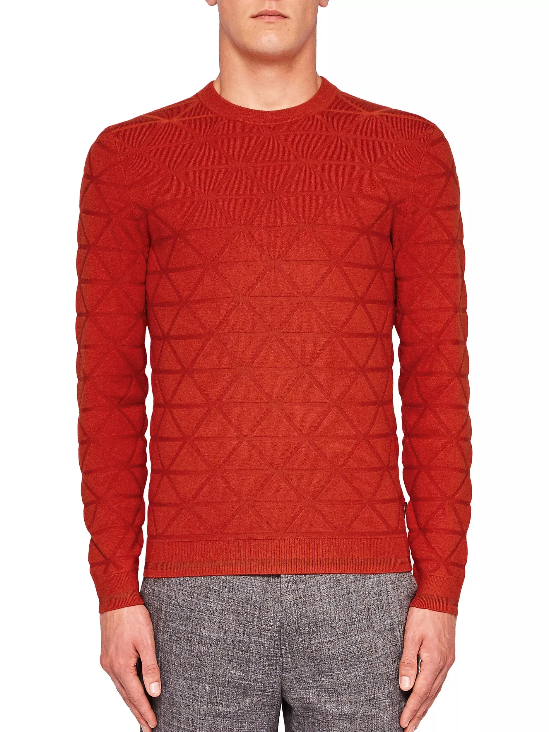Intricately knitted from a soft-to-touch fabric with a hint of stretch to create the classic crew neckline and long sleeve style with a textured triangle pattern.