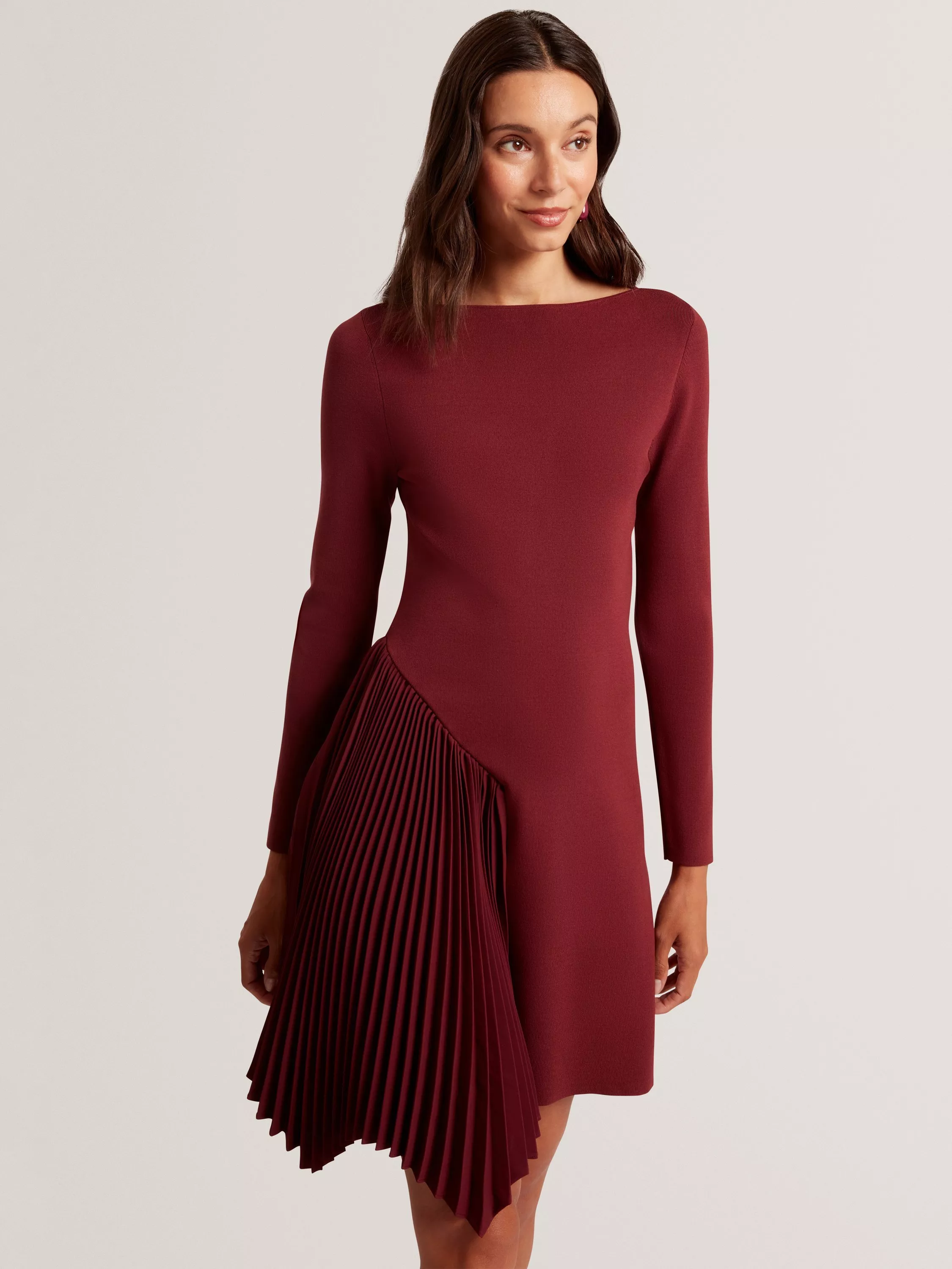 This mini dress flatters every move with its fit and flare shape, playful pleats, and clever textured finish. The boat neck and long sleeves deliver comfort for any occasion.
