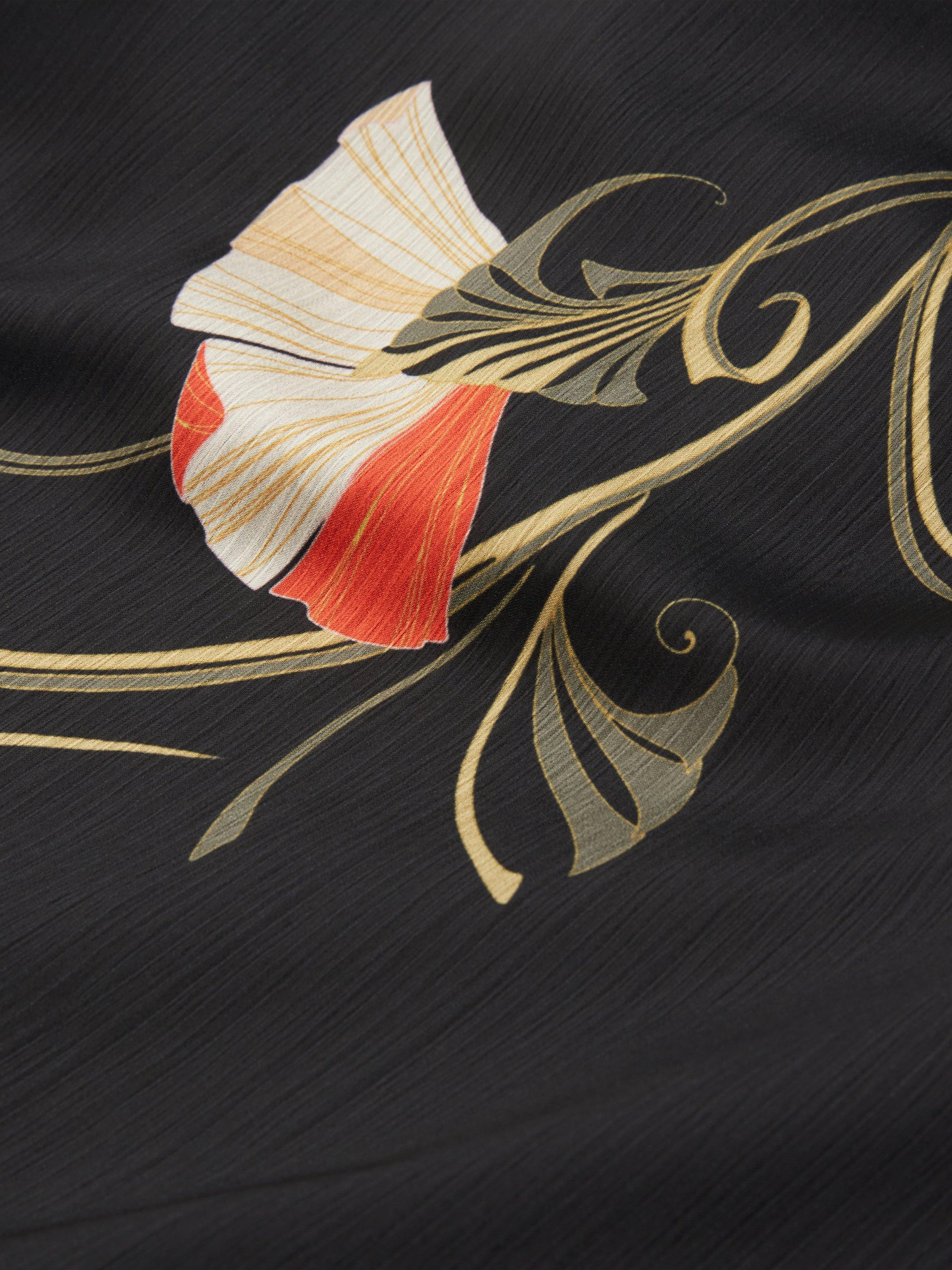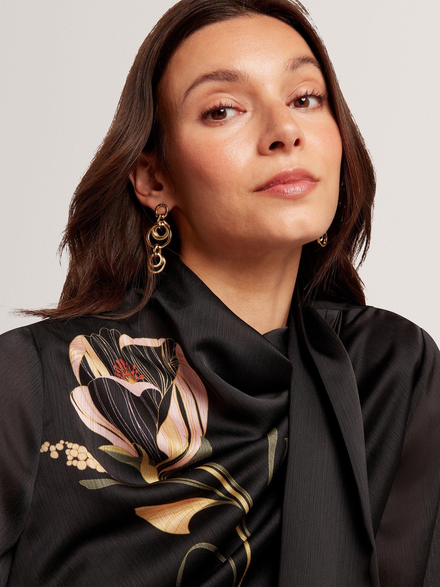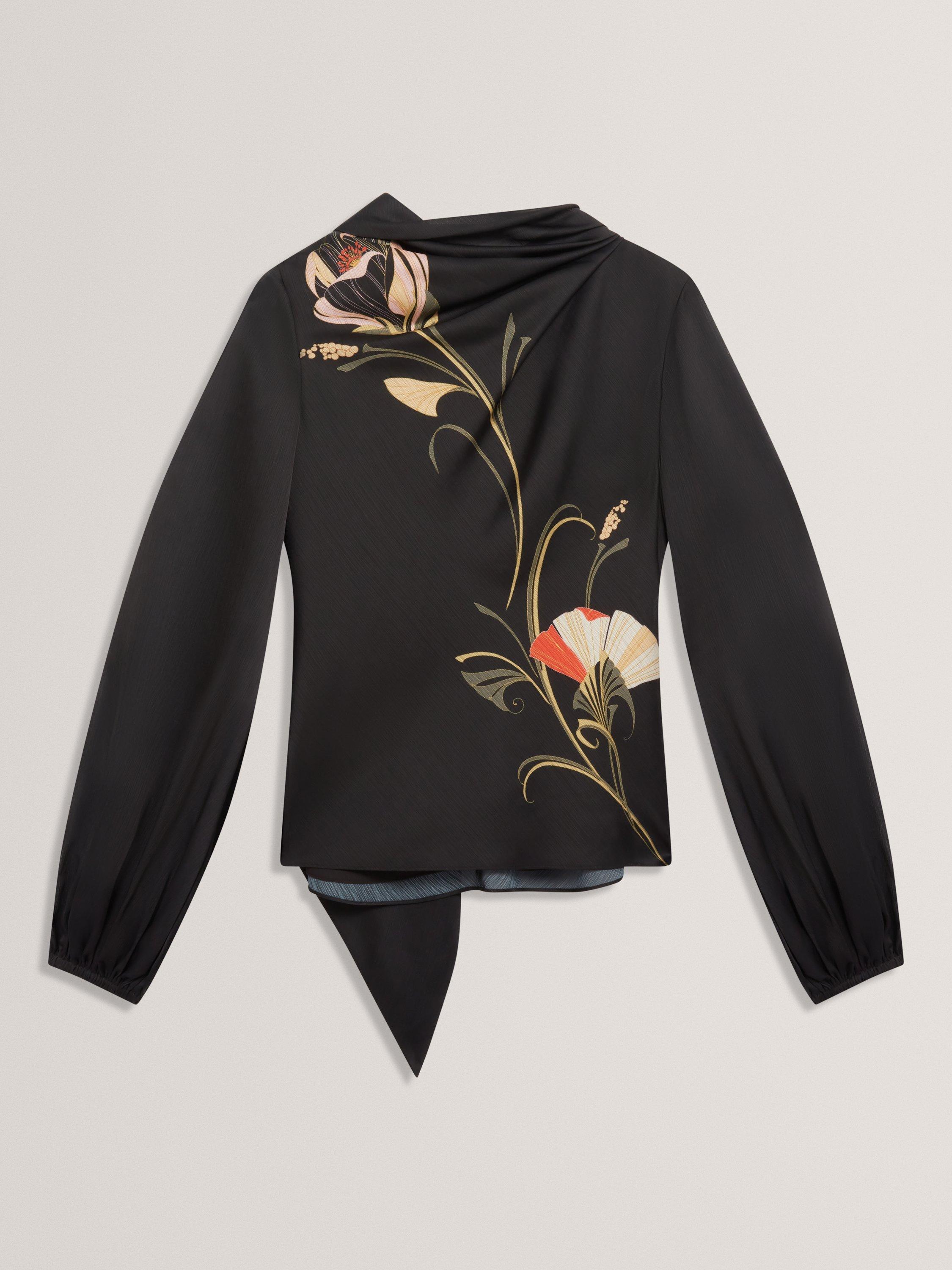 This blouse takes you from day to night with ease, pairing a lively floral pattern with a playful wrap-around neck. Soft balloon sleeves and a silky satin fabric add charm.
