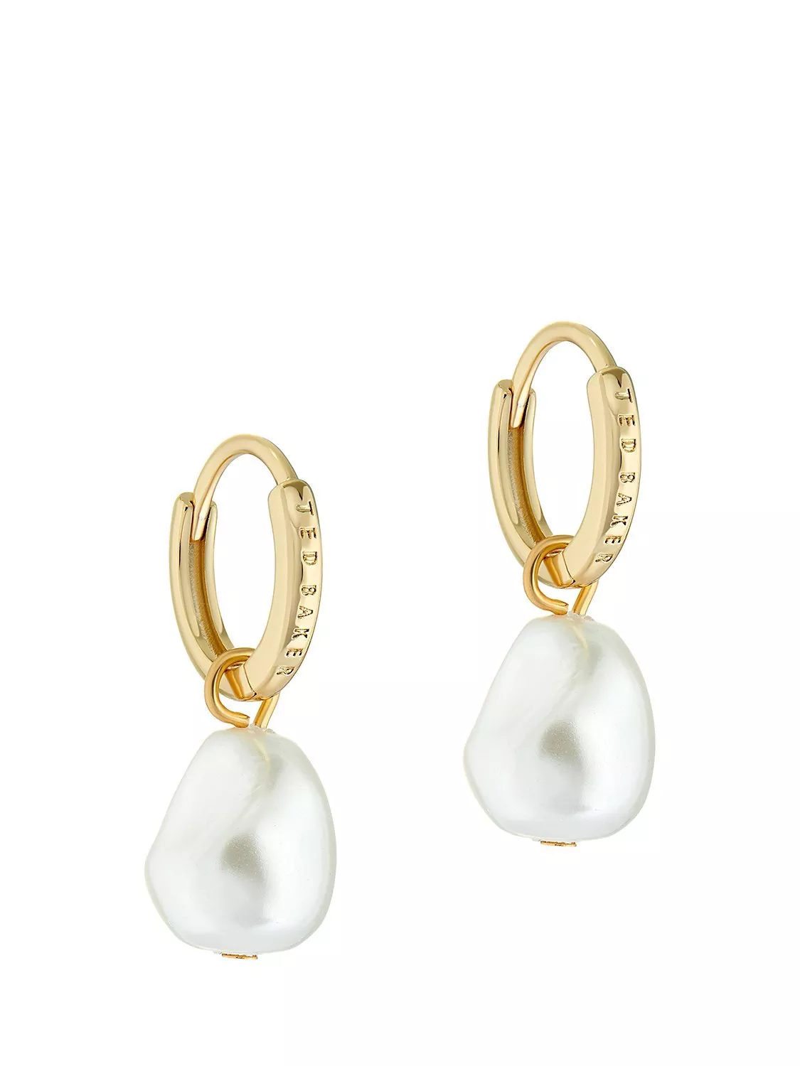 TED BAKER DESIGN: These huggie earrings feature a luminous white pearl drop, adding timeless elegance to your look and making them versatile for day-to-night wear. The laser-engraved Ted Baker branding adds an understated touch of luxury.