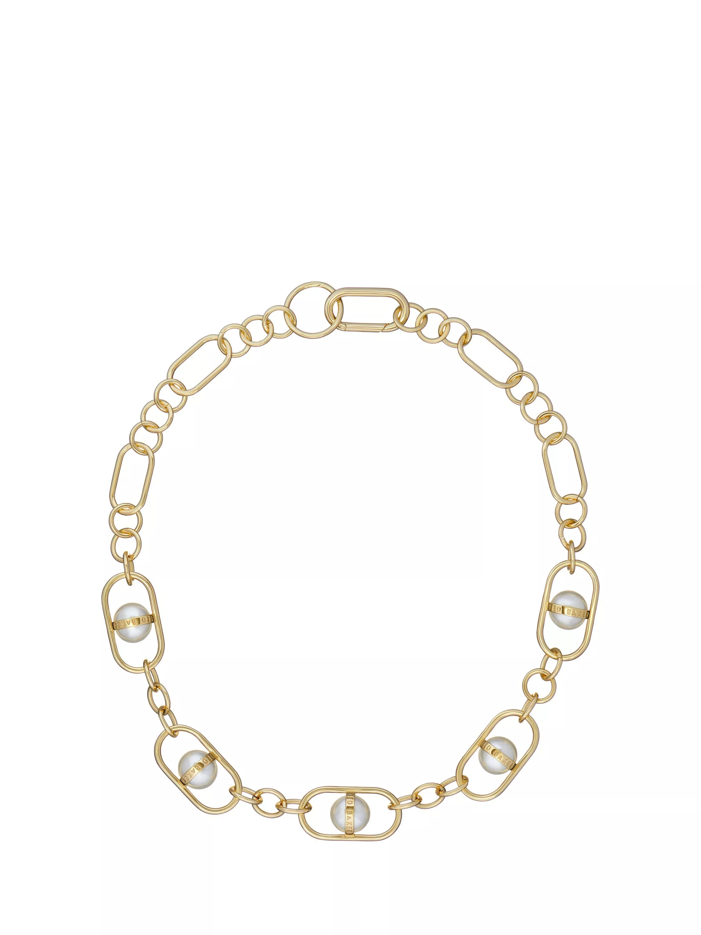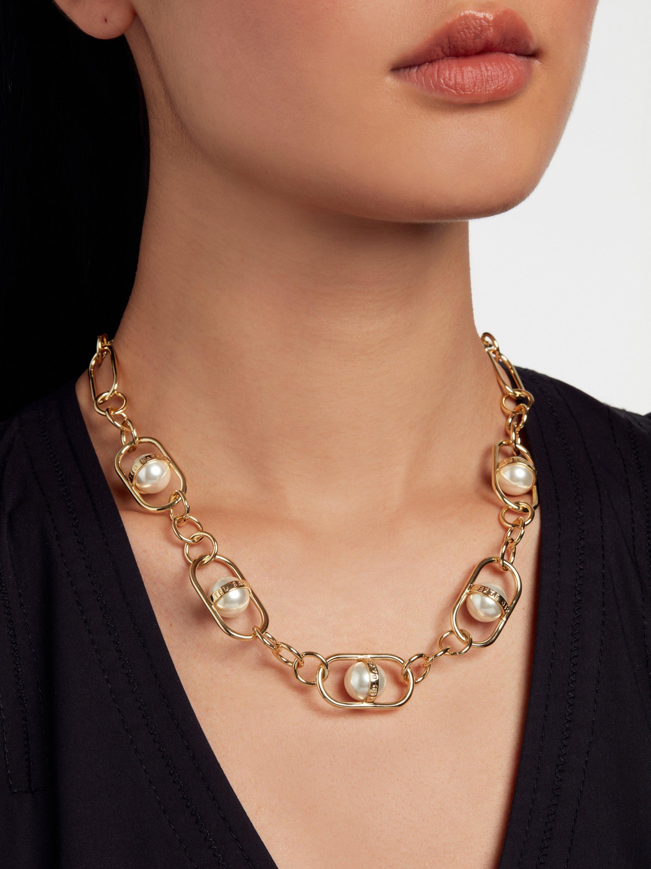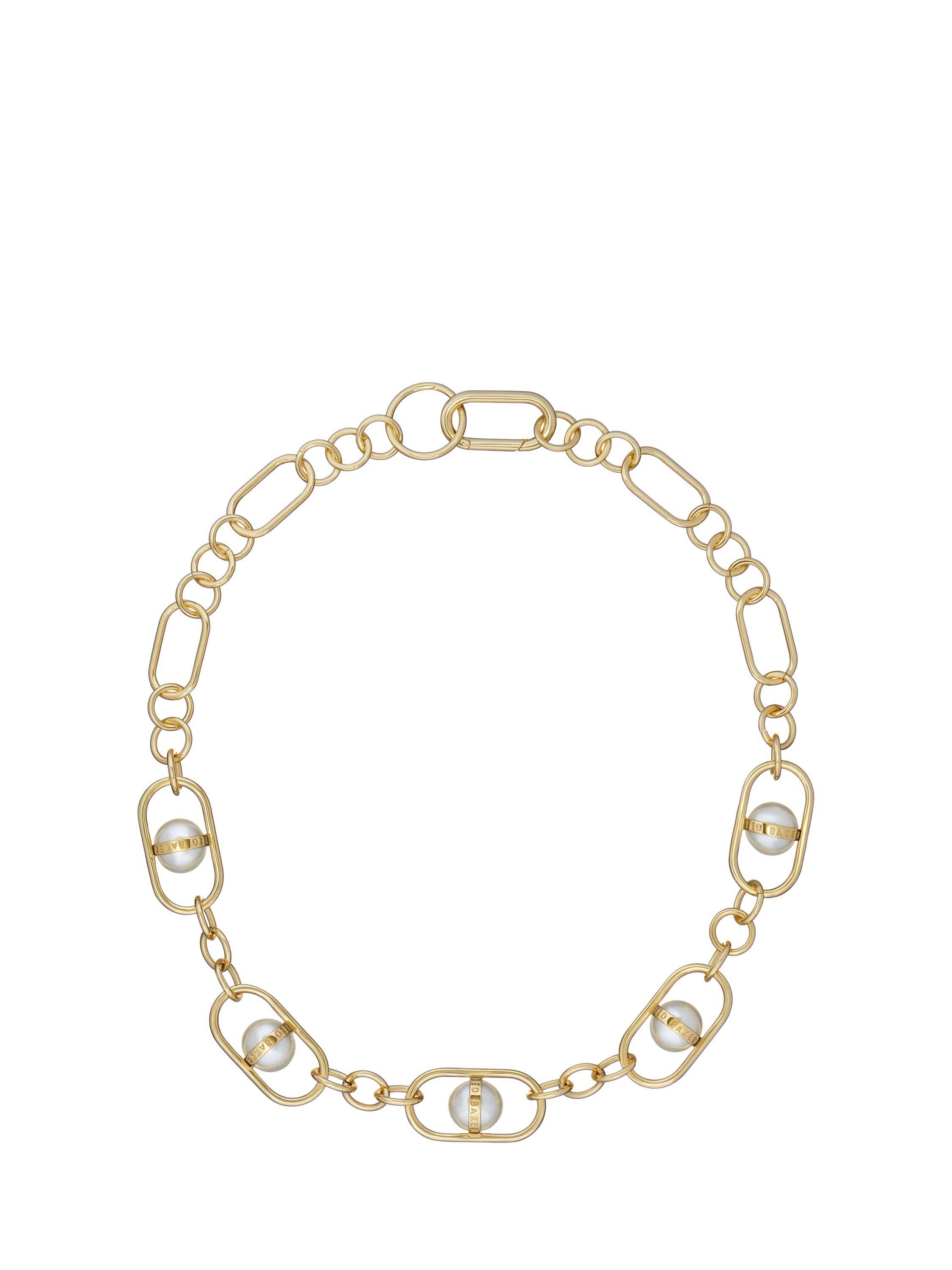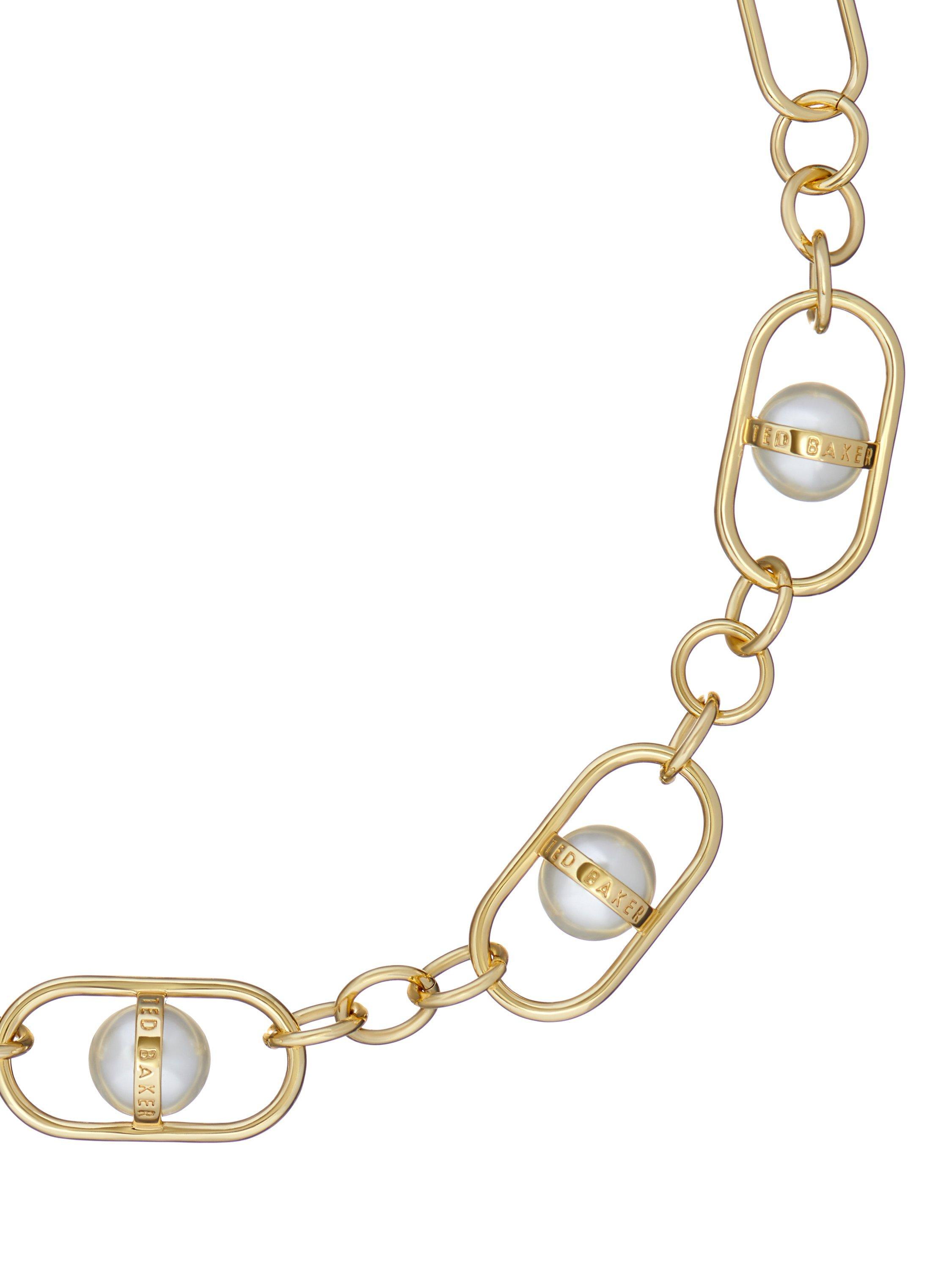 An optical illusion design with a faux pearl appearing to float, suspended with a bespoke Saturn ring chain link, finished with gold-tone plating. Featuring a discreet carabiner clasp for secure wear and packaged in an elegant Ted Baker branded gift box.