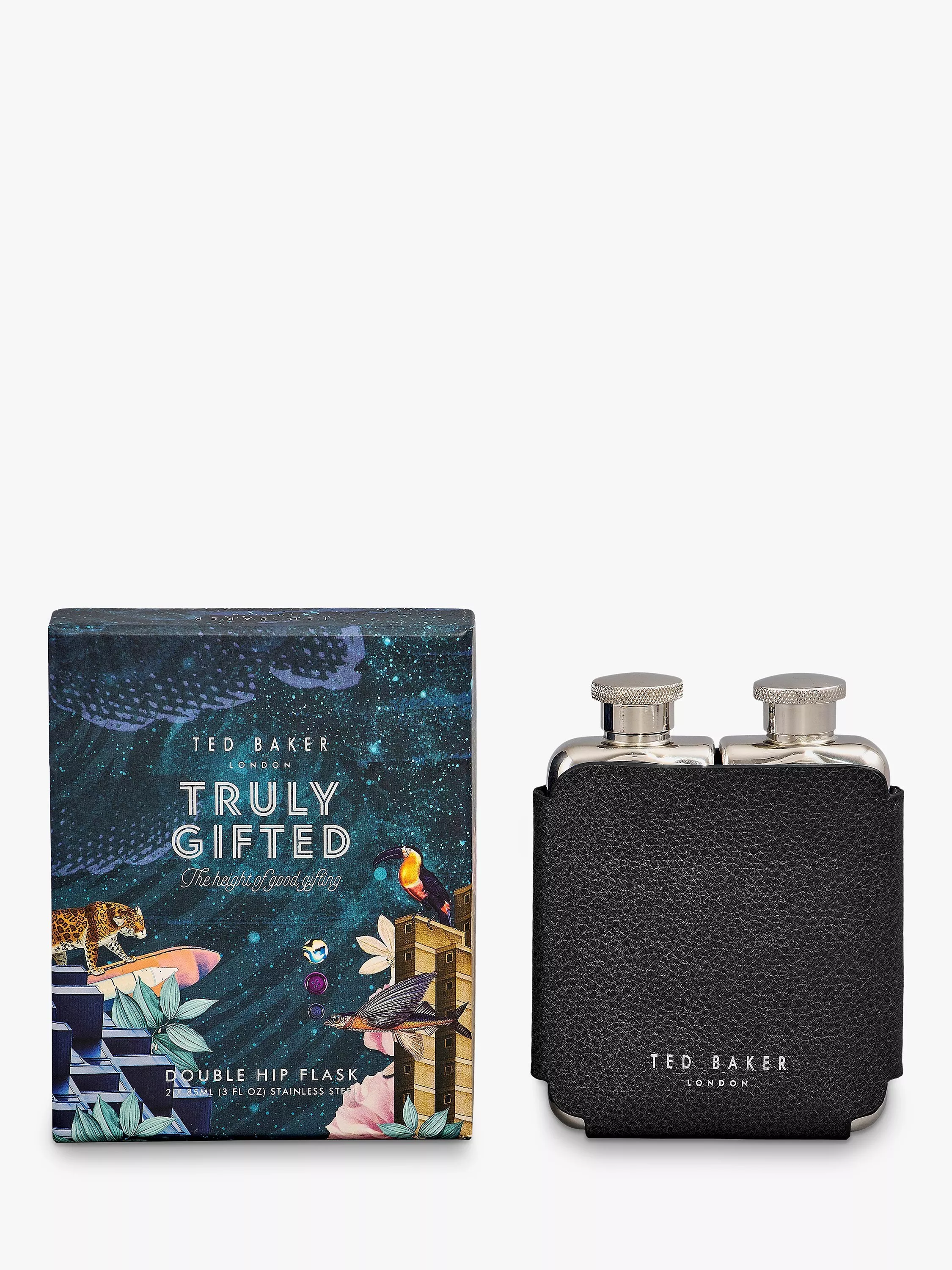 Featuring 2 x 85ml compartments, each one has a chunky screw-top lid. The body of the flask is encased in a stylish black faux-leather case. This flask carefully combines traditional style with a modern shape, and will certainly make a stellar gift! Packaged in 'Truly Gifted' Ted's World illustrated gift box.