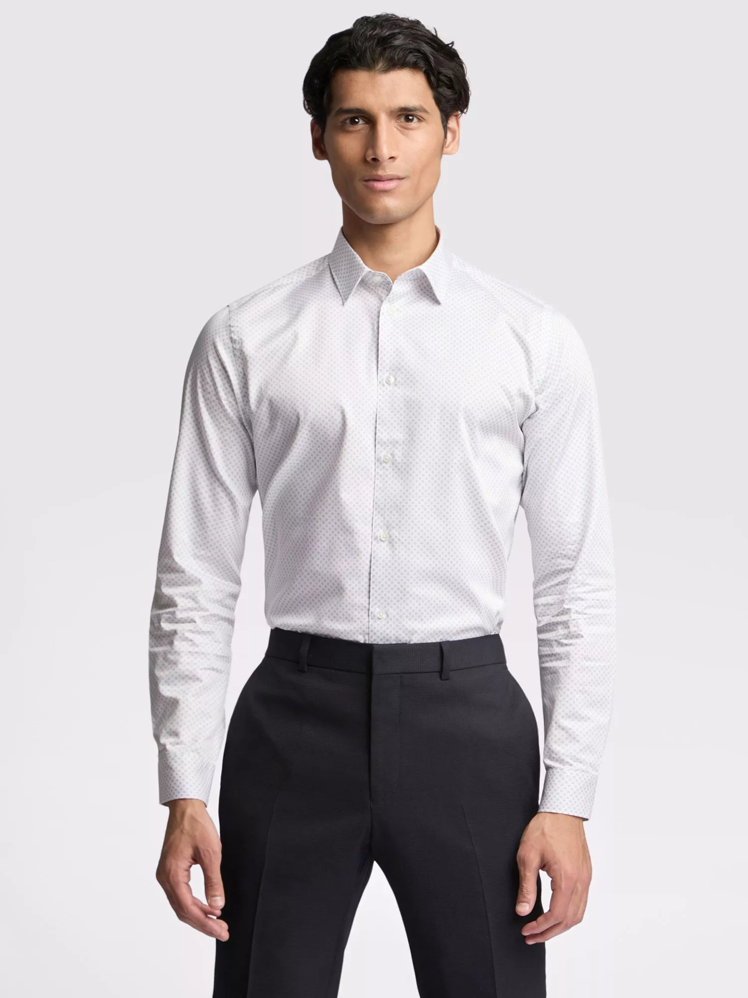 Introduce prints into your formal wardrobe with this light-blue micro diamond print on a soft white base from Ted Baker. This slim-fitting design features a single cuff, forward-point collar, contrasting fabric to the back neck and inner cuff, and is complete with Ted Baker’s signature embroidery to the inner placket.