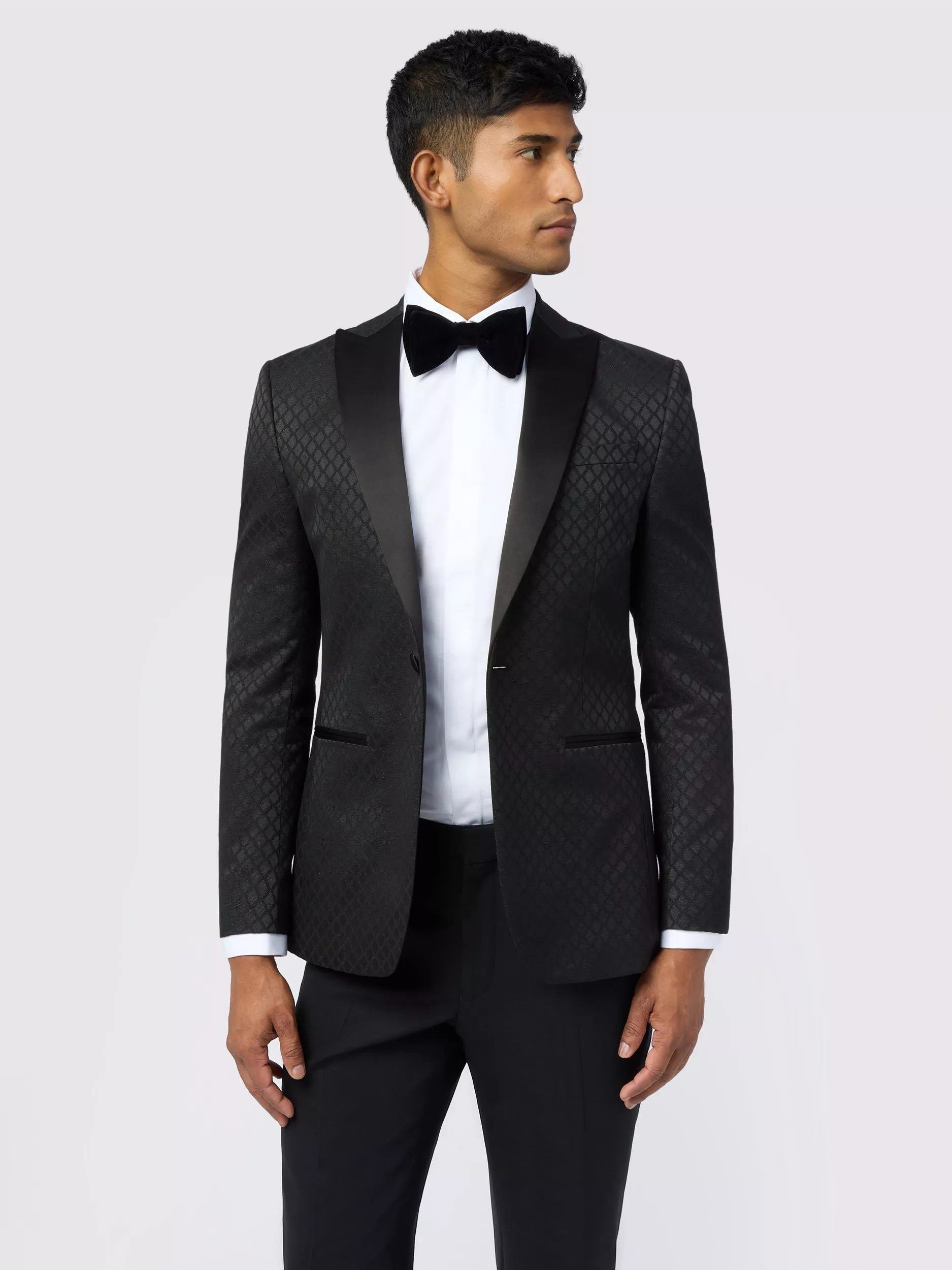 This blazer features a luxurious jacquard weave with a diamond design and subtle sparkle. The Ted Baker slim fit provides structure through the shoulders and chest, while the satin peak lapel and satin cuff buttons provide elegant contrast detailing, perfect for a wedding or black tie event. The jacket is finished with Ted Baker’s leaf print lining. Pair with black tuxedo trousers for the perfect wedding or black tie look.