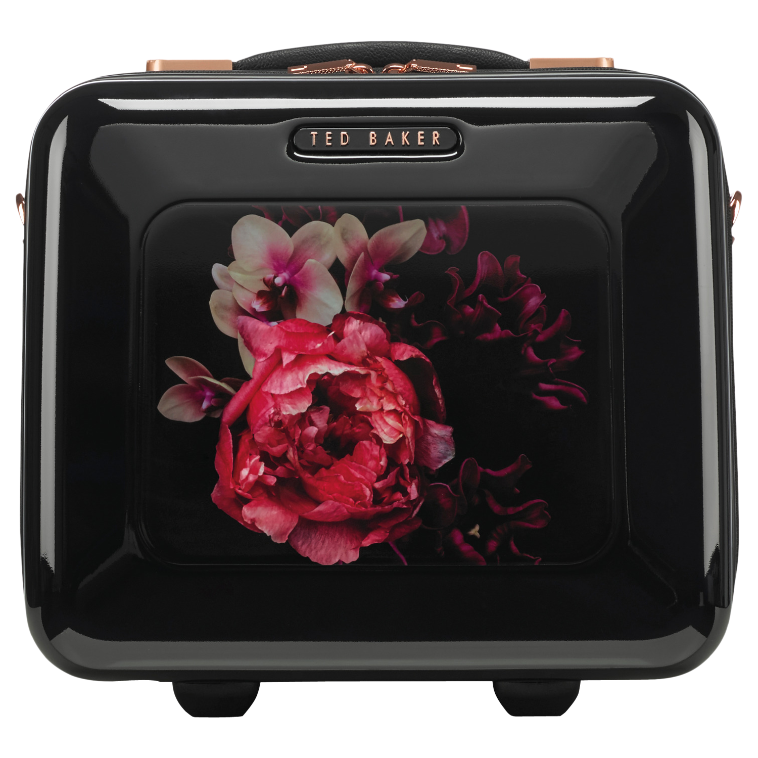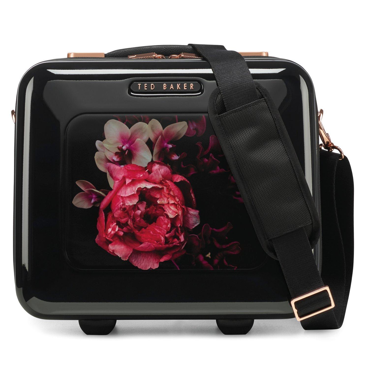 Tote your beauty kit around in this stylish and ultra-lightweight polycarbonate vanity case by Ted Baker.Boasting a unique and distinctive floral print, the case has a shoulder strap with full bespoke Ted Baker hardware in rose gold. This lightweight piece has signature lining and a trolley sleeve to complete the look.