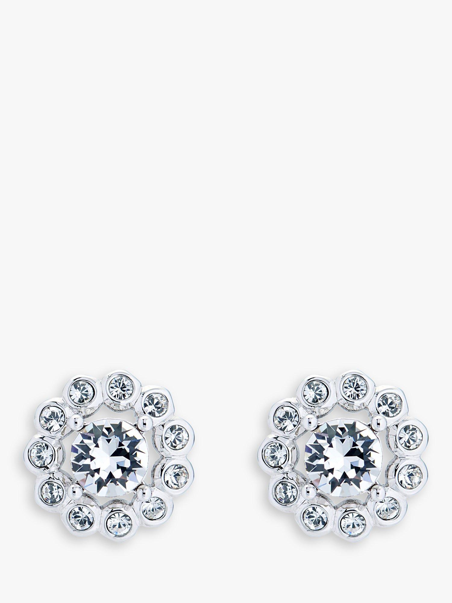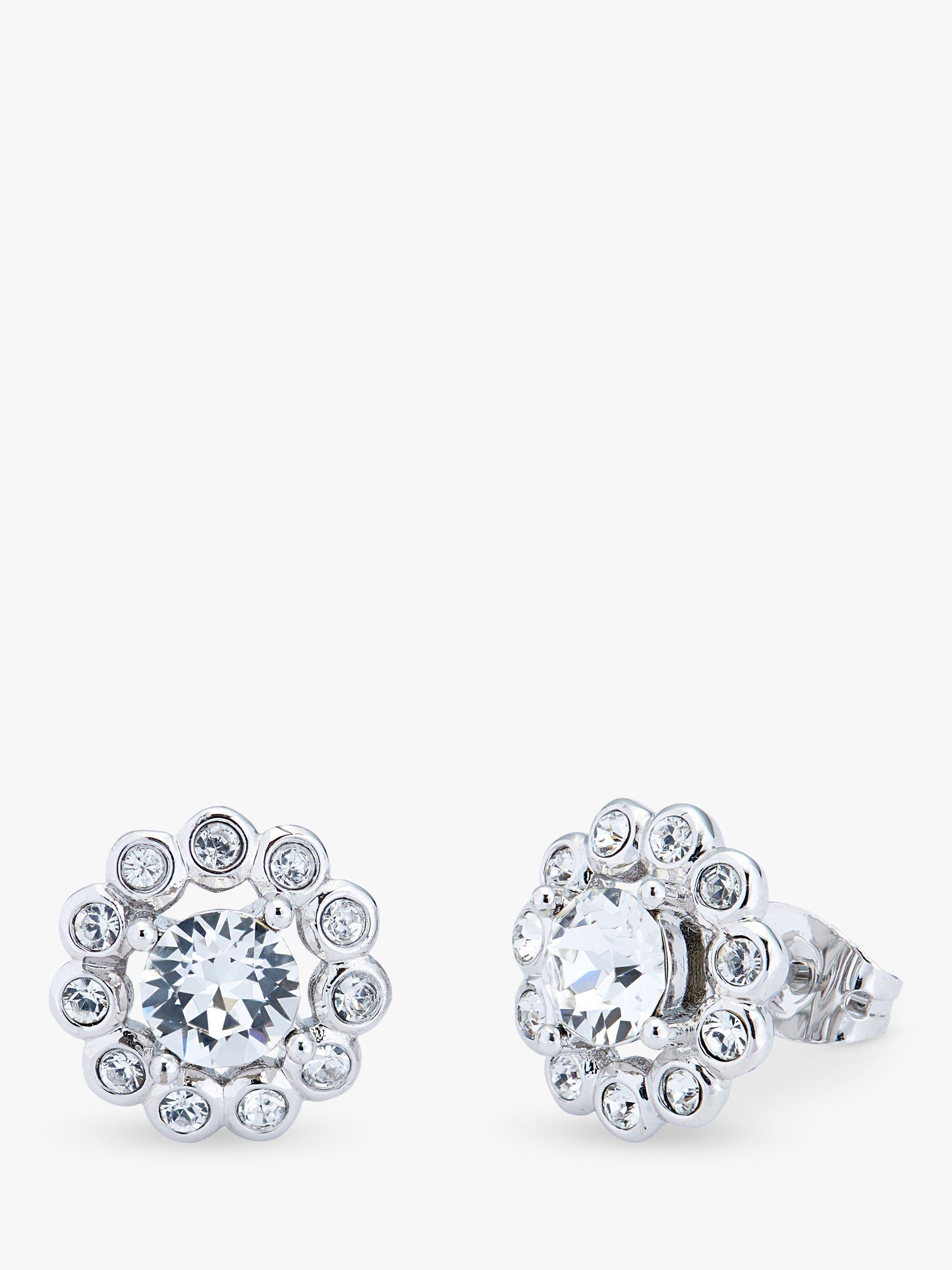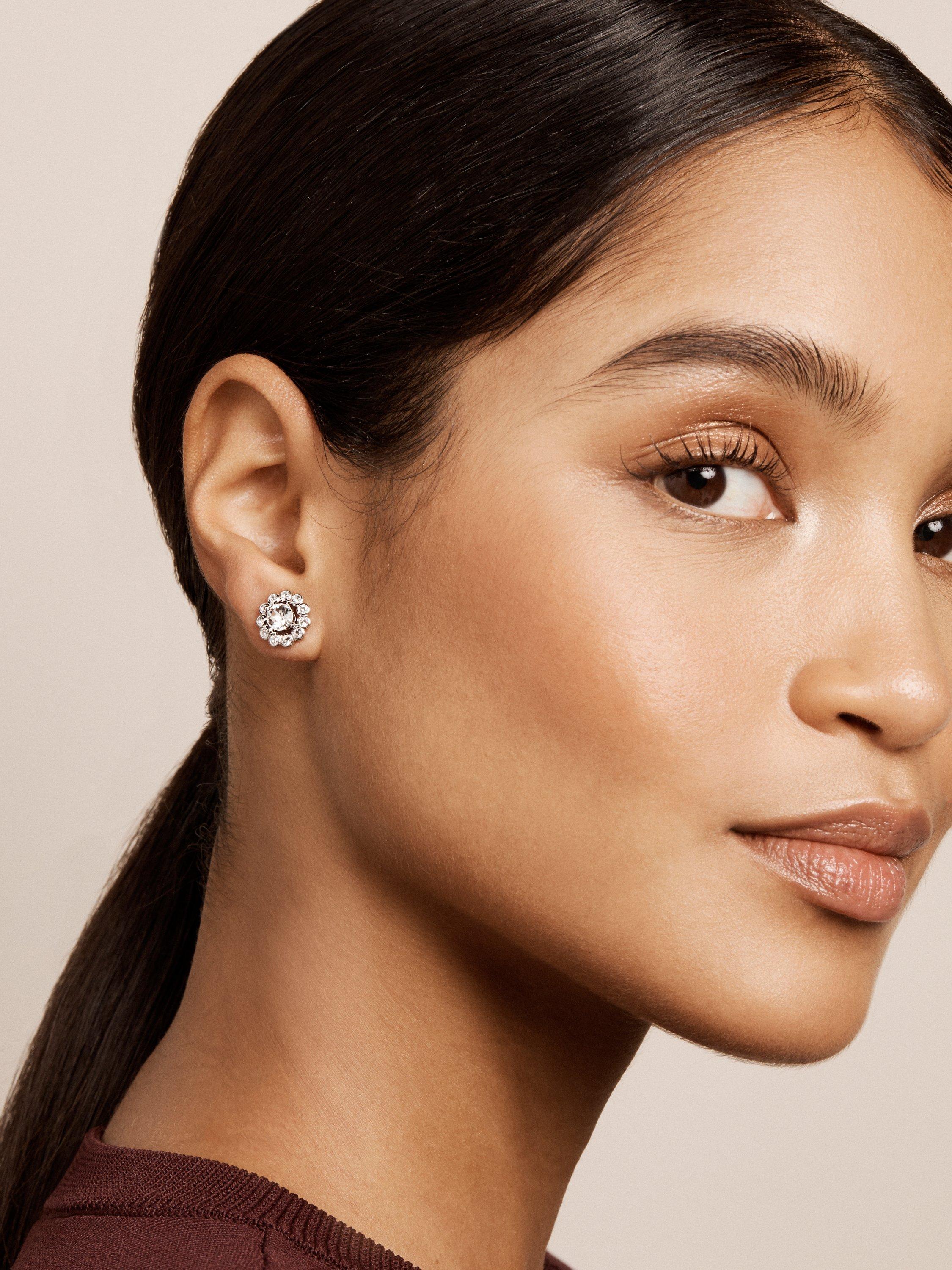 Designed with a faceted central crystal and surrounded by smaller stones creating a radiating arrangement, the pair evokes a contemporary floral shape. The earrings are for pierced ears only.