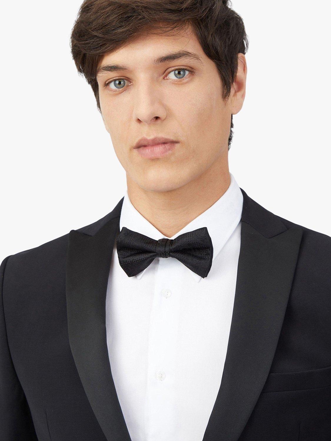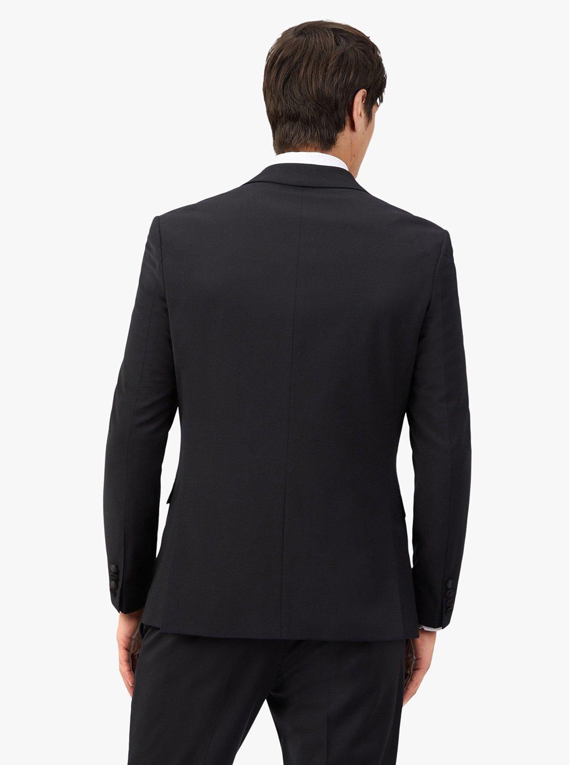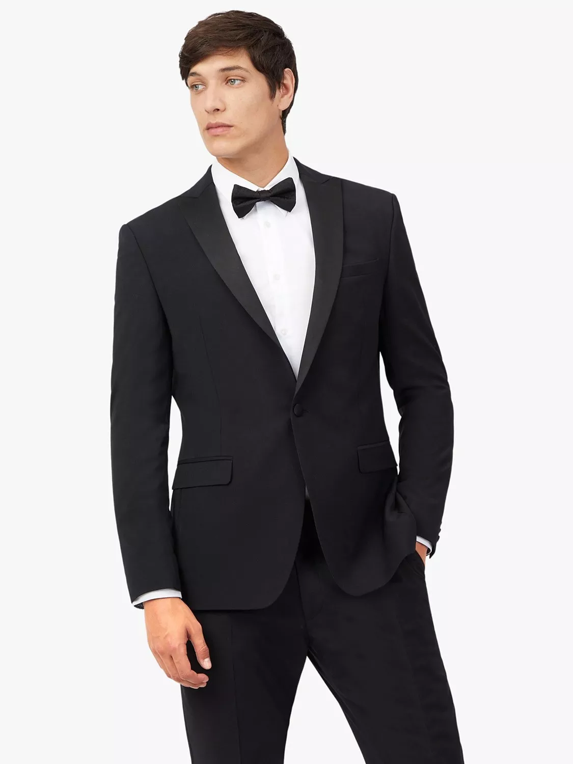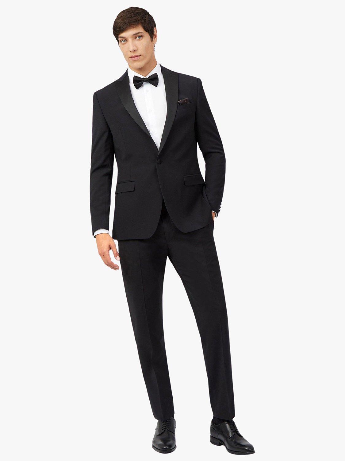 The ultimate classic: the black tuxedo by Ted Baker. This slim-fit style is the perfect staple for anyones wardrobe. With a satin peak lapel, one-button fastening, and in-built pocket square this suit jacket is your perfect go-to. Just pair with the matching suit trousers for a bold and sophisticated look.