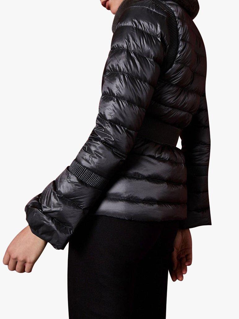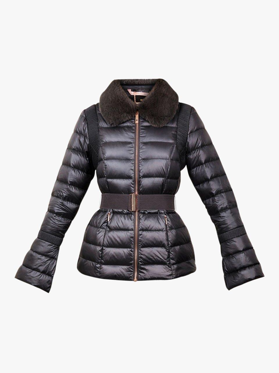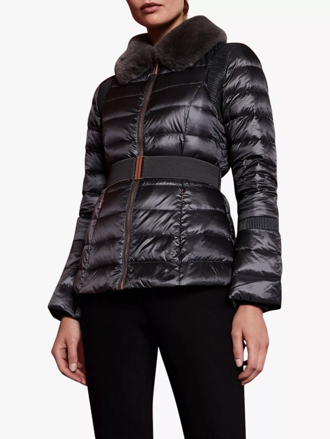 Crafted from an insulating down-filled blend, this jacket boasts a classic quilted design for a voluminous finish, complete with bell sleeves and faux fur hood to keep you cosy in cooler weather. With a cinched in waist belt that wraps around the jacket for a flattering silhouette and metallic hardware for a statement look.