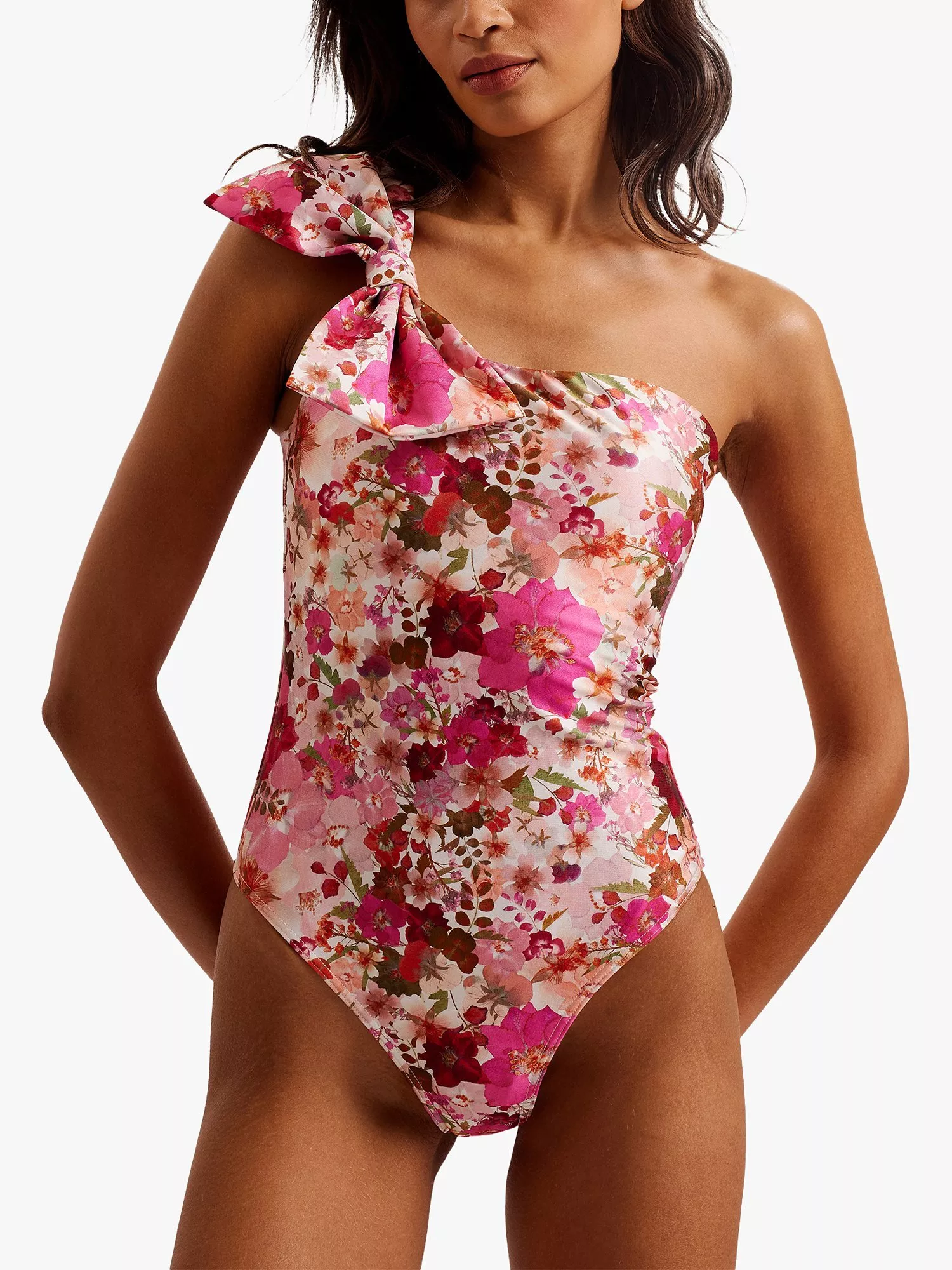 Graced with intricate florals all-over, this one shoulder swimsuit from Ted Baker features an oversized bow detail.