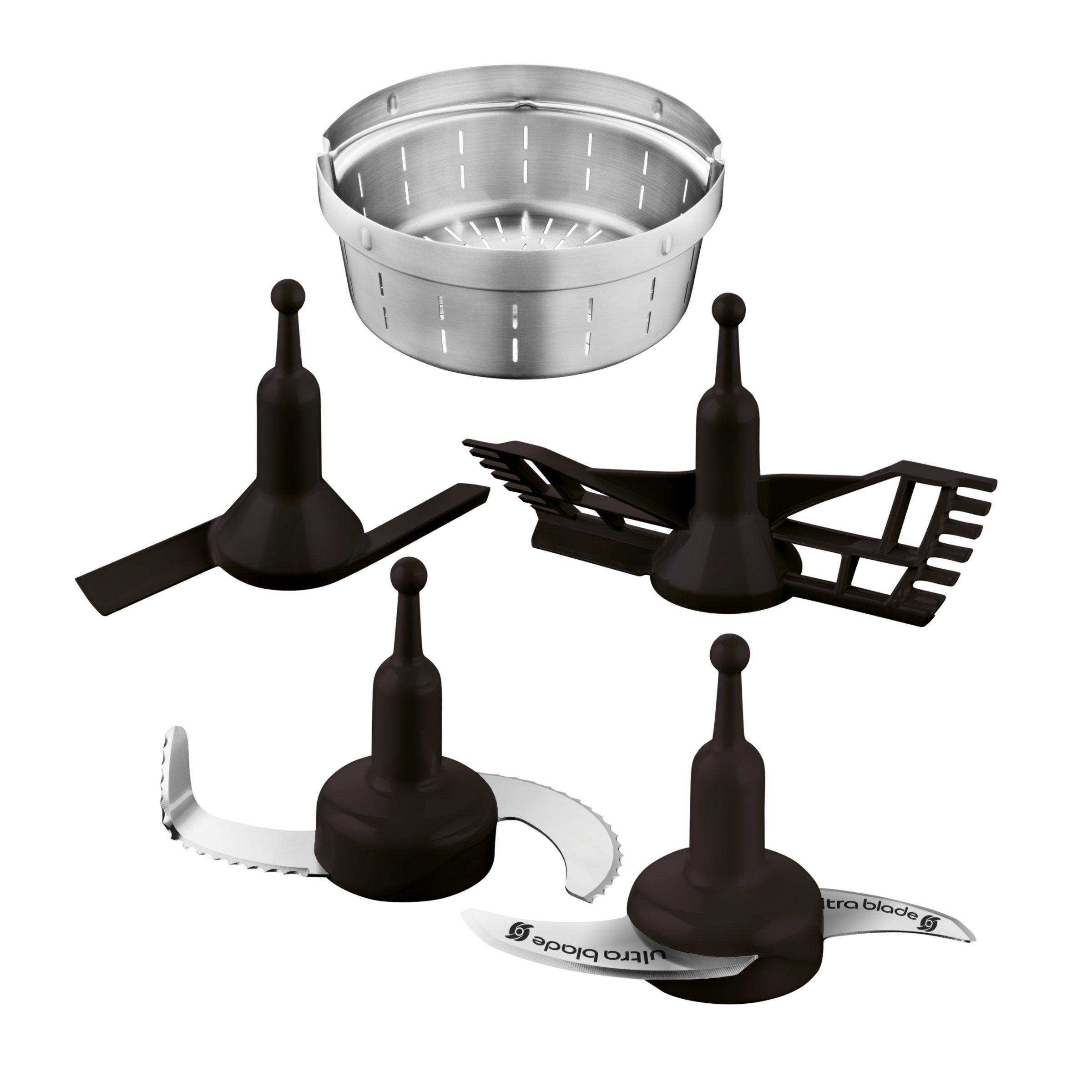 - Stainless steel Ultrablade, stirrer, whisk, stainless steel kneading/crushing blade, stainless steel steamer basket (2L), spatula and cleaning tool