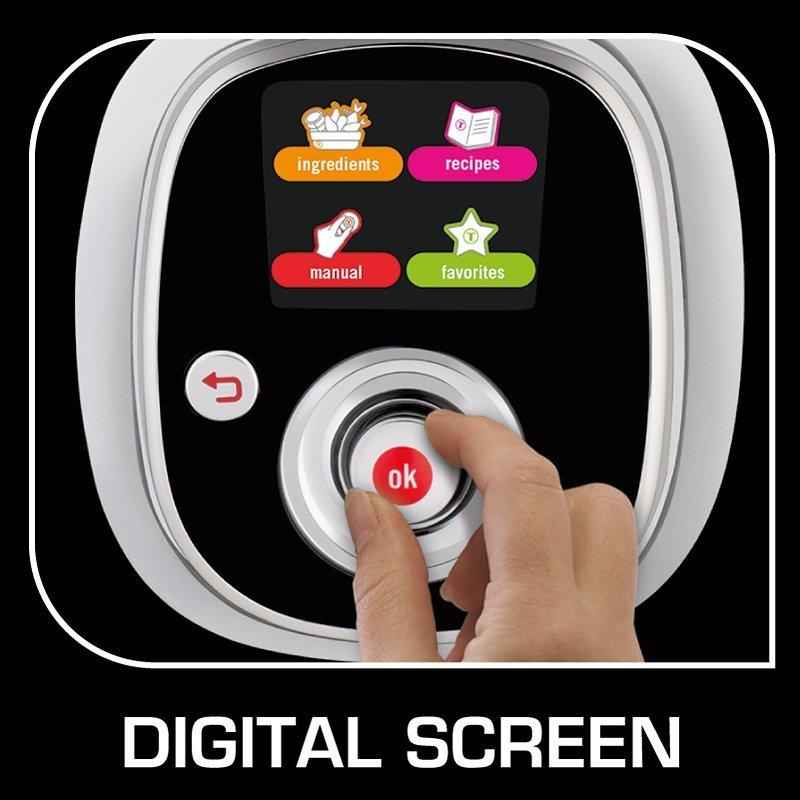 With its digital screen, the Cook4me guides you to cook your meals perfectly according to the ingredients, their weight and the amount of people you're cooking for. To cook a specific ingredient, simply select it on the digital screen, click and the Cook4me cooks it for you.