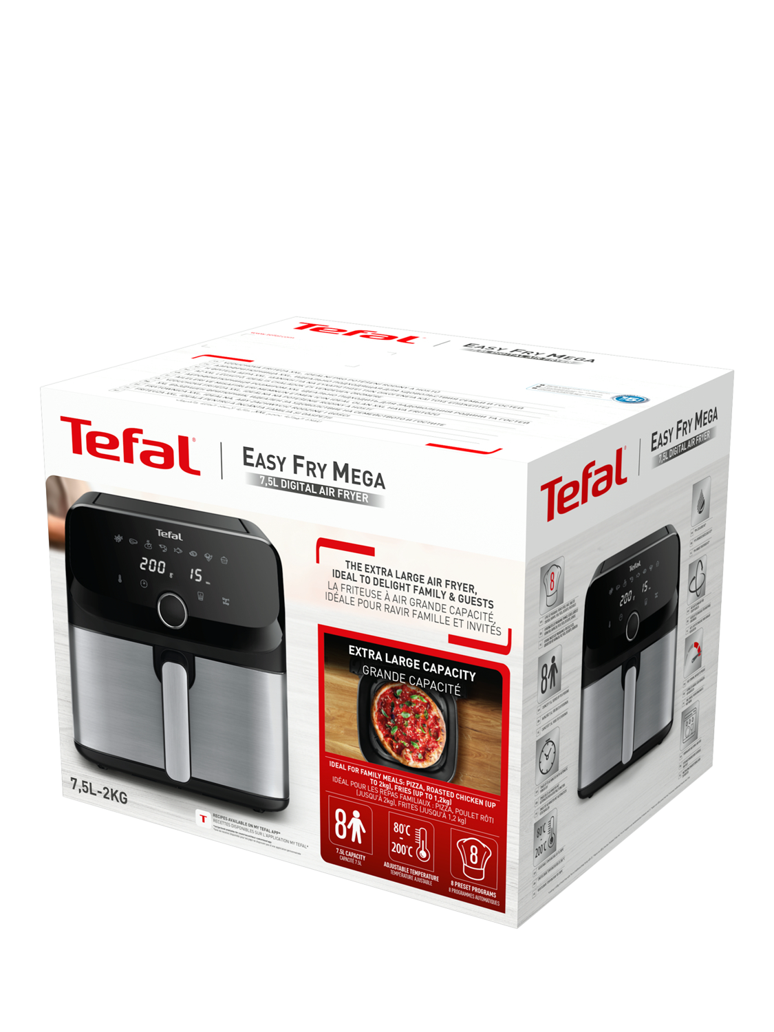 - Easy Fry Mega, Air fryer, Extra-Large Capacity 7.5 L, 8 Preset Programs EY855D40