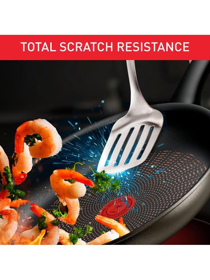 Tefal ProTech cookware is hard-wearing and can hold up to intensive daily use. Its safe non-stick coating features an extra-thick design that delivers exceptional scratch resistance, even against metal utensils, all except for sharp-edged utensils, knives, forks and whisks.