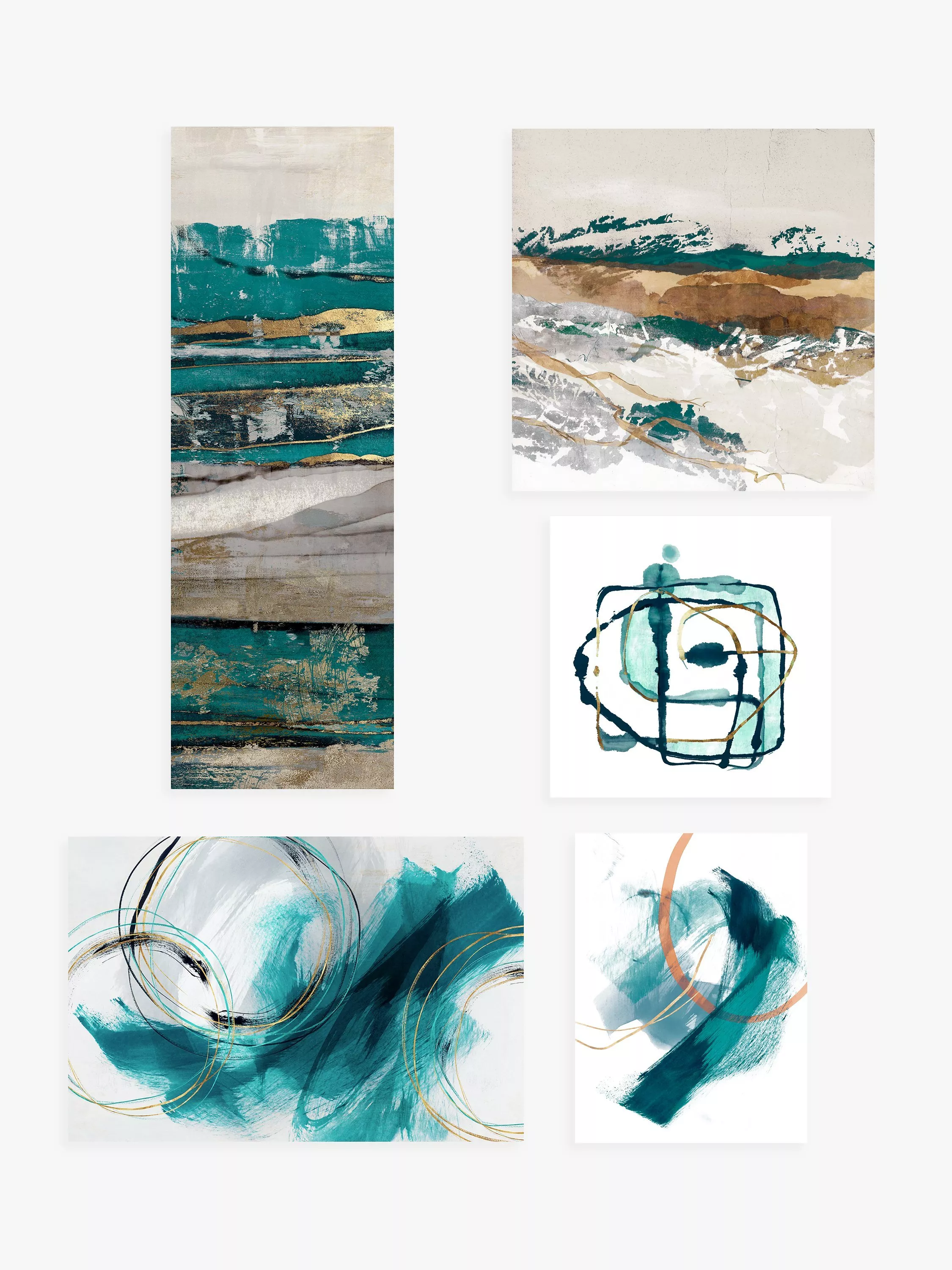 Create a gallery wall of abstract canvas prints. This set comes ready to hang and includes five different sizes in complementary colours and artwork.