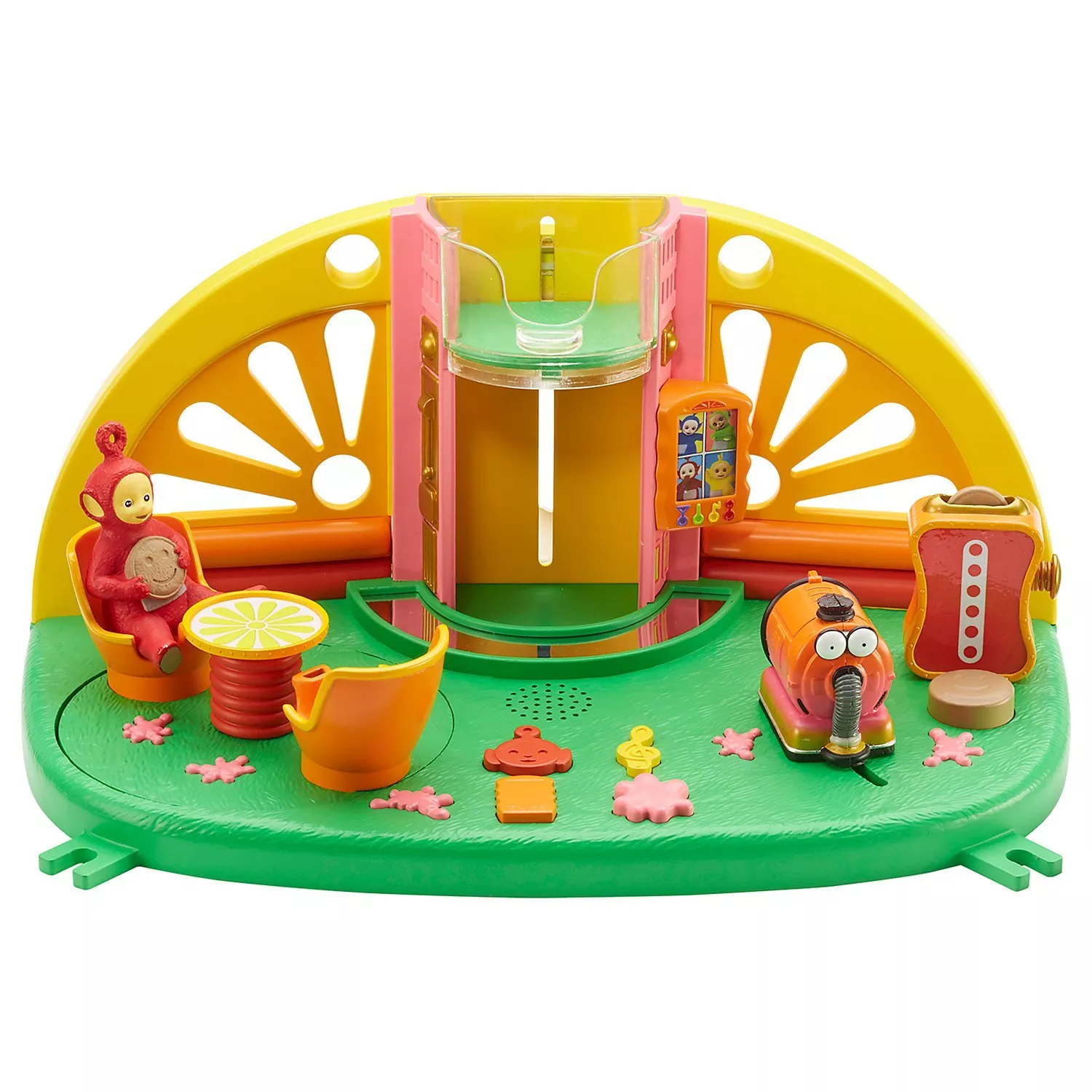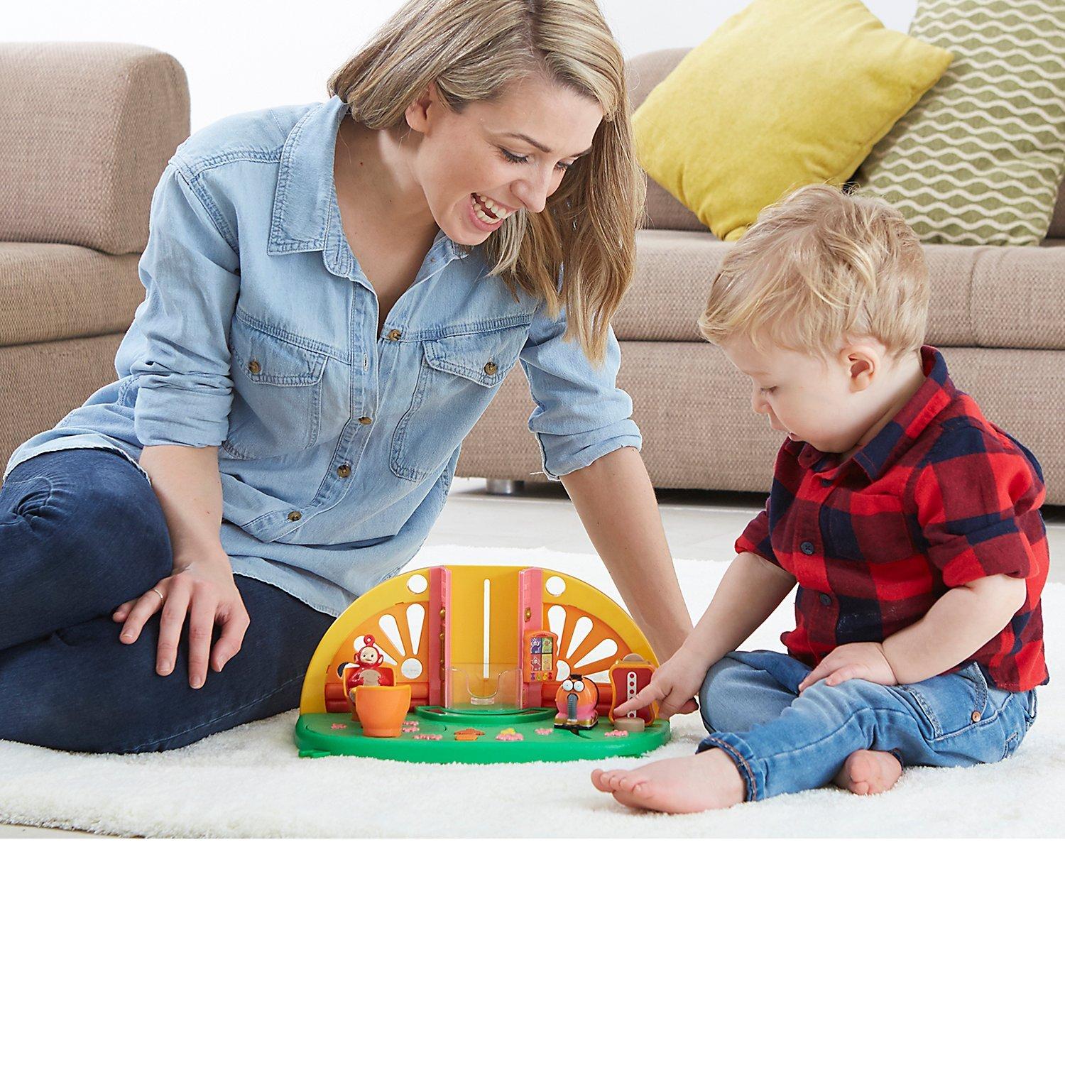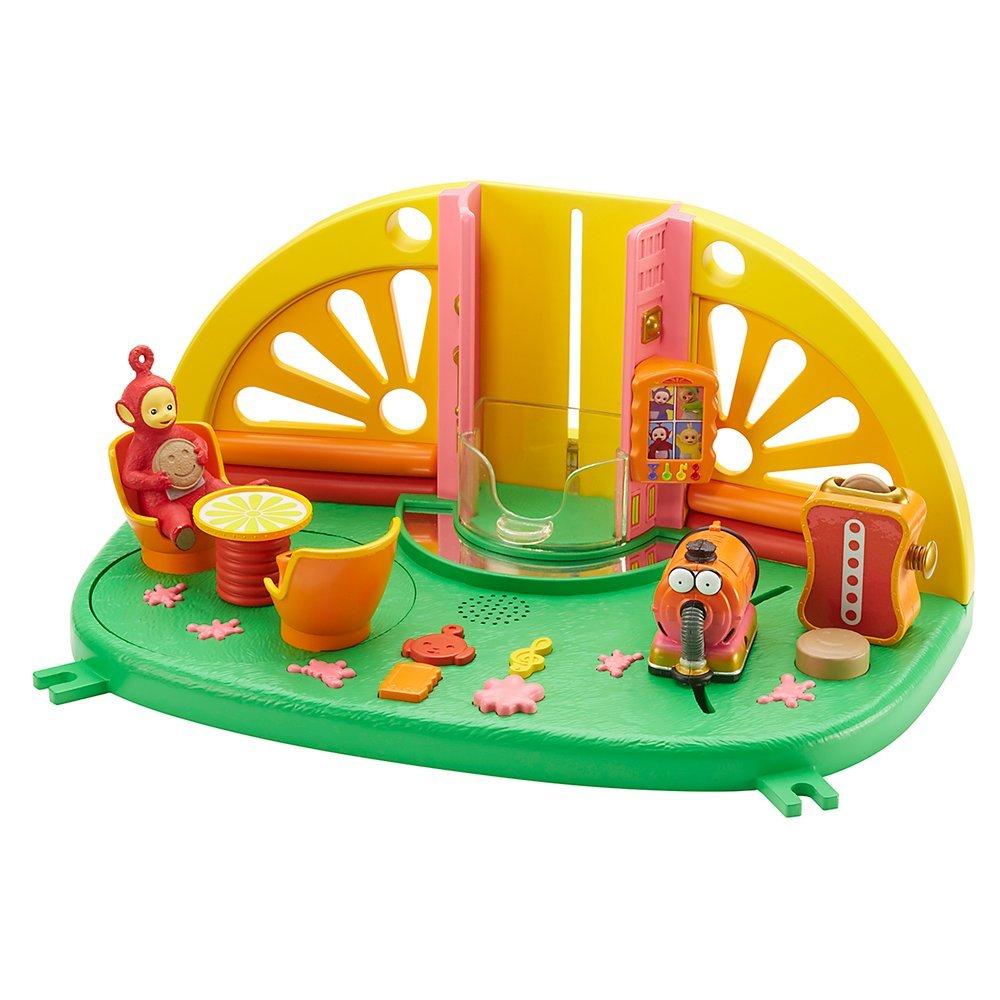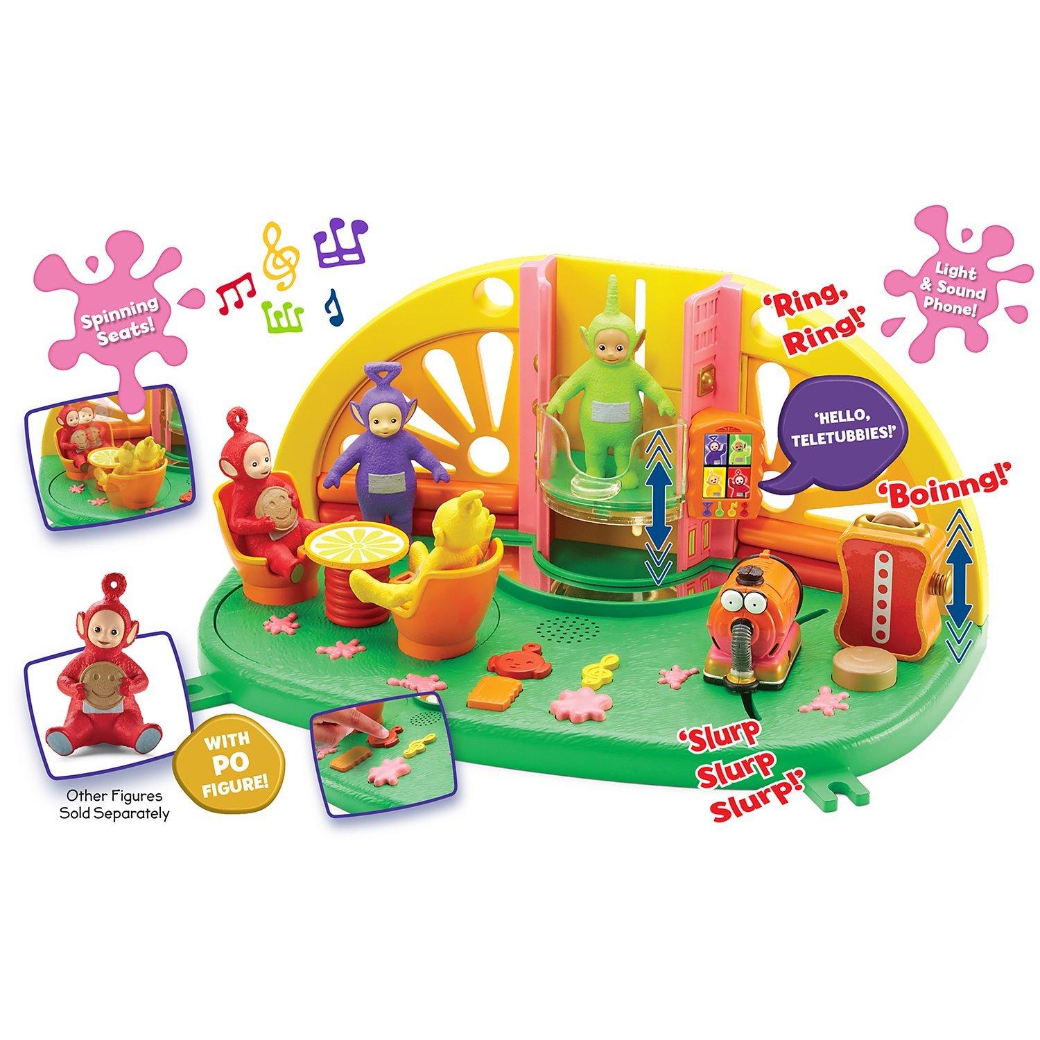 Make Tubby toast with real sound effects, or move Noo-Noo across the floor to hear slurping noises. There's even a Tubby Phone to talk to the Teletubbies, with easy to press buttons for music and custard splat sound effects, as well as a working lift, mirror dance floor, and spinning seats!