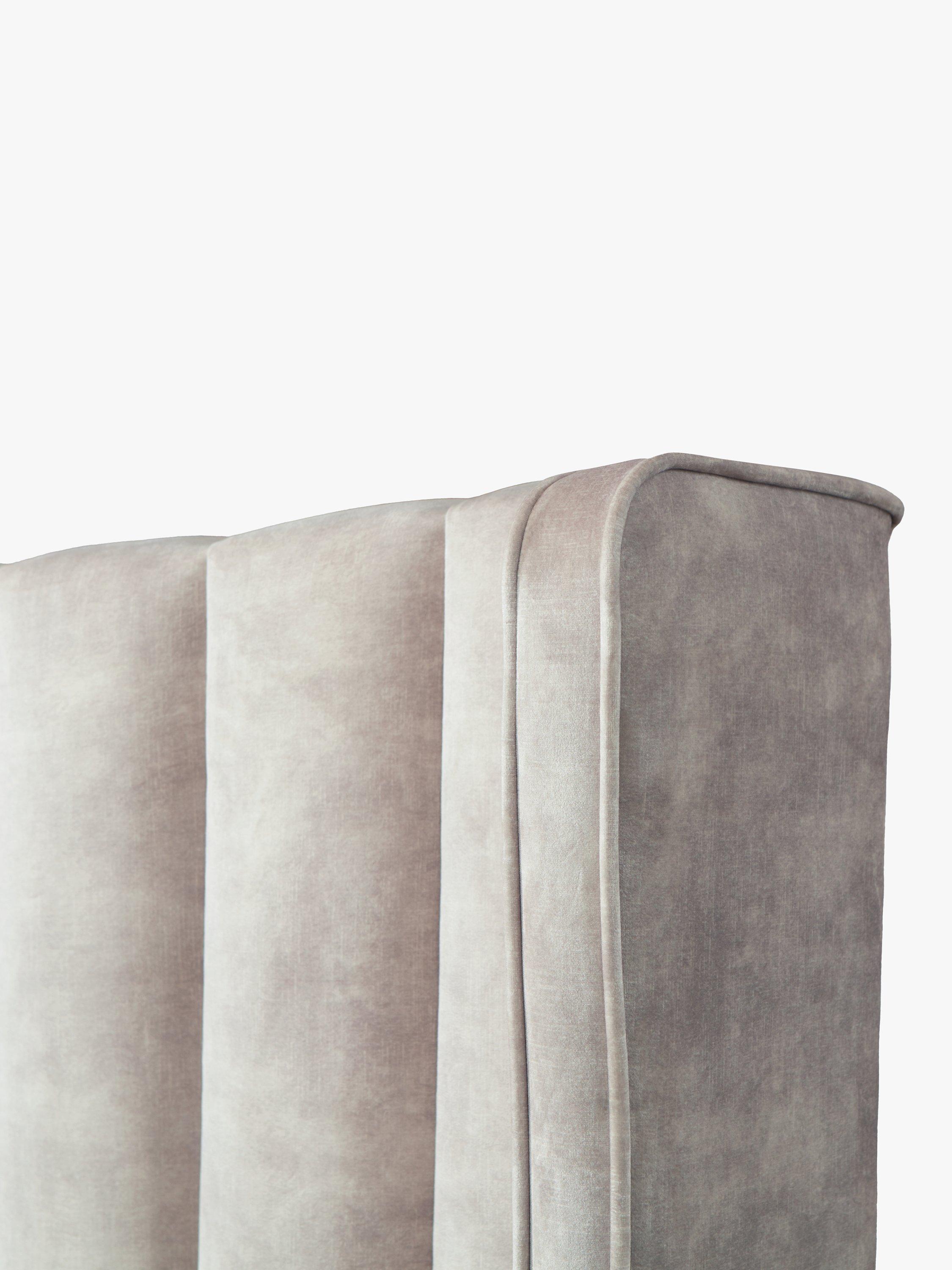 Upholstered in velvet, this striking panelled headboard with winged sides and a slightly curved profile will create a soft, yet regal style in your bedroom. It's a full-depth, freestanding fitting with standard fixings on either side, so it's easy to slot into the back of your divan base.