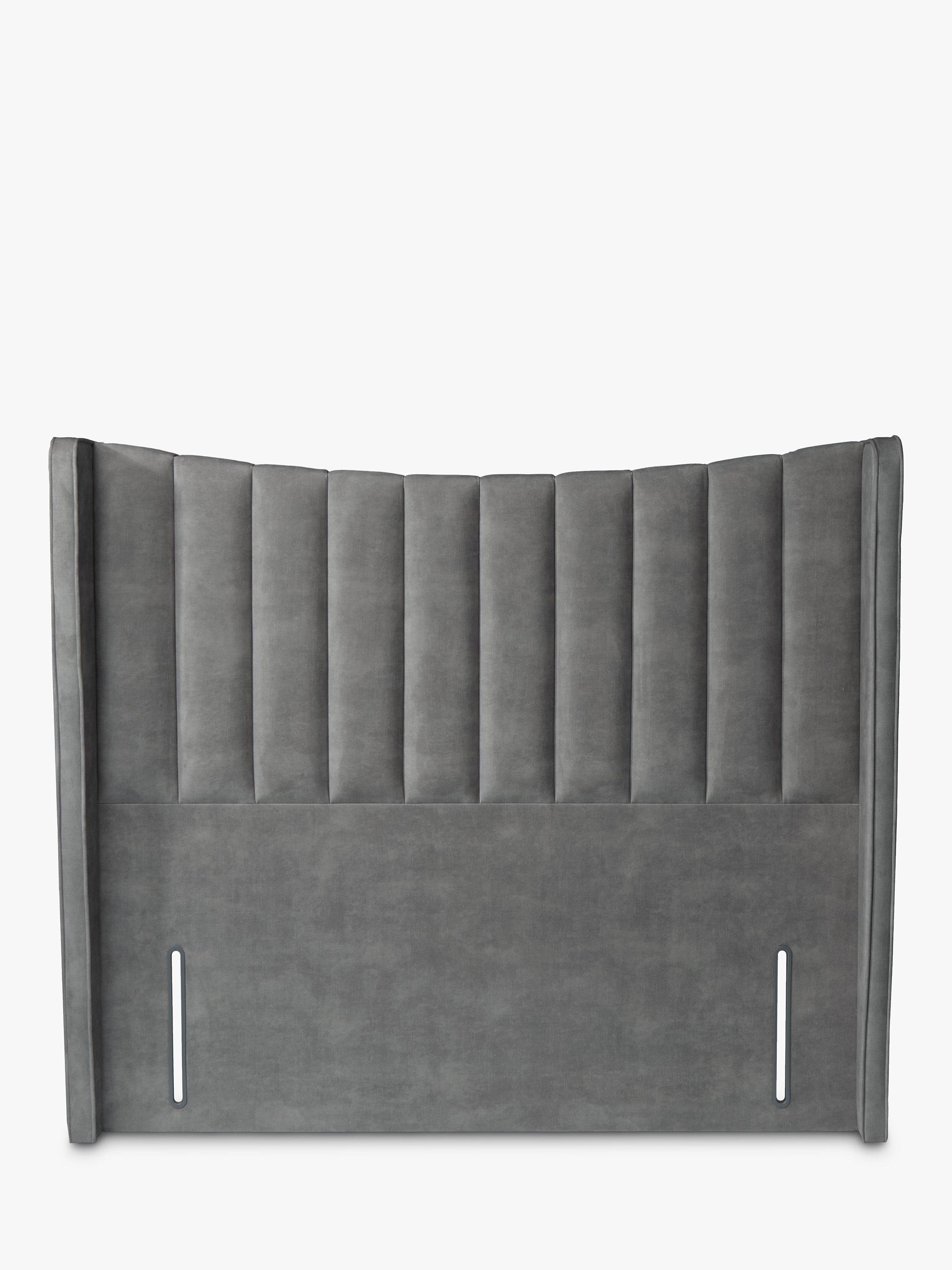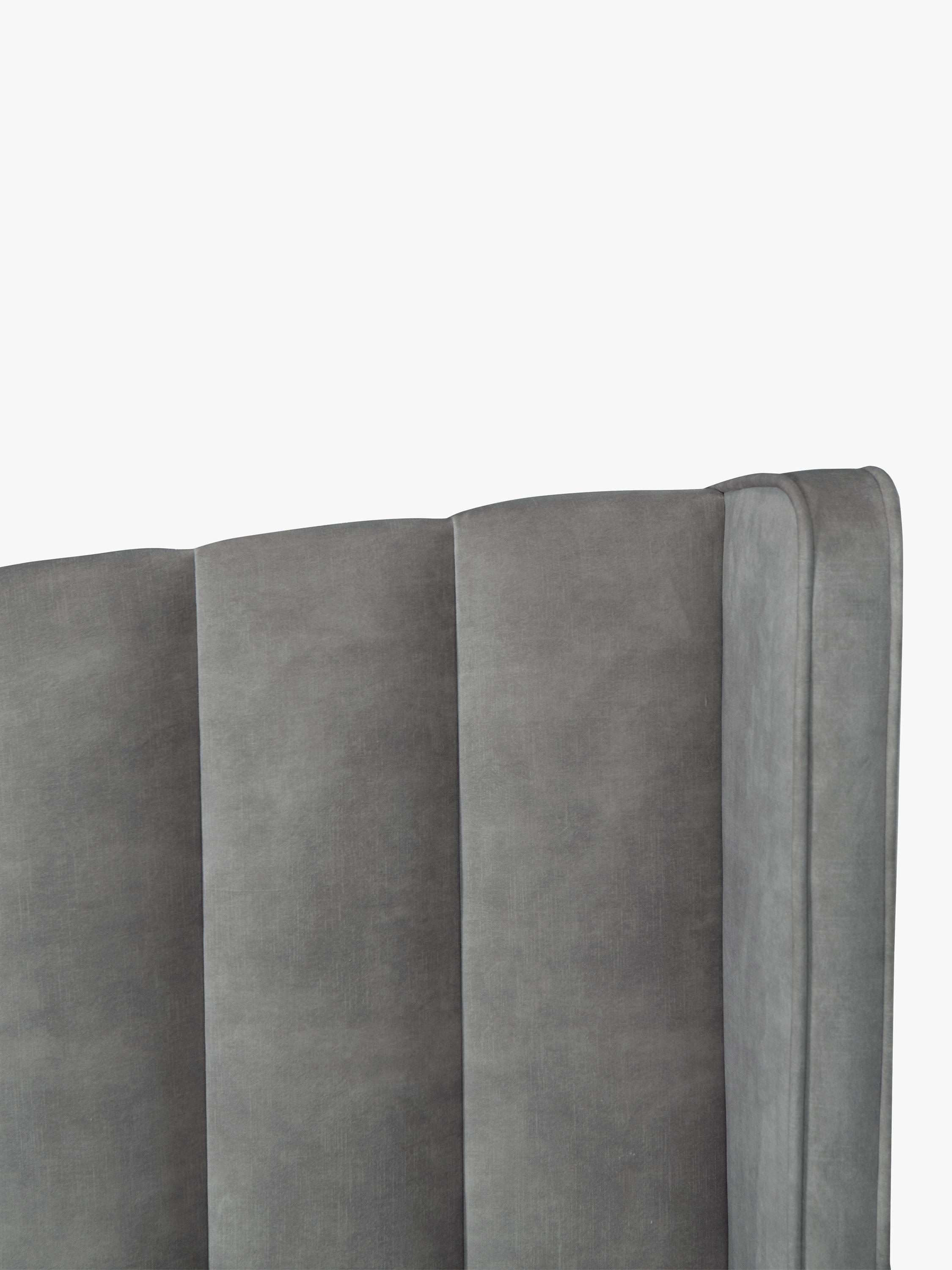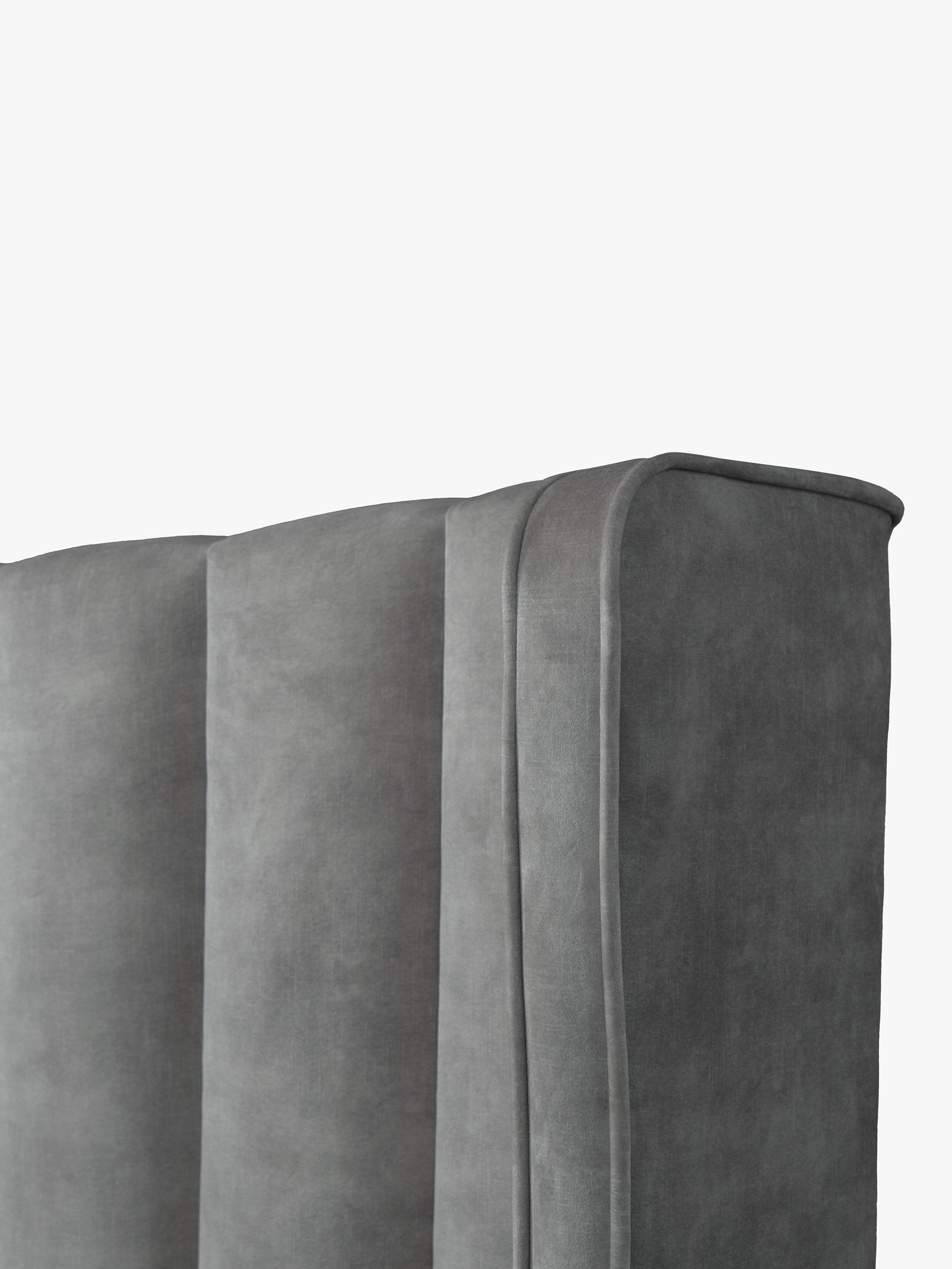 Upholstered in velvet, this striking panelled headboard with winged sides and a slightly curved profile will create a soft, yet regal style in your bedroom. It's a full-depth, freestanding fitting with standard fixings on either side, so it's easy to slot into the back of your divan base.