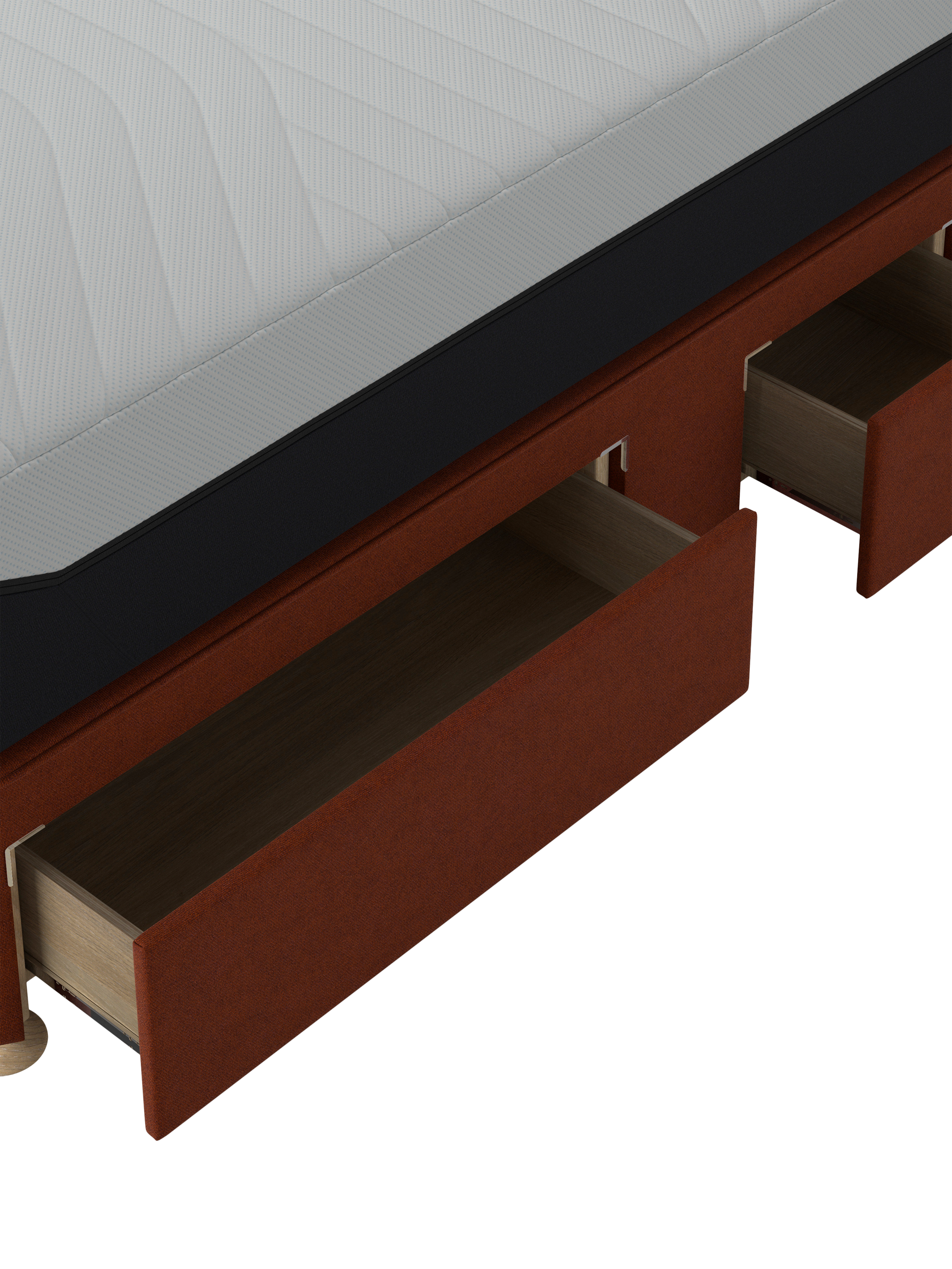 This base also features continental drawers if you need extra storage. Two are narrow on either side of the frame to accommodate space for your bedside table, and two are wider, so you have a practical storage solution for lightweight items. High-quality steel tubing and dovetail joint construction on the drawers ensures the bed frame is reliably robust and it’s available in a range of fabrics and colours. You can also choose from four TEMPUR® headboards to complete the look.