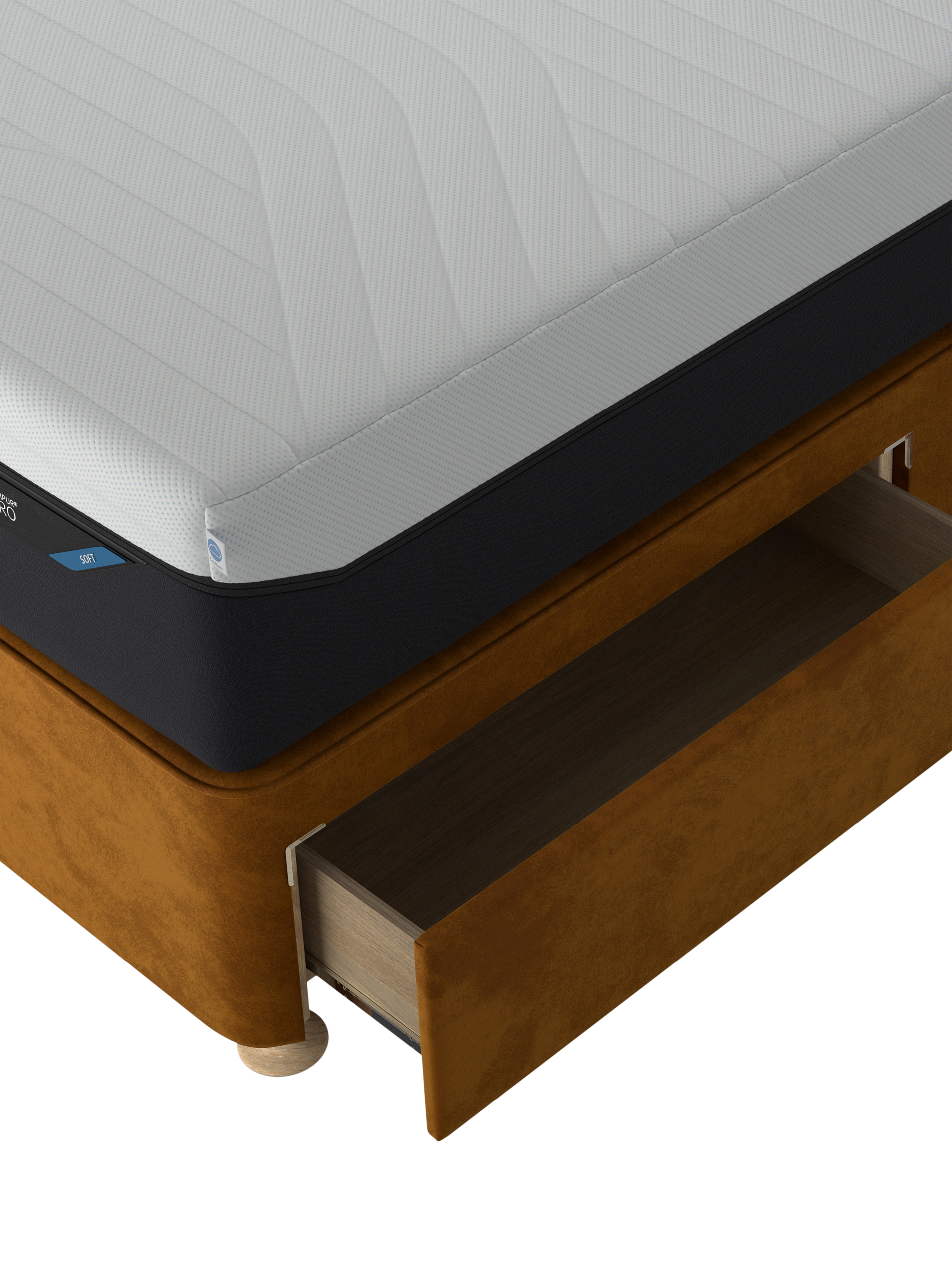 This Suffolk Continental divan base from TEMPUR® is designed with two left-hand facing drawers on one side of the base, providing a practical storage space for lightweight items. It's a non-sprung base for your mattress and it's available in a range of colours and fabrics to suit every bedroom.