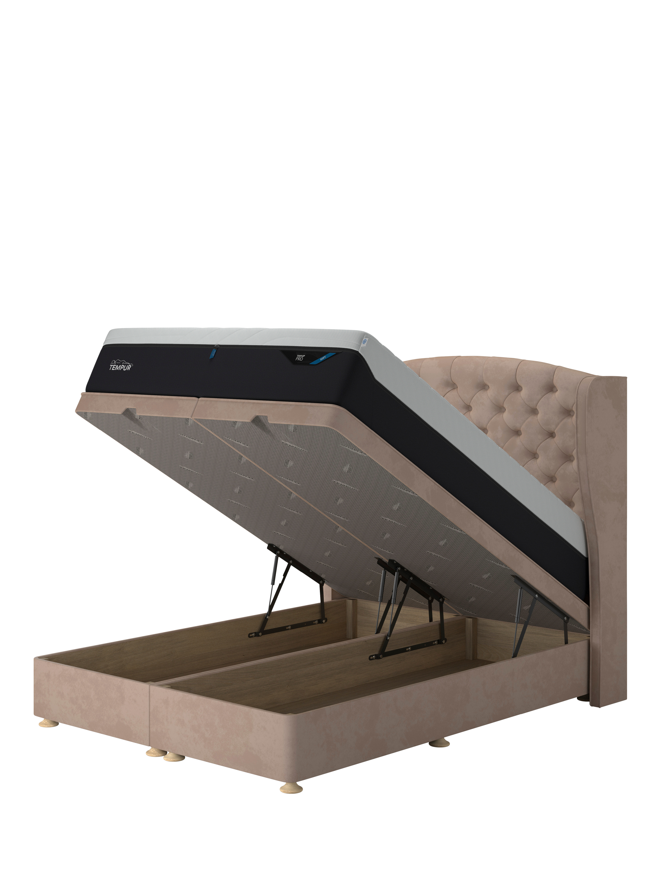A TEMPUR® Suffolk Ottoman Bed is great for compact living and storage. Upholstered in a selection of fabrics, convenient slot handles are cut into the foot end to make access easy. Wide-opening ottoman platform supported by 4 pistons to ensure comfortable lifting and easy access to stored items inside. TEMPUR(R) Suffolk floorstanding headboards also available in matching fabrics to truly personalise your bed.