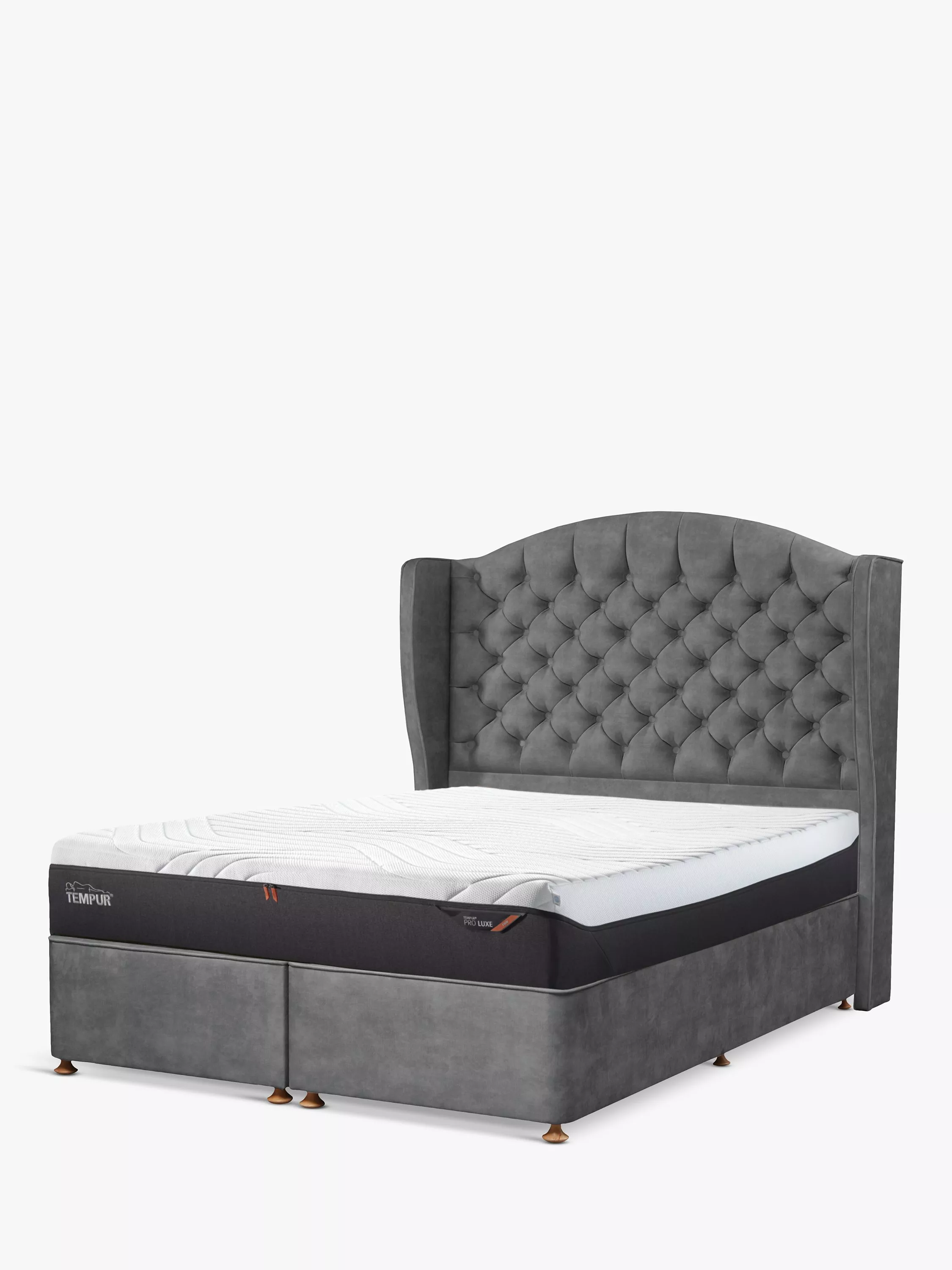 The opulent Woodbridge full-depth headboard from TEMPUR® has a winged profile, deep button upholstery and a distinctive arched top. With standard fixings on either side, this freestanding fitting will attach easily to the back of your divan base.
