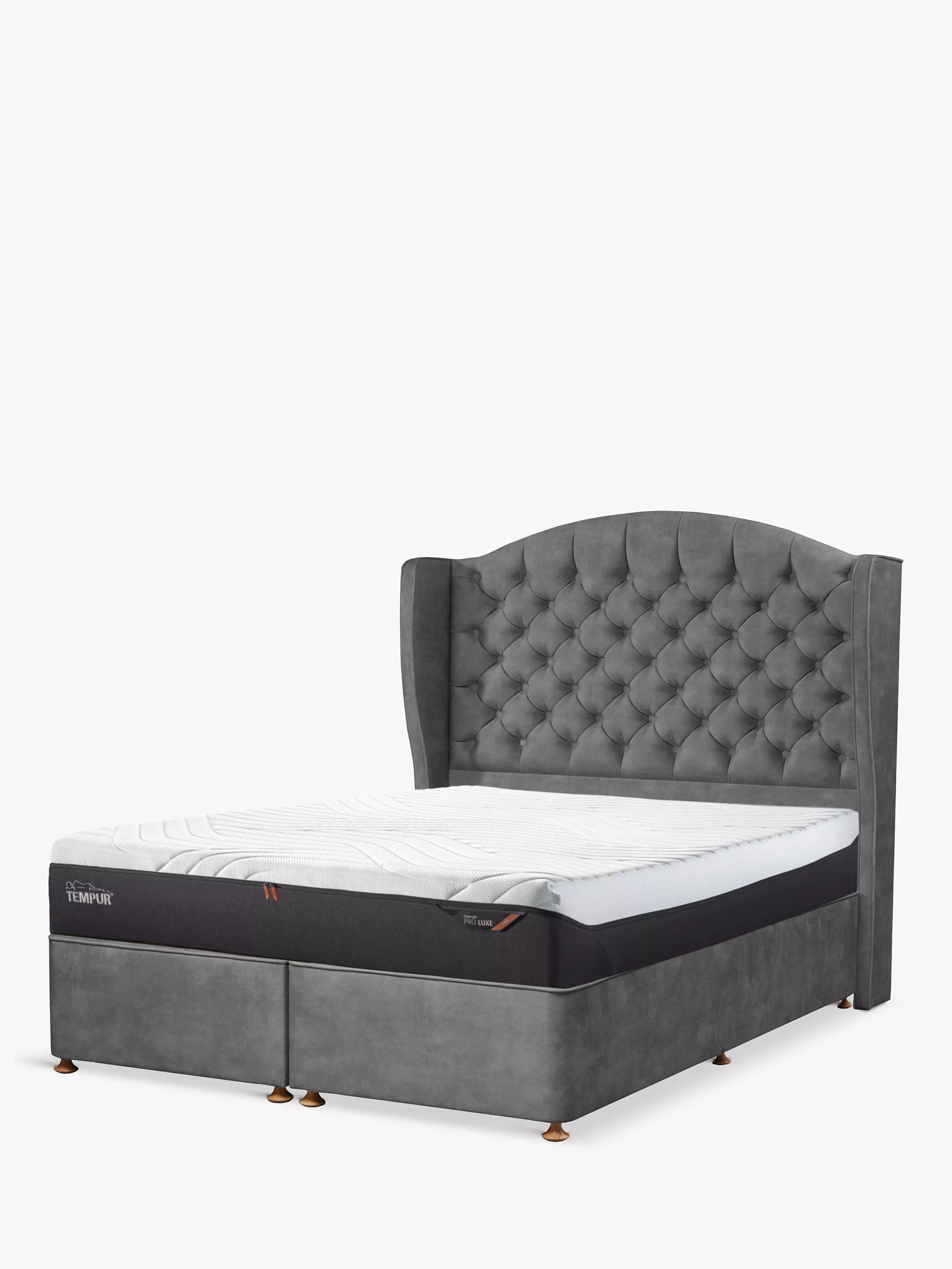 The opulent Woodbridge full-depth headboard from TEMPUR® has a winged profile, deep button upholstery and a distinctive arched top. With standard fixings on either side, this freestanding fitting will attach easily to the back of your divan base.