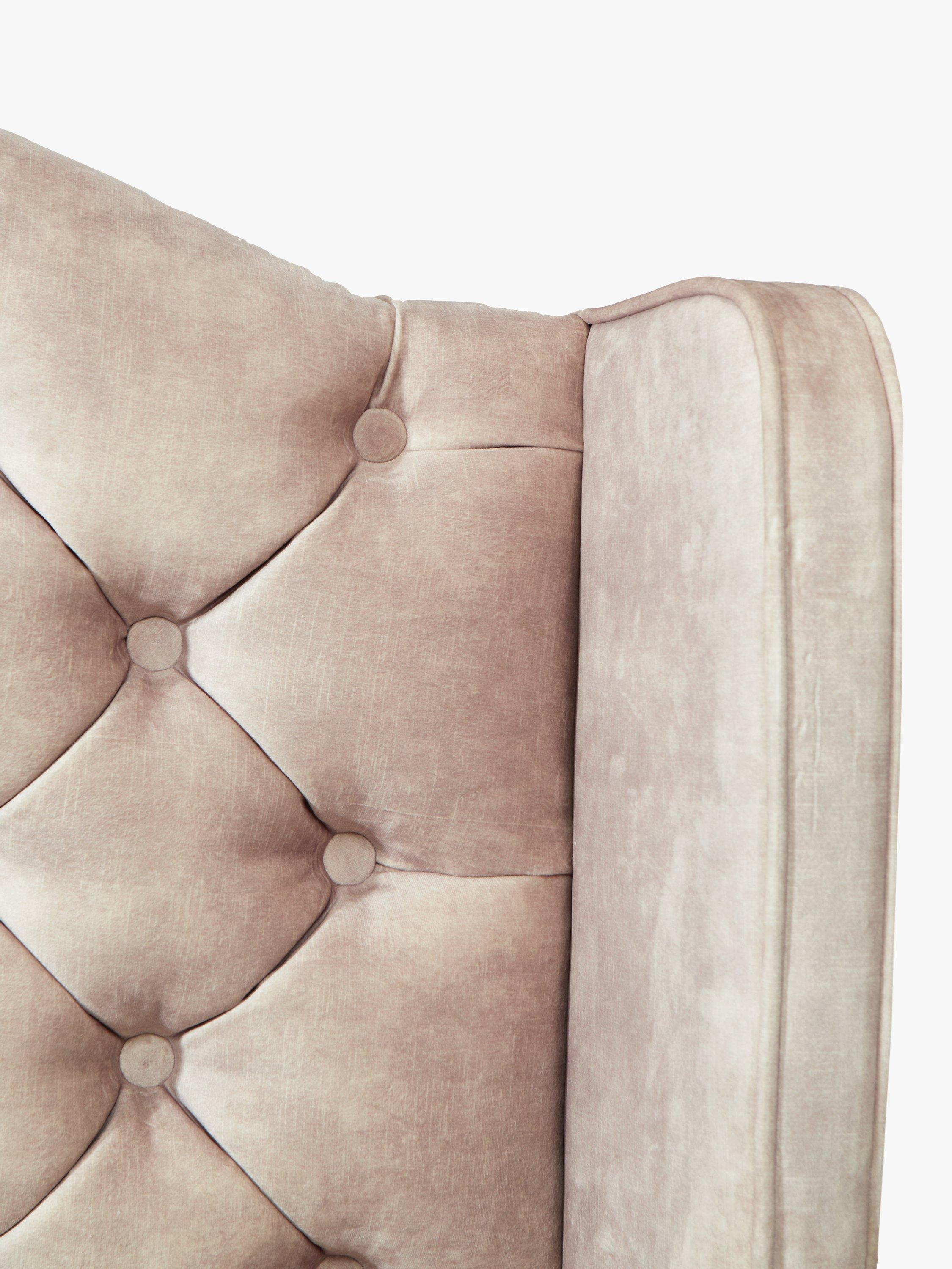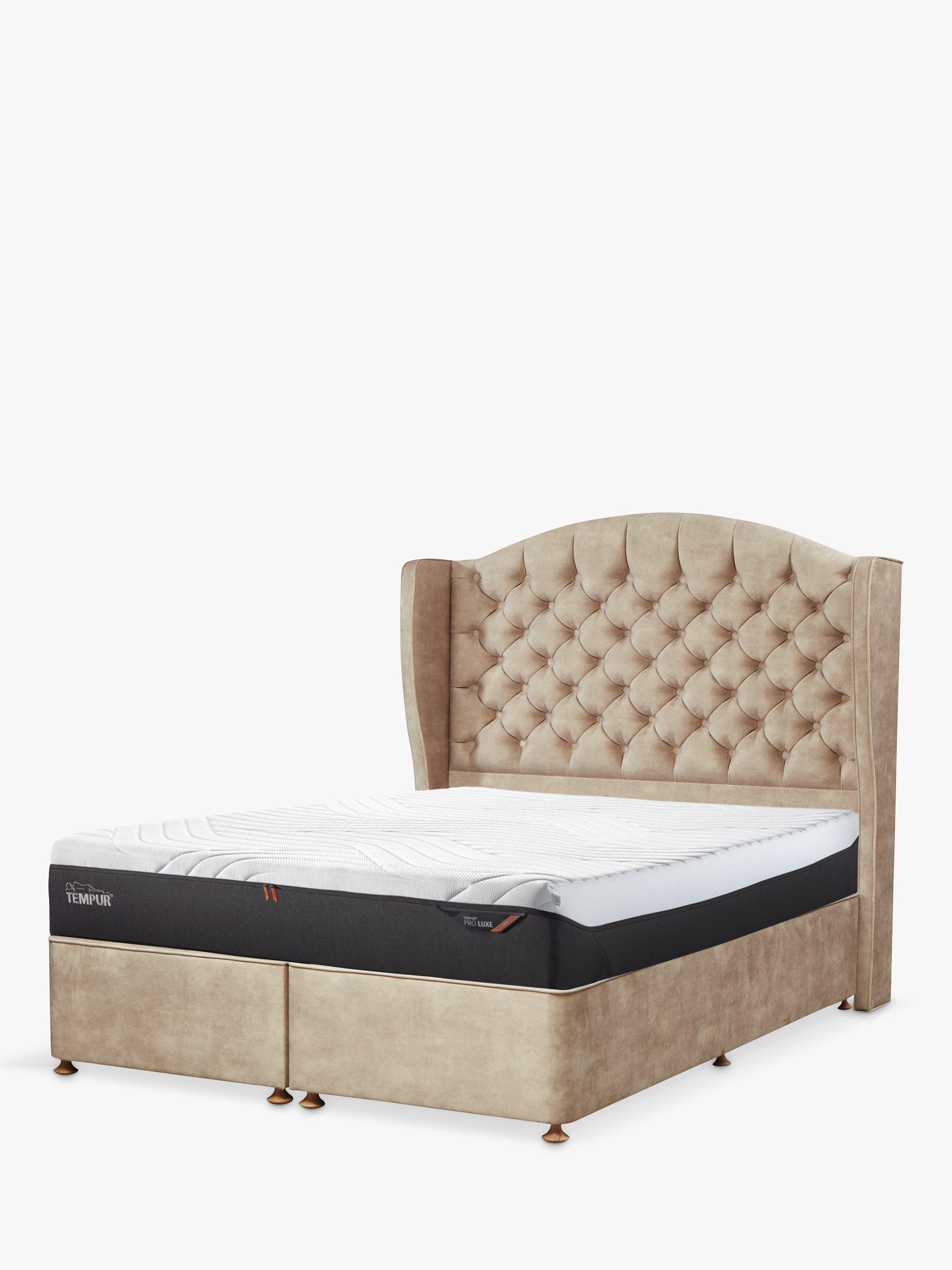 The opulent Woodbridge full-depth headboard from TEMPUR® has a winged profile, deep button upholstery and a distinctive arched top. With standard fixings on either side, this freestanding fitting will attach easily to the back of your divan base.