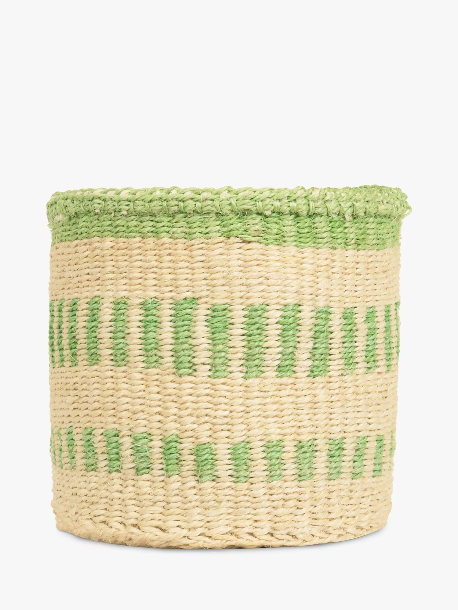 Designed by The Basket Room and handwoven in Kenya by skilled craftswomen, this medium size green stripe and natural basket is the perfect ethical storage solution. Use it as a fabulous indoor planter, or to tidy away everything from toiletries and toys to hats, gloves and scarves.