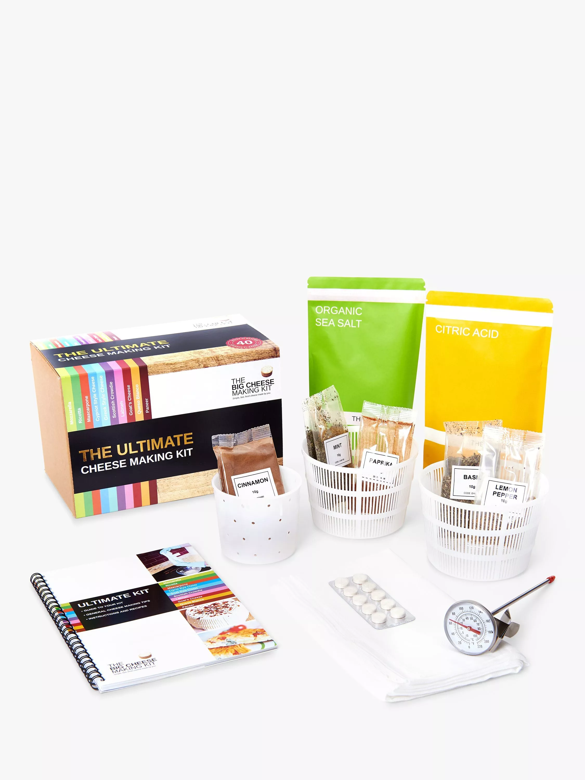 - The Ultimate Cheese Making Kit contents: Organic Sea Salt 200g, Anhydrous Citric Acid 200g, Strip of 10 Vegetarian Rennet Tablets (Enzymatic Microbial Coagulant), Dried Basil 10g, Ground Cinnamon 10g, Lemon Pepper 10g, Dried Mint 10g, Paprika 10g.
