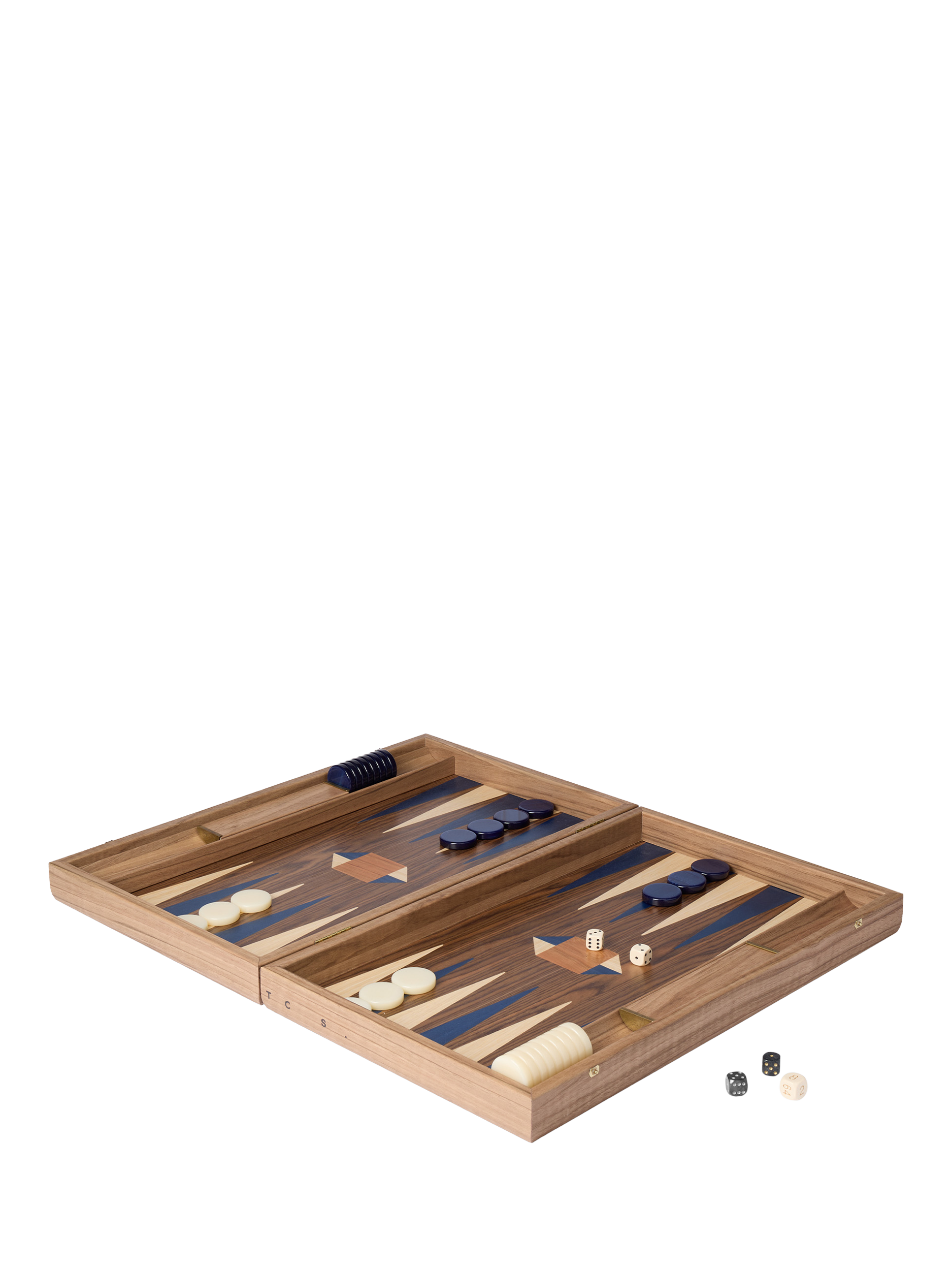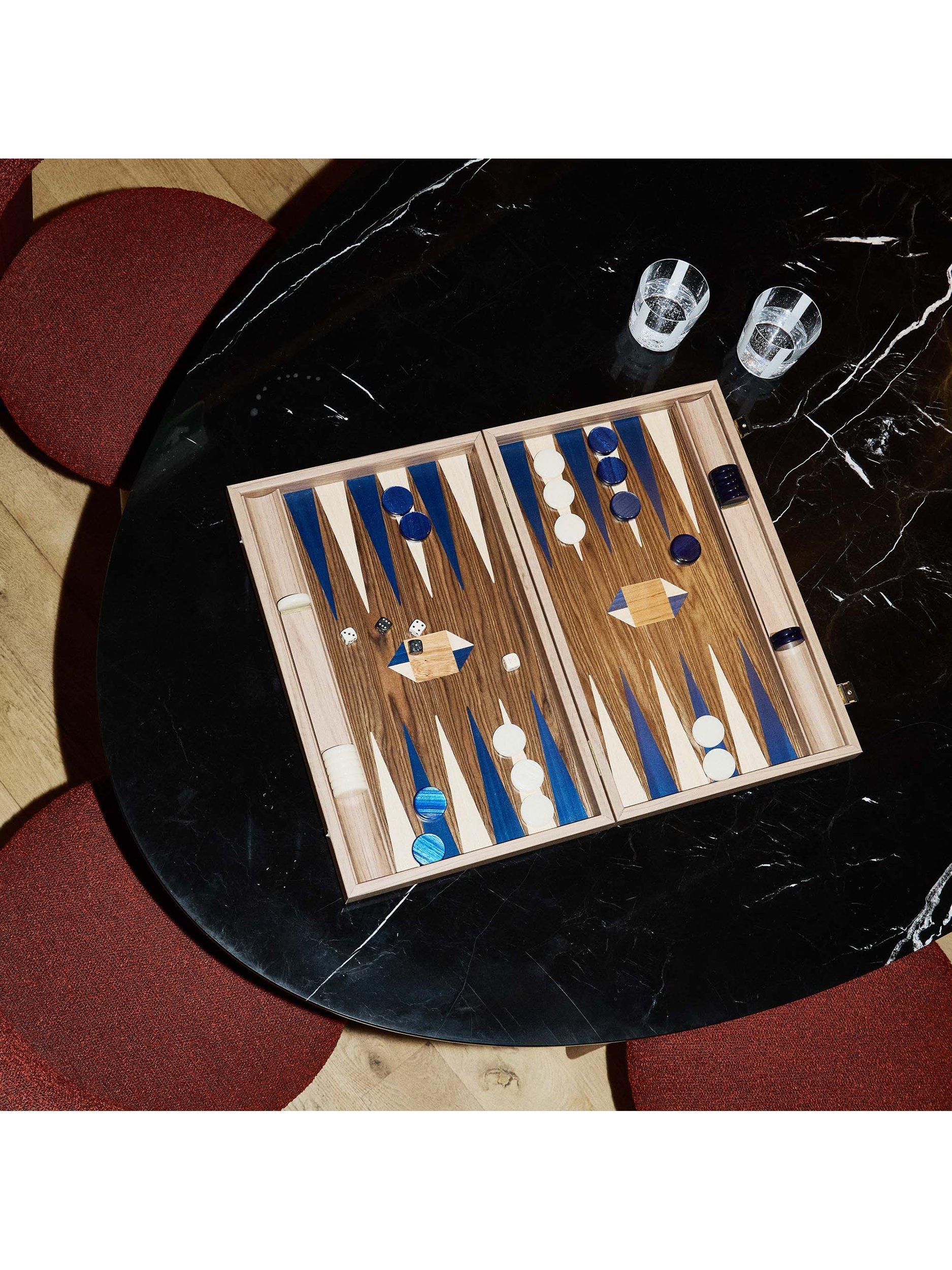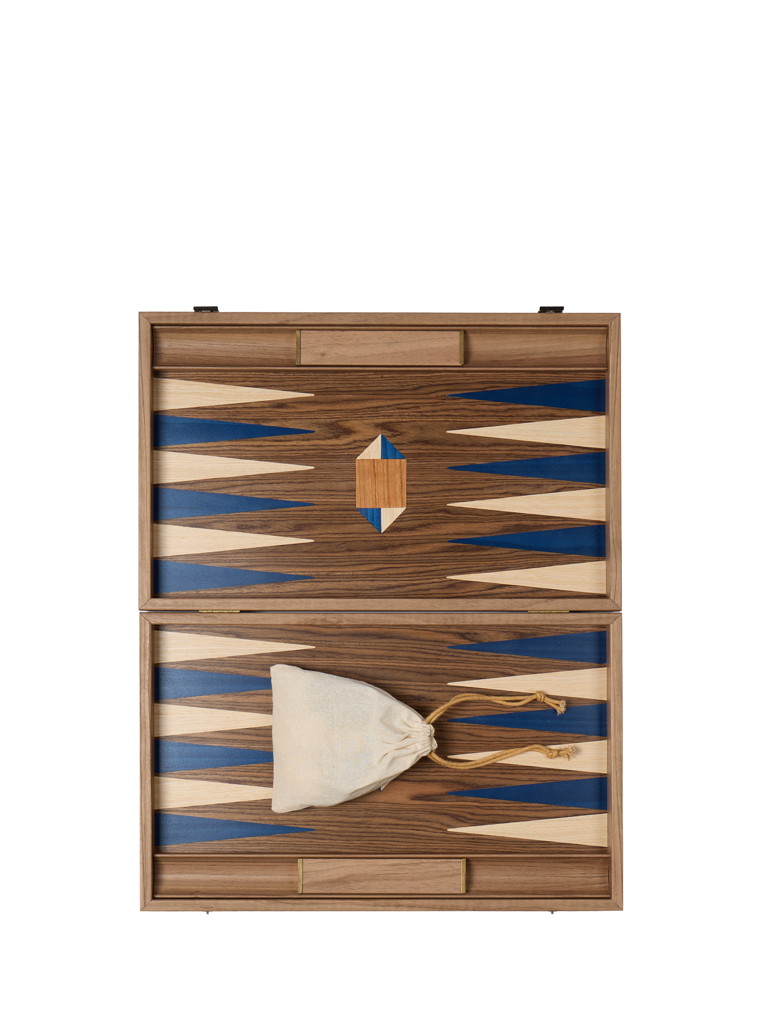 Inside, you'll find the iconic backgammon board refashioned in a modern blue and white on premium, hardwearing leatherette as well as five dice and thirty carved wooden counters.