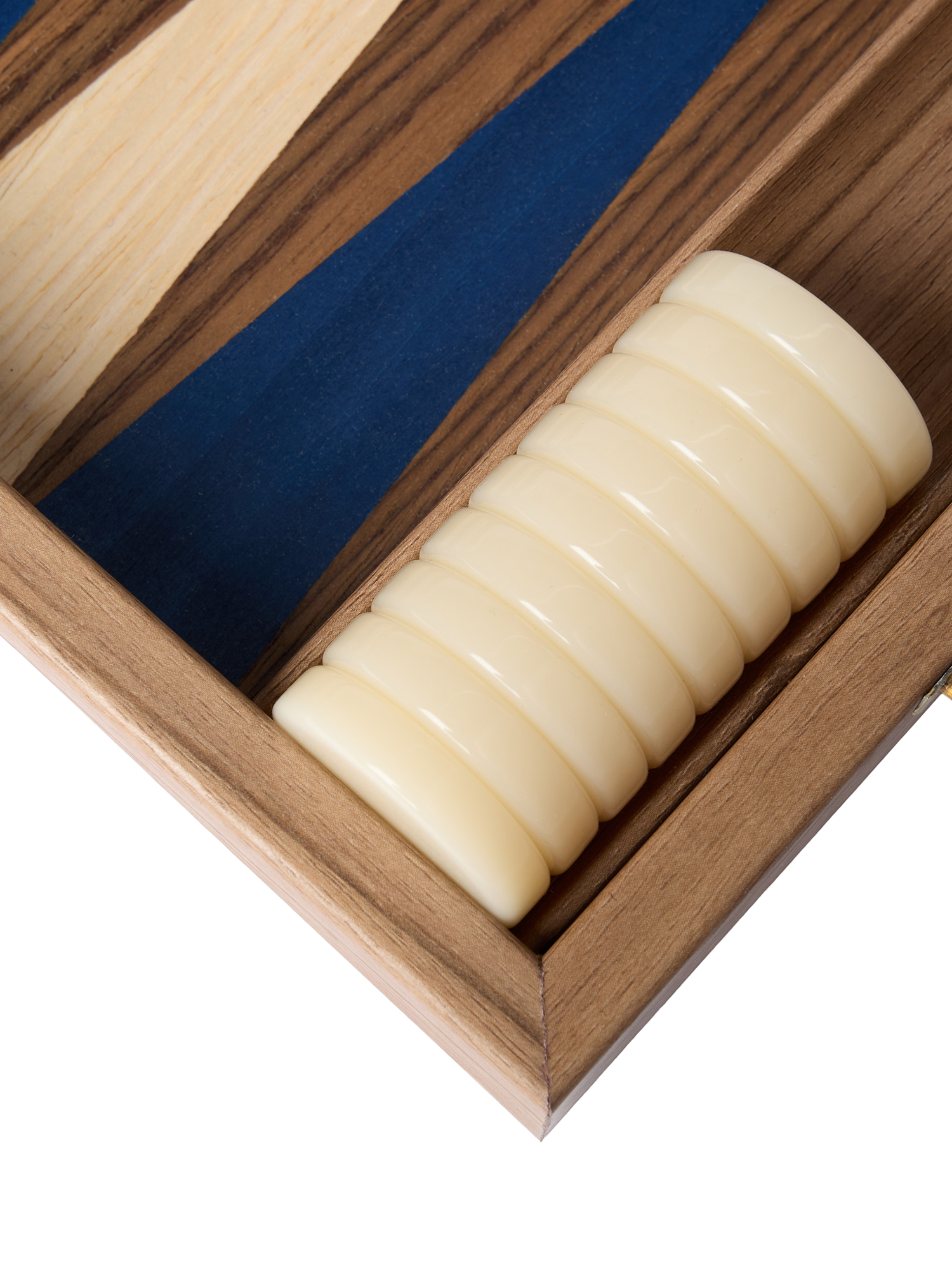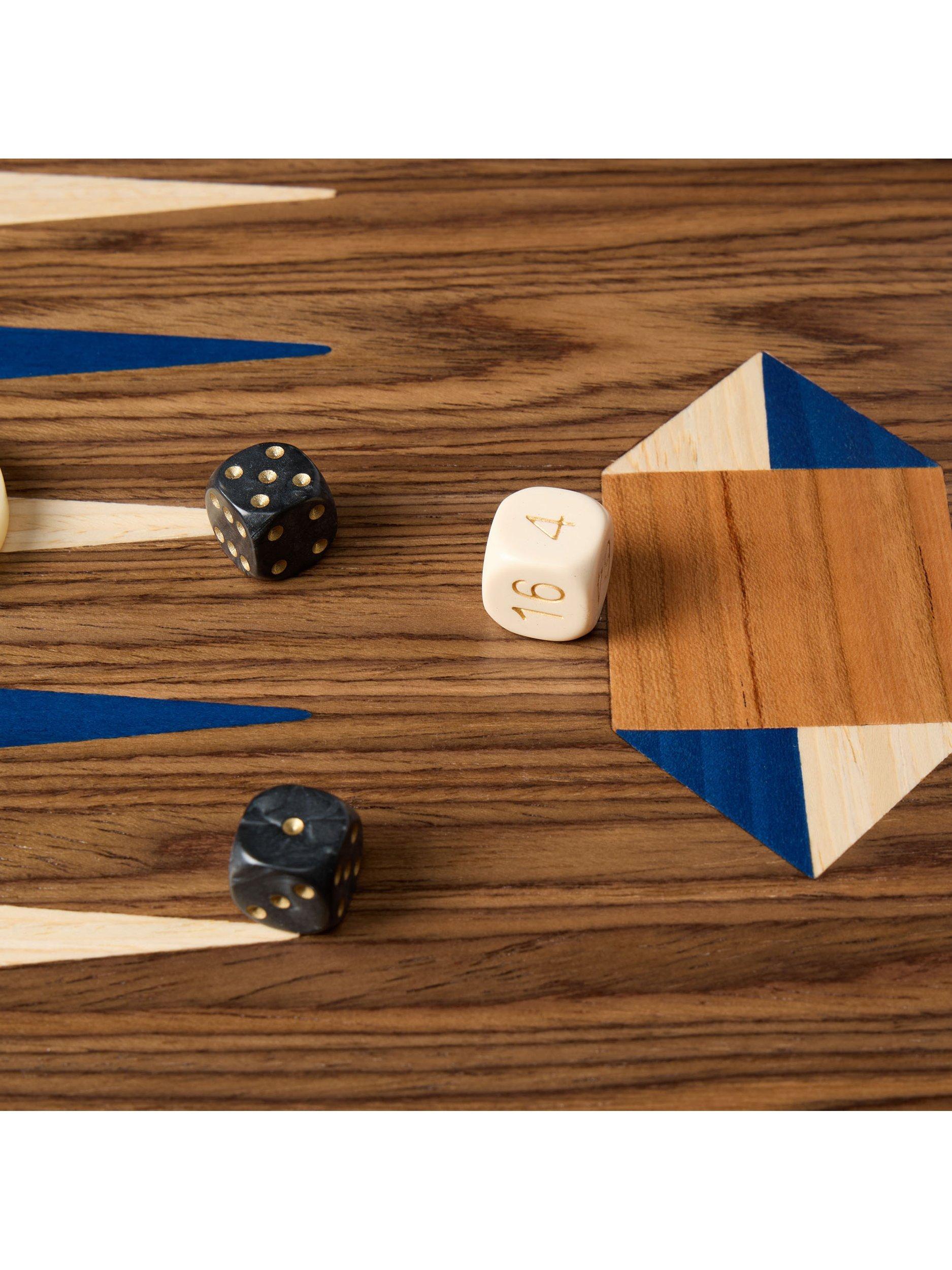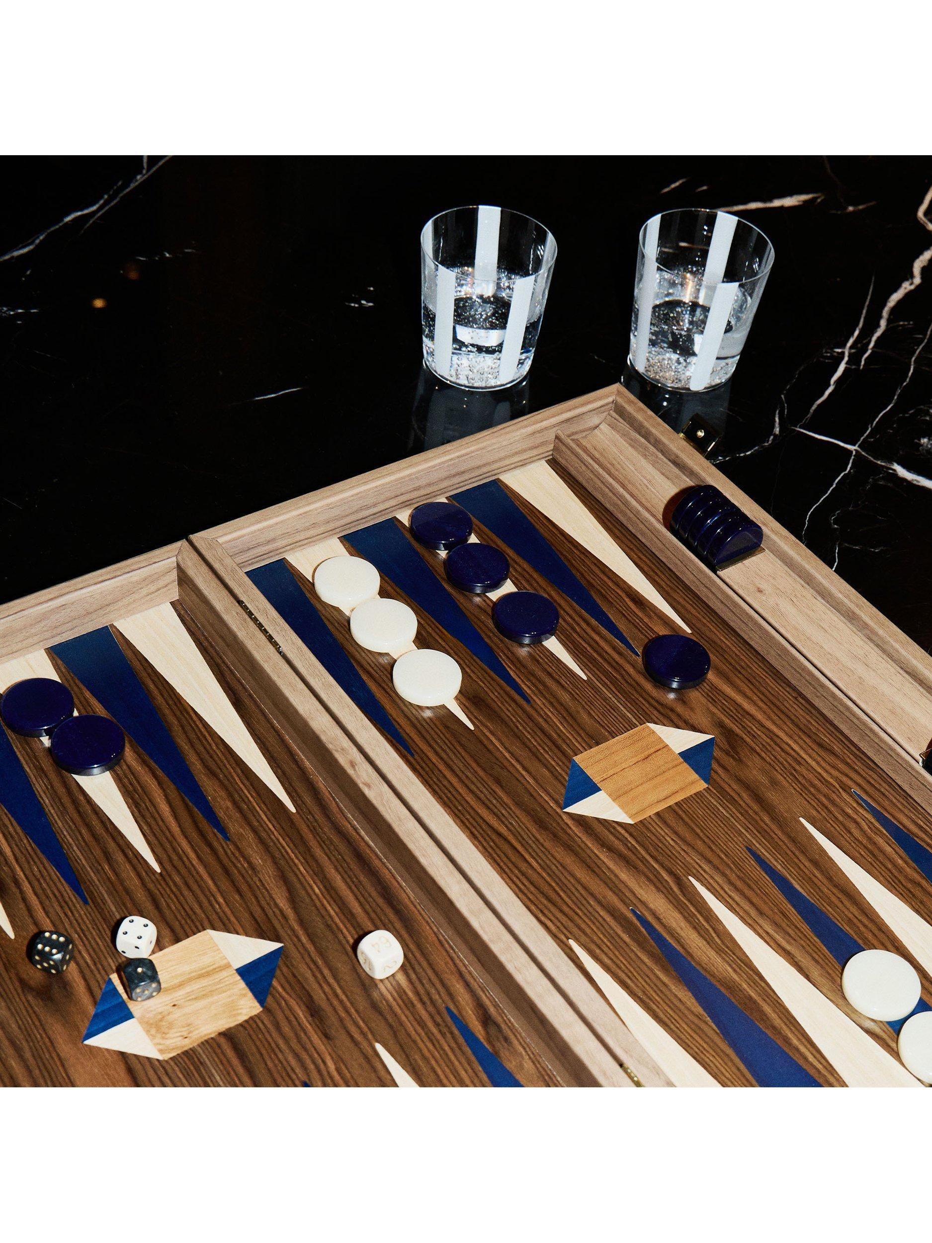 Inside, you'll find the iconic backgammon board refashioned in a modern blue and white on premium, hardwearing leatherette as well as five dice and thirty carved wooden counters.
