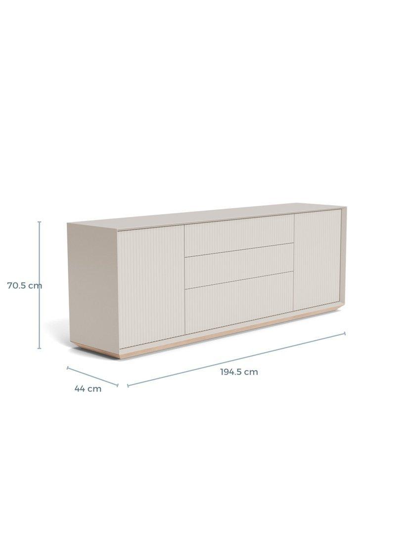 The sideboard offers a combination of concealed cupboards and drawers in two sizes, each operated with a push-close mechanism to preserve the carved façade. Its balanced proportions and generous internal storage make it a versatile addition to dining rooms, living spaces or hallways. This version features a stone finish, set on a solid hardwood plinth with matching timber interiors that reflect Evans's thoughtful approach to form and material.