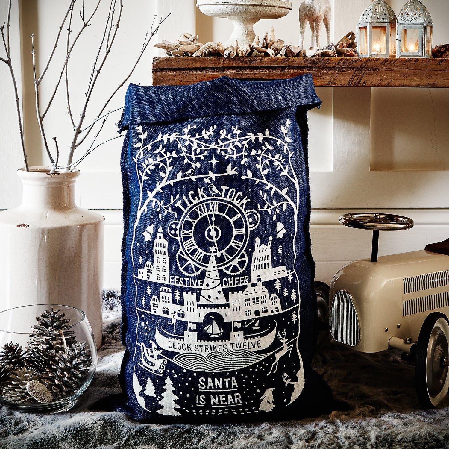 This charming Christmas sack features a large clock sitting on top of a Christmas tree in the centre of a town. Complete with the writing 'Tick Tock', 'Festive Cheer', 'Clock Strikes Twelve' and 'Santa is Near'.