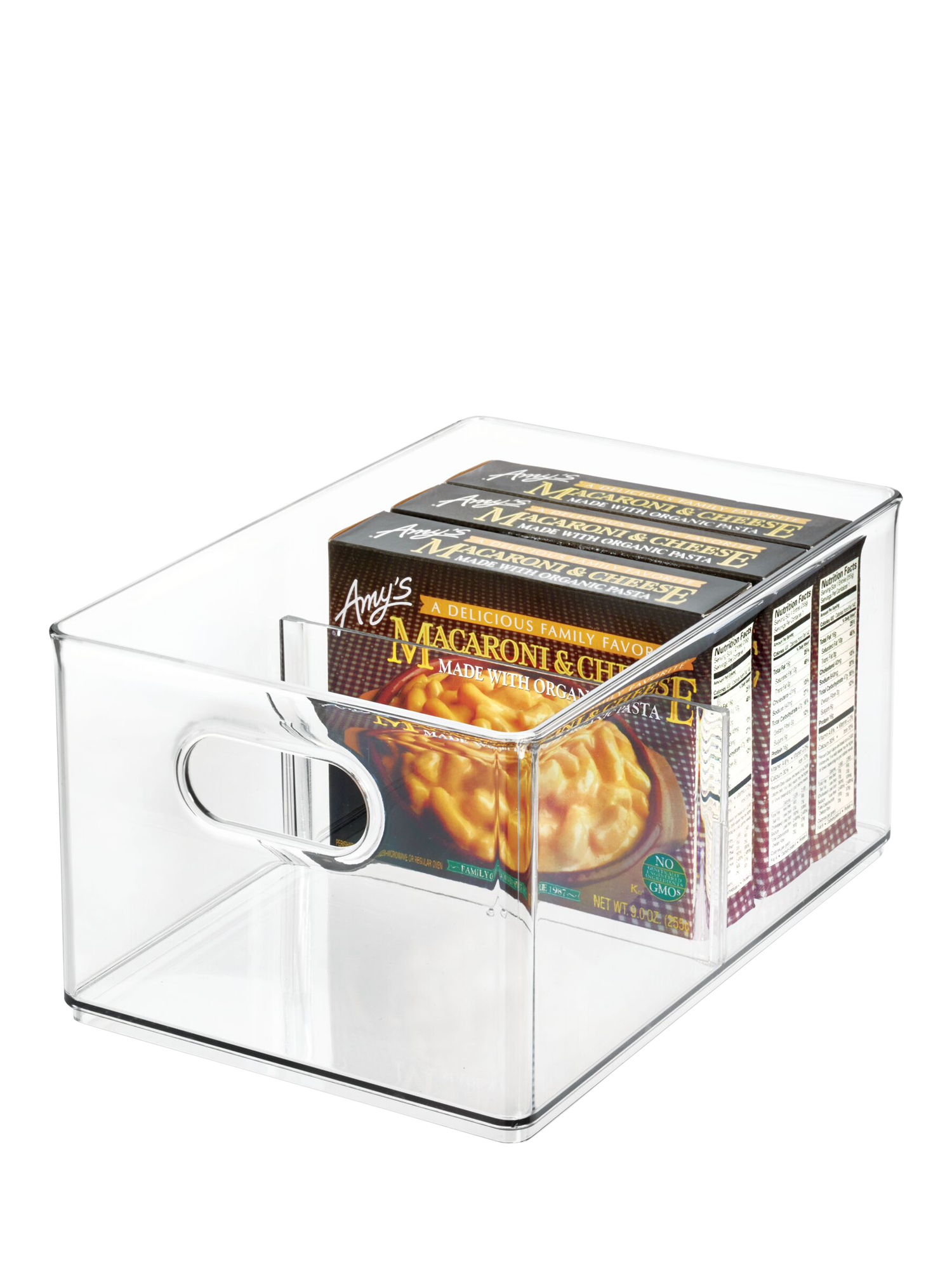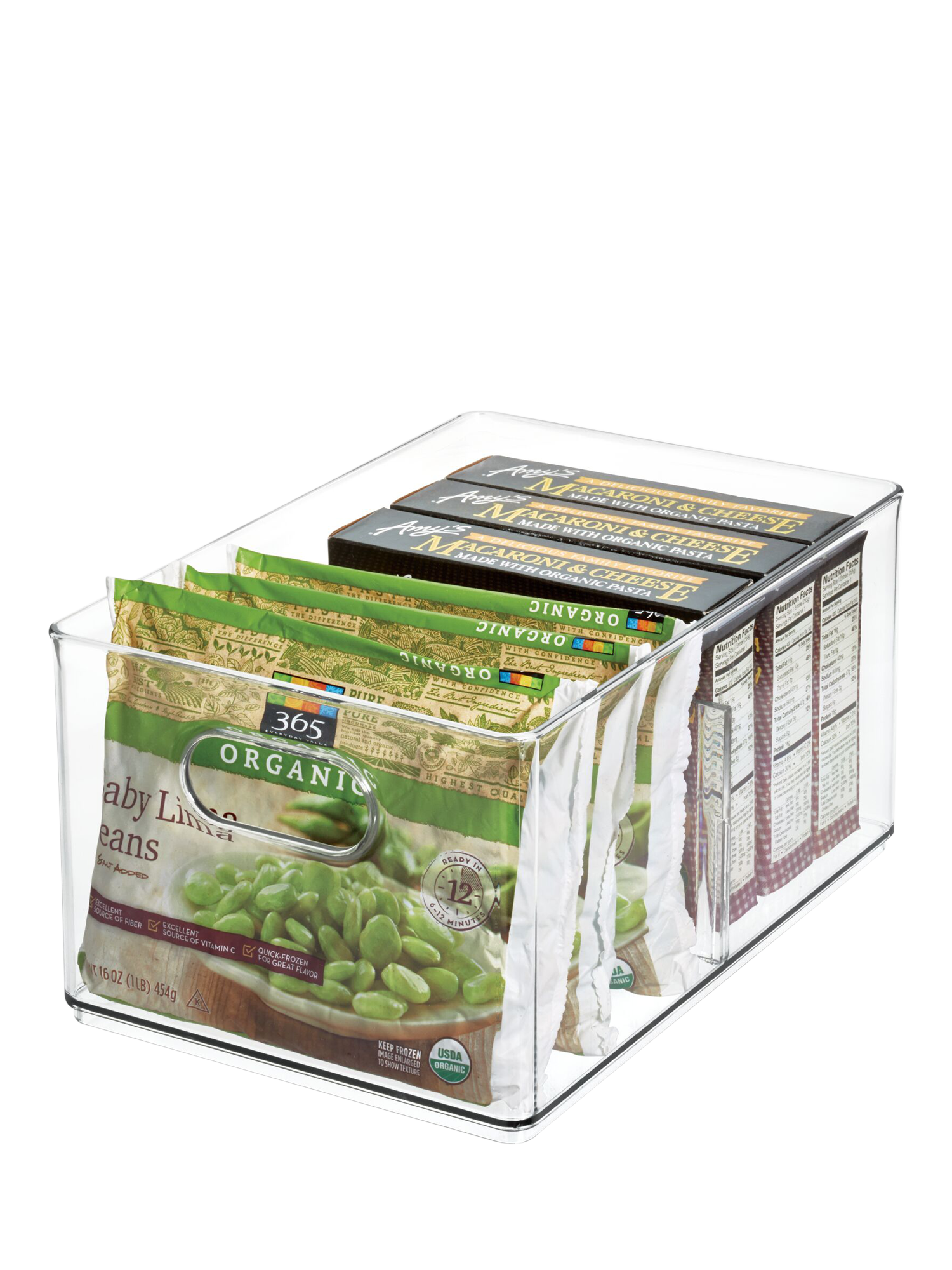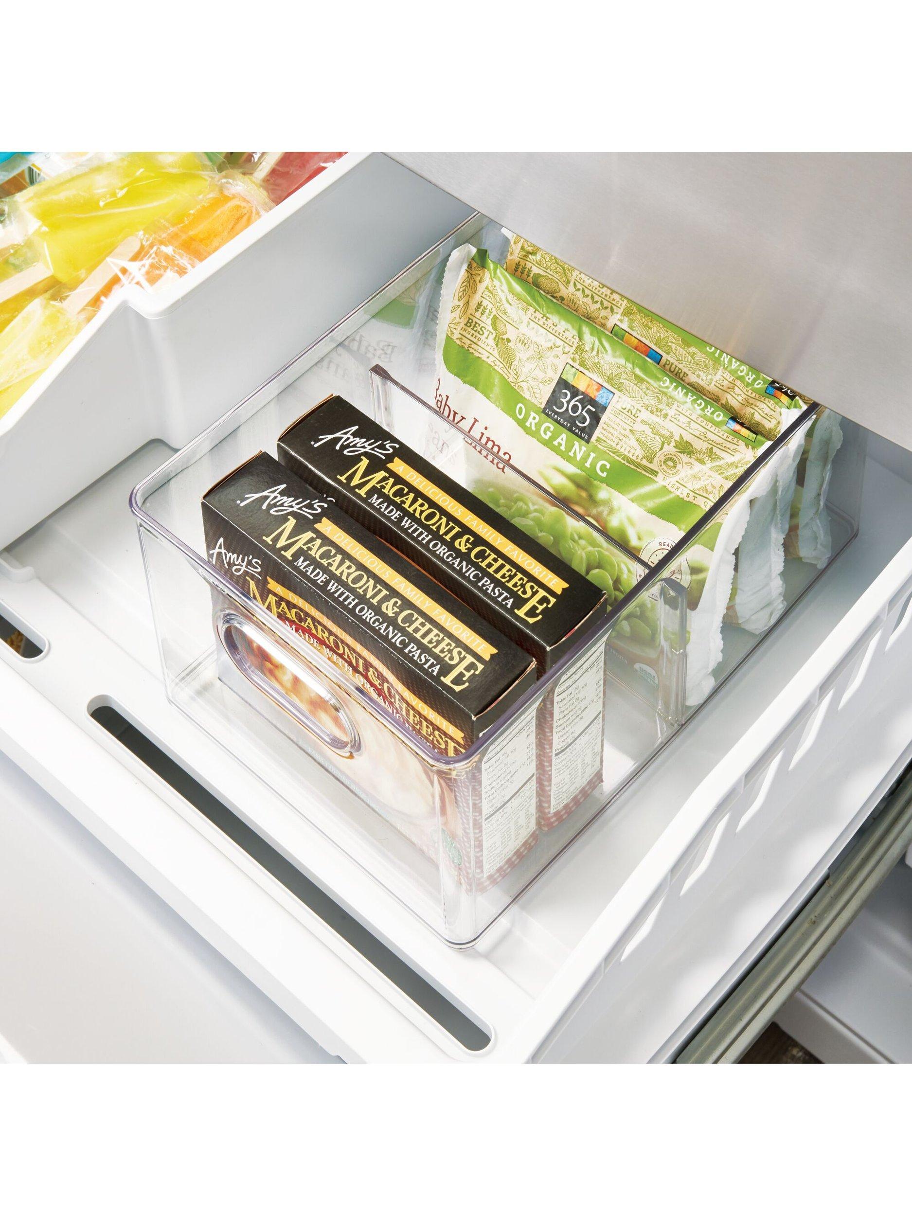 A removable divider lets you sort boxed frozen meals, steam pouches, bags of frozen vegetables, juices and more. Integrated handles make it easy to grab and go. Each bin is also extremely durable and stacks securely with other pieces from the range.
