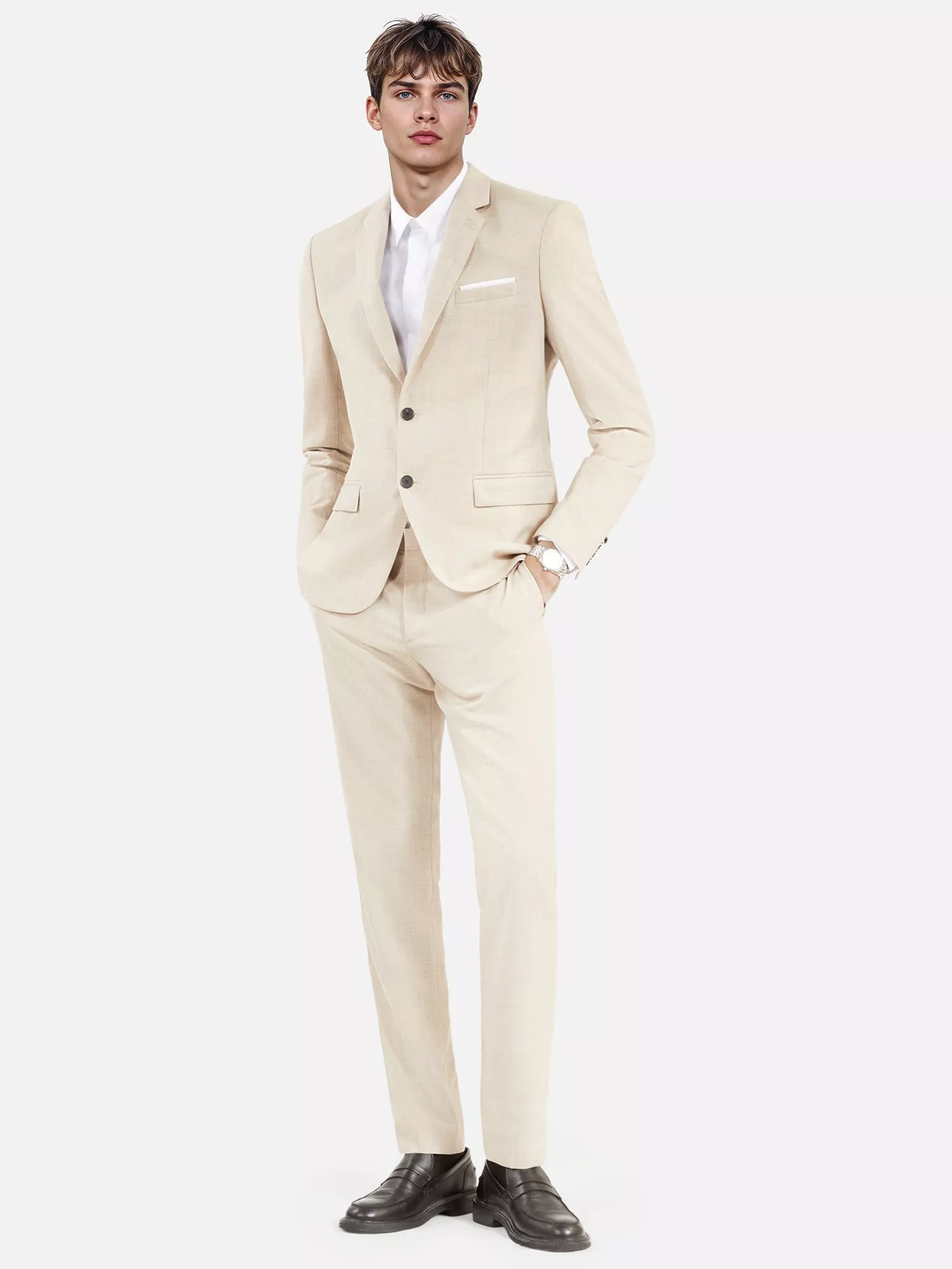 Straight cut, single-breasted wool suit jacket. Styled with double back slots and a small chest pocket.
